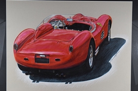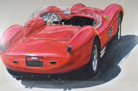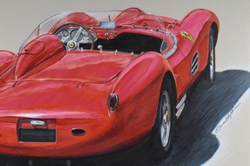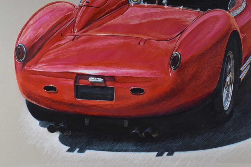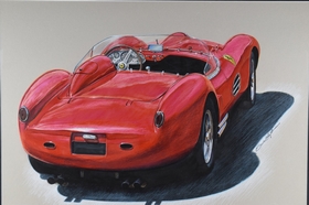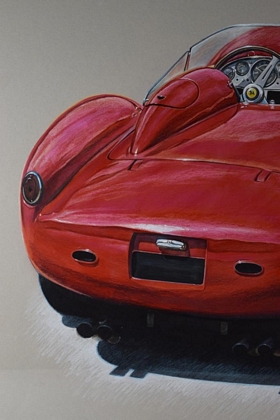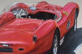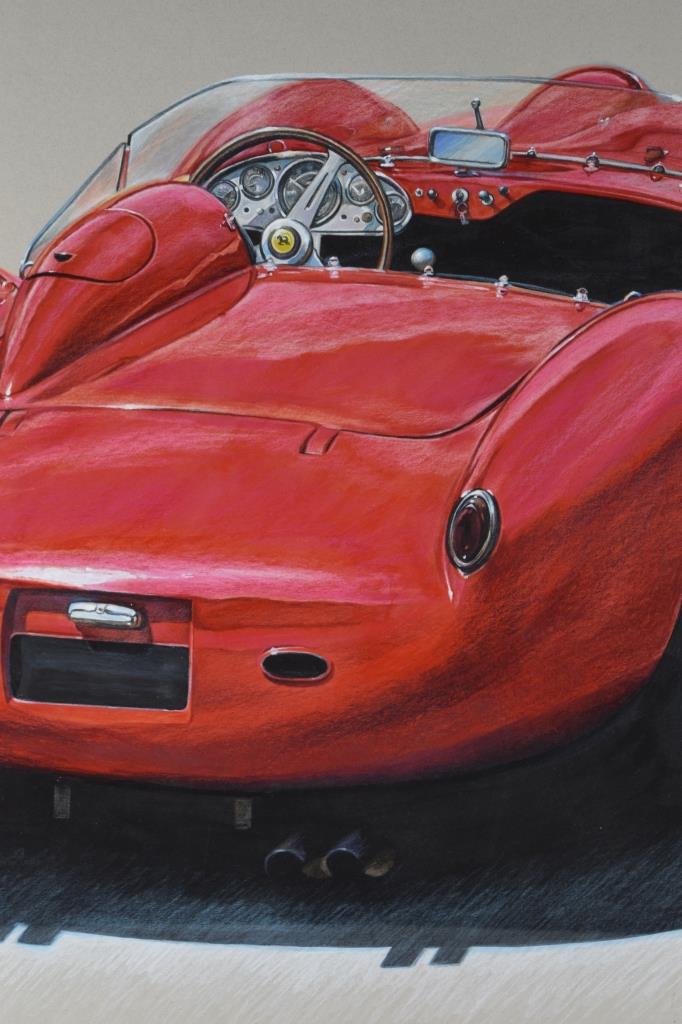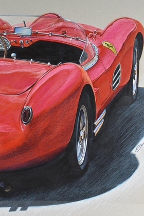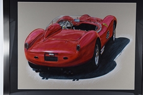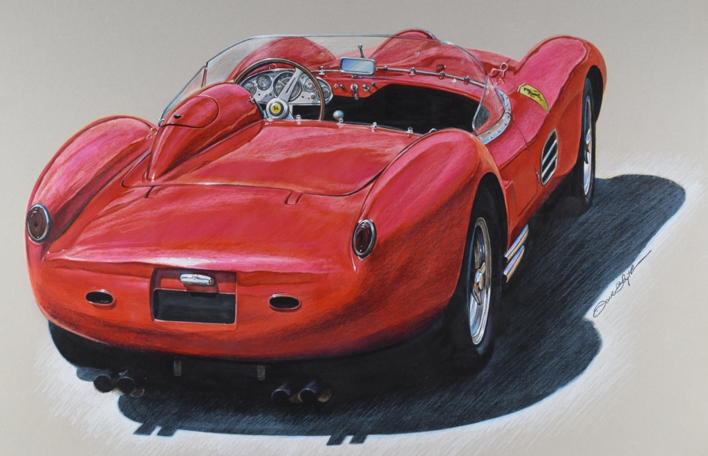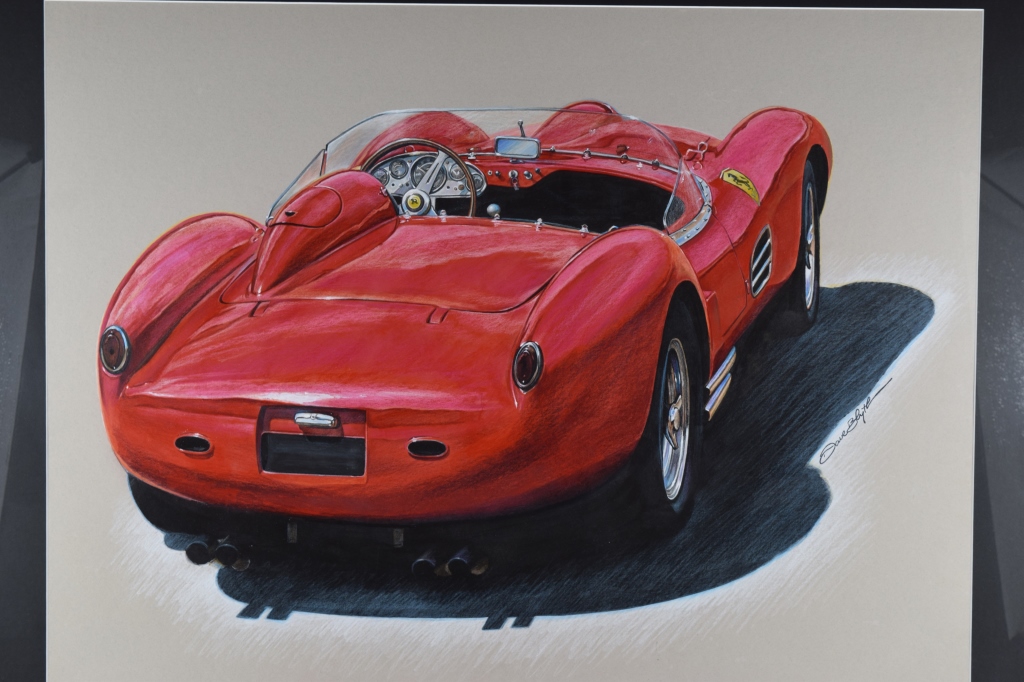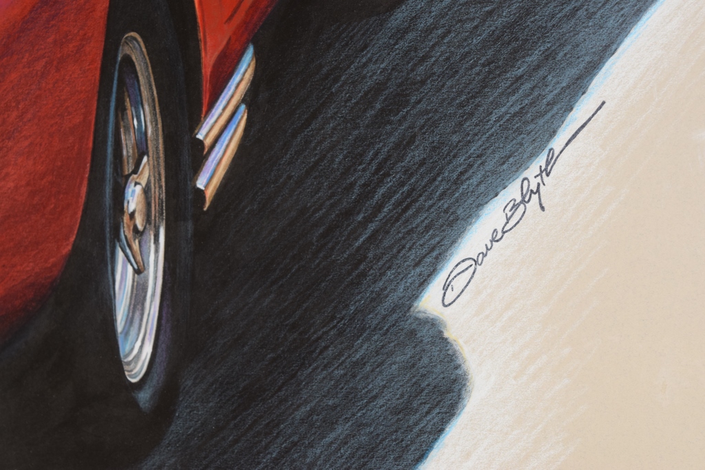 Signed mixed media photo realism depicting an old Ferrari. Dave Blyth became one of the world's best Ferrari artists and was commissioned Burt Reynolds, Miami Vice's Don Johnson, Rock star Chris Rea, and Formula One stars Nigel Mansell and Gerhard Berger. Source: http://www.speakers.co.nz/our-speakers/all-speakers/dave-blyth/ . Work measures 29" H x 39" W. Frame measures 39" H x 49" W.