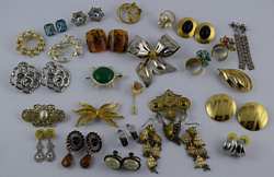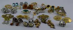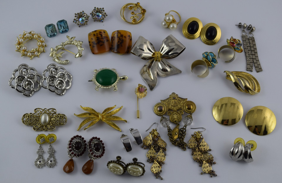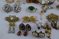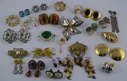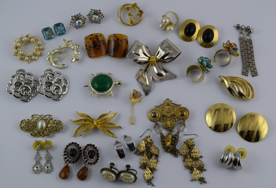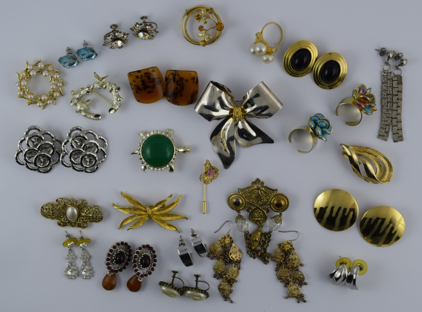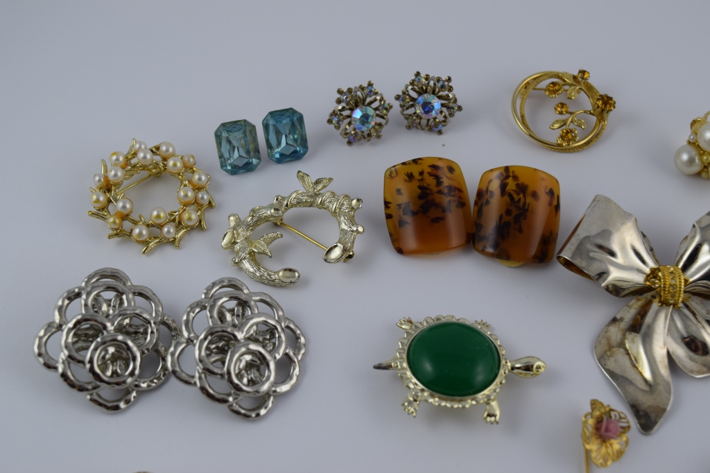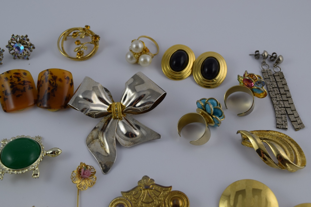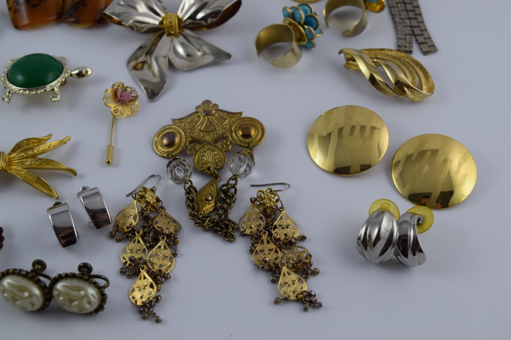 Gold and silver earrings, brooches, pins, rings, pearls, faux tortoise, pearls and more. Total weight 290g (10.3oz). U.S. SHIPPING $15 PLUS INSURANCE