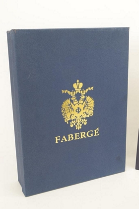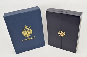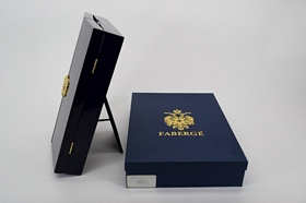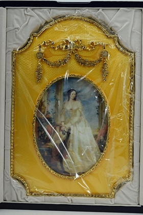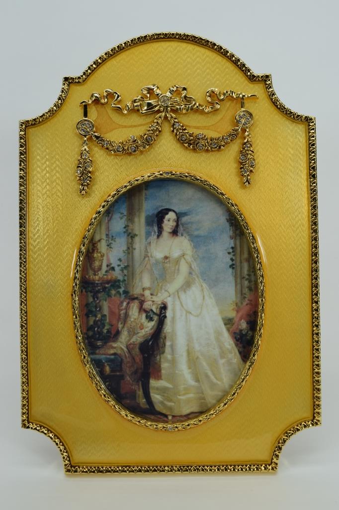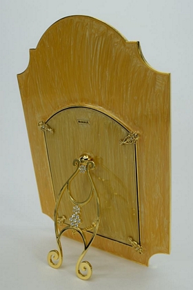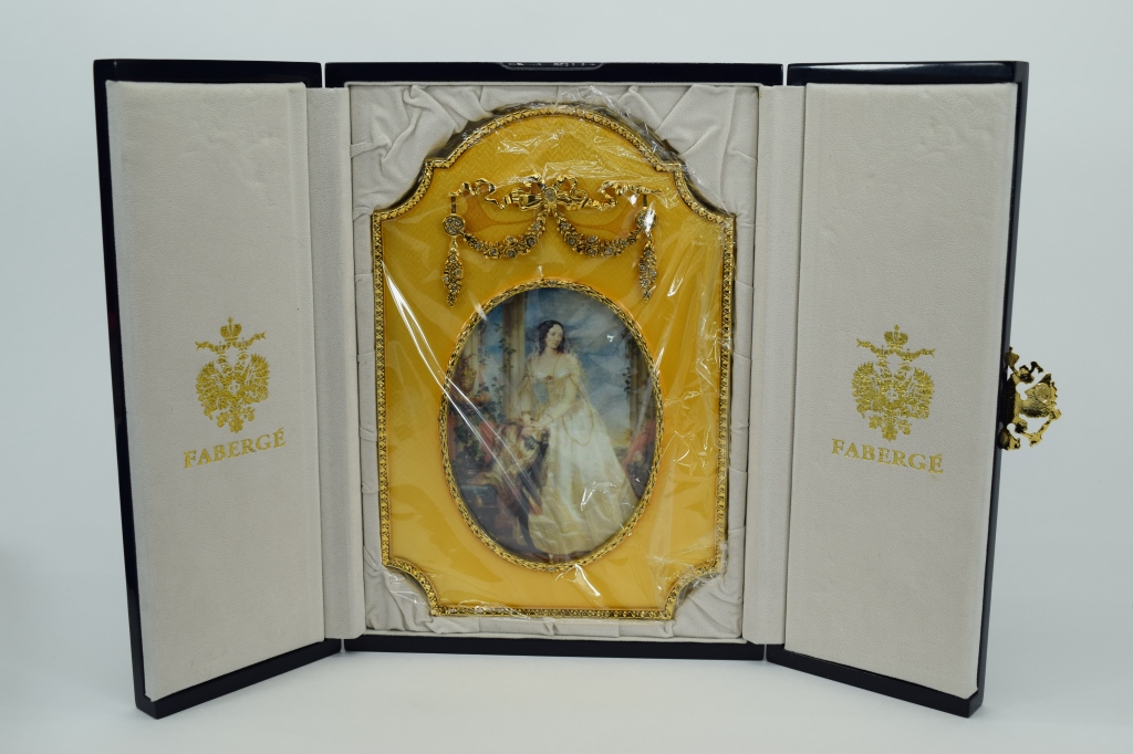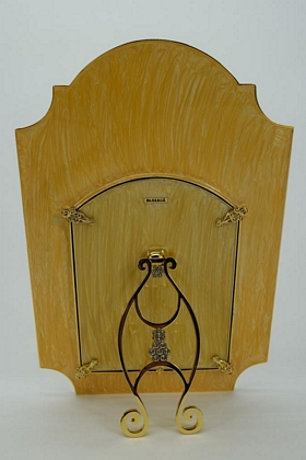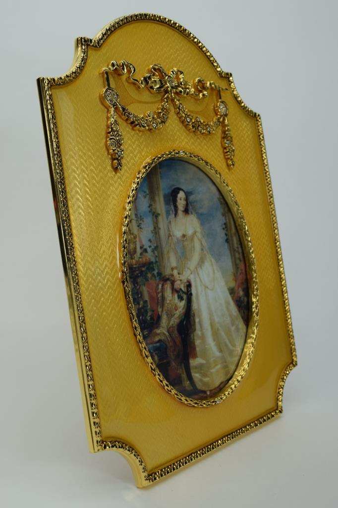 Oyster colored guilloche enamel face with Austrian crystal applique. Frame measures approximately 10" H x 7" W and comes in an exquisite lacquered wooden case with dual hinged doors, emblem mounted to center and custom fitted velvet interior. Measures 12' L x 8-1/2" W x 2-1/2" D. This case nests inside a final, the original blue cardboard box with gold emblem (box sides have come loose). Holds a photo that is approximately 6"H x 4-1/2"W. Some discoloration to top, between the hanging floral festoons and the streamers above..almost appears like stylized shadows. Still in original cellophane.