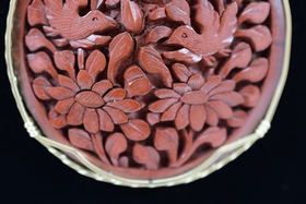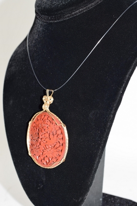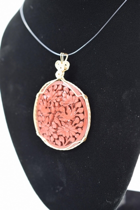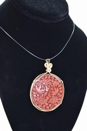 208 - CARVED CINNABAR FLORAL BIRD PENDANT