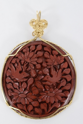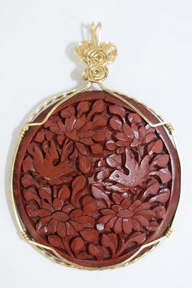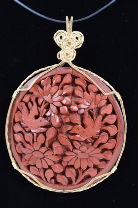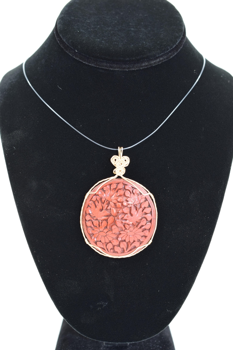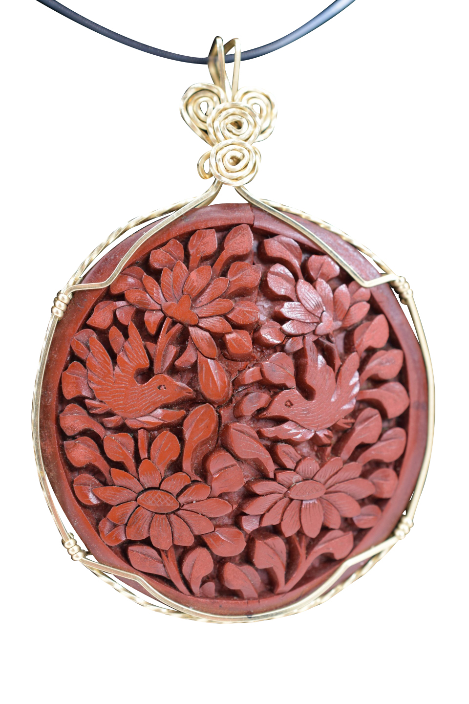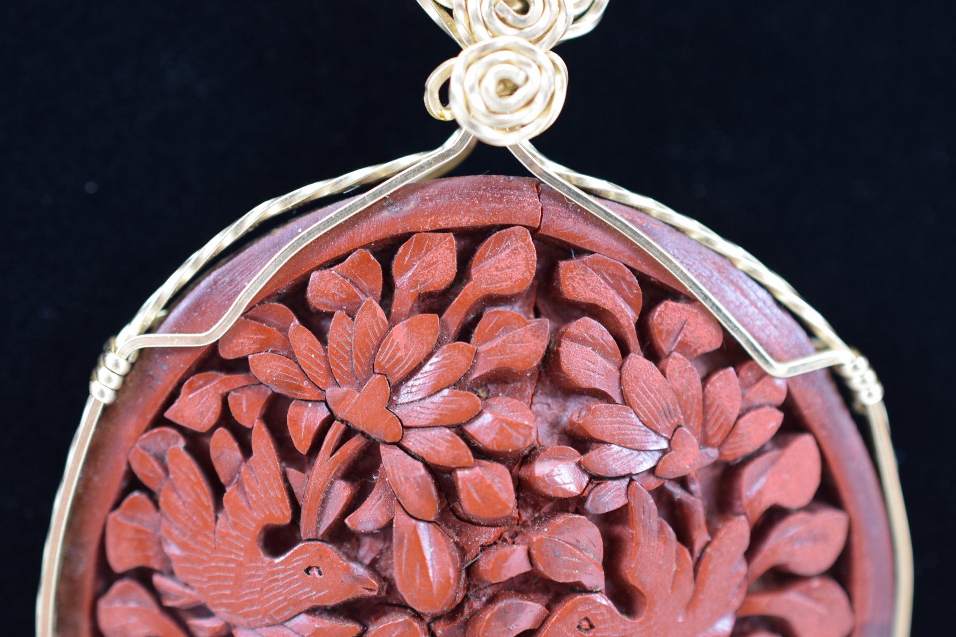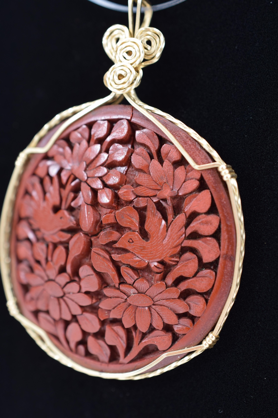 Carved Cinnibar round plaque depicting flowers and birds wire wrapped as medallion. Measures approx 2” (not including wired bail). Weighs 8.3g.