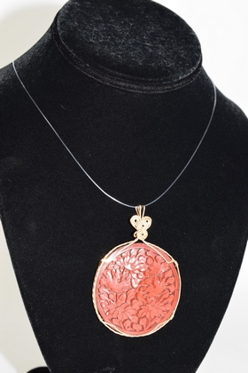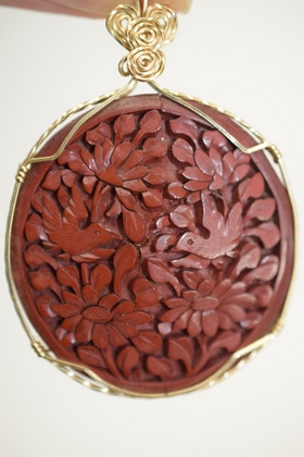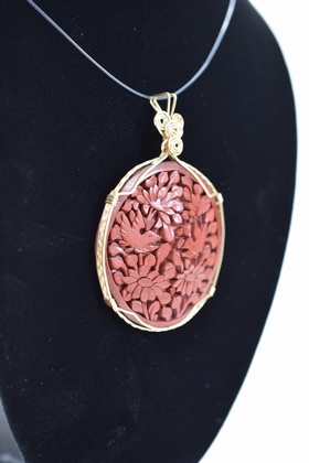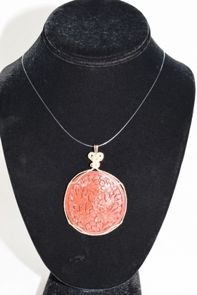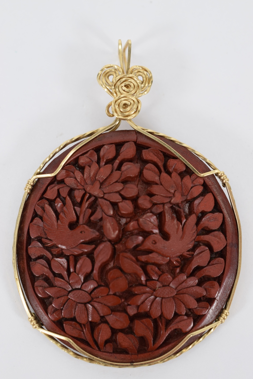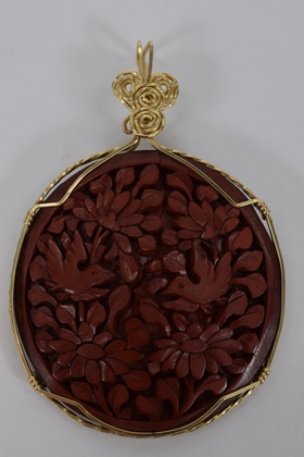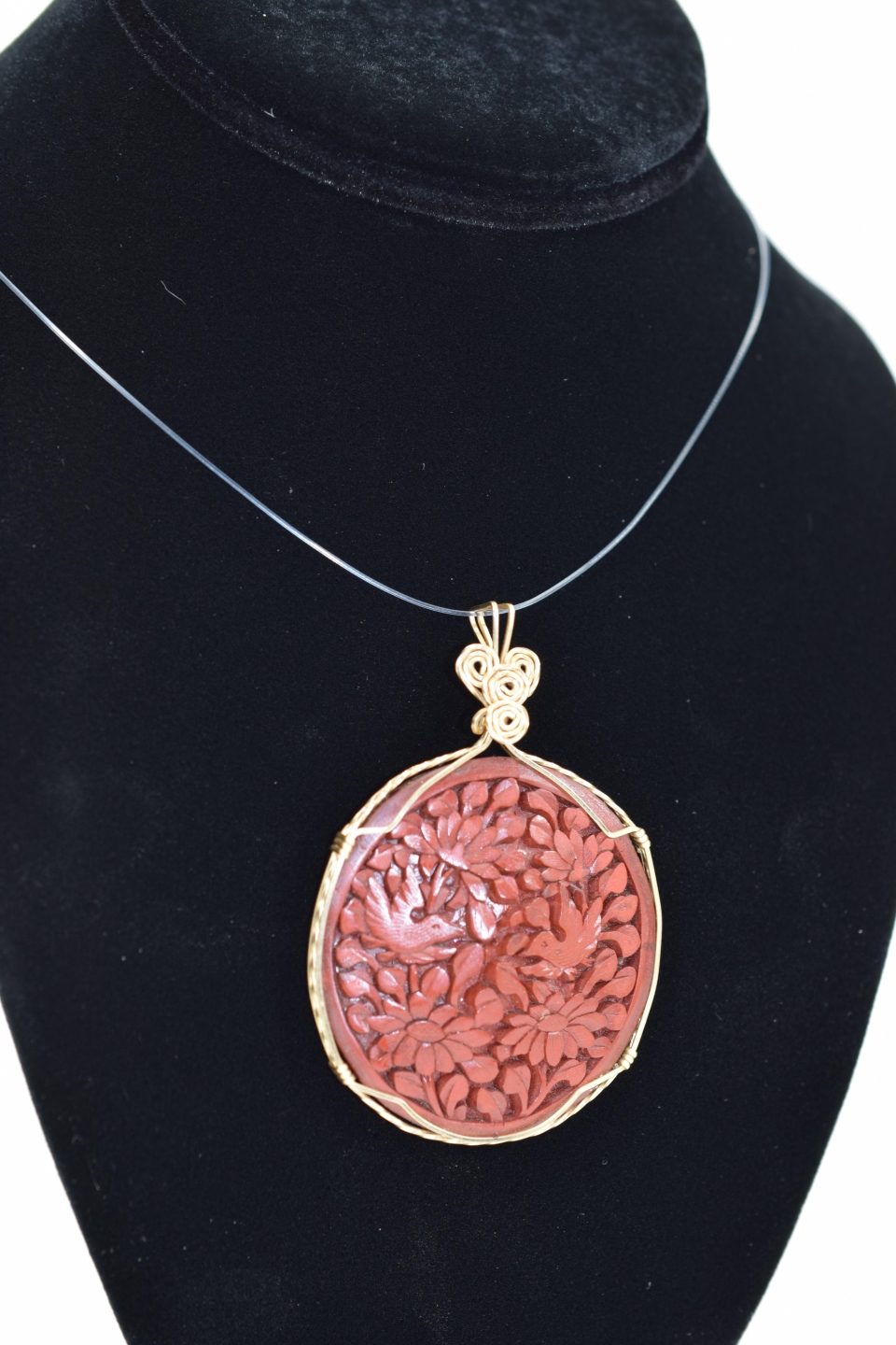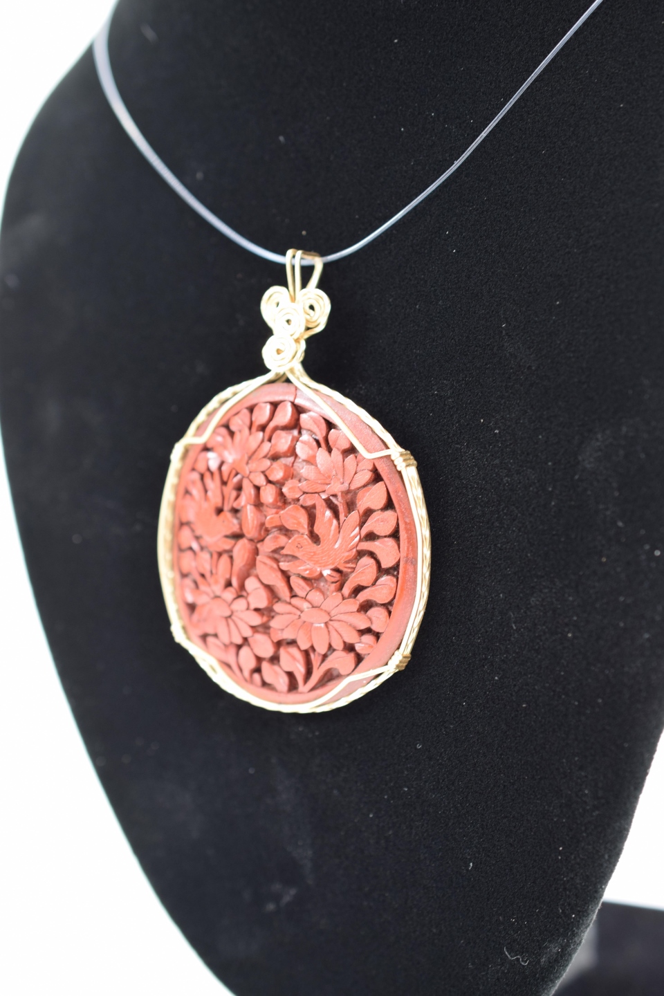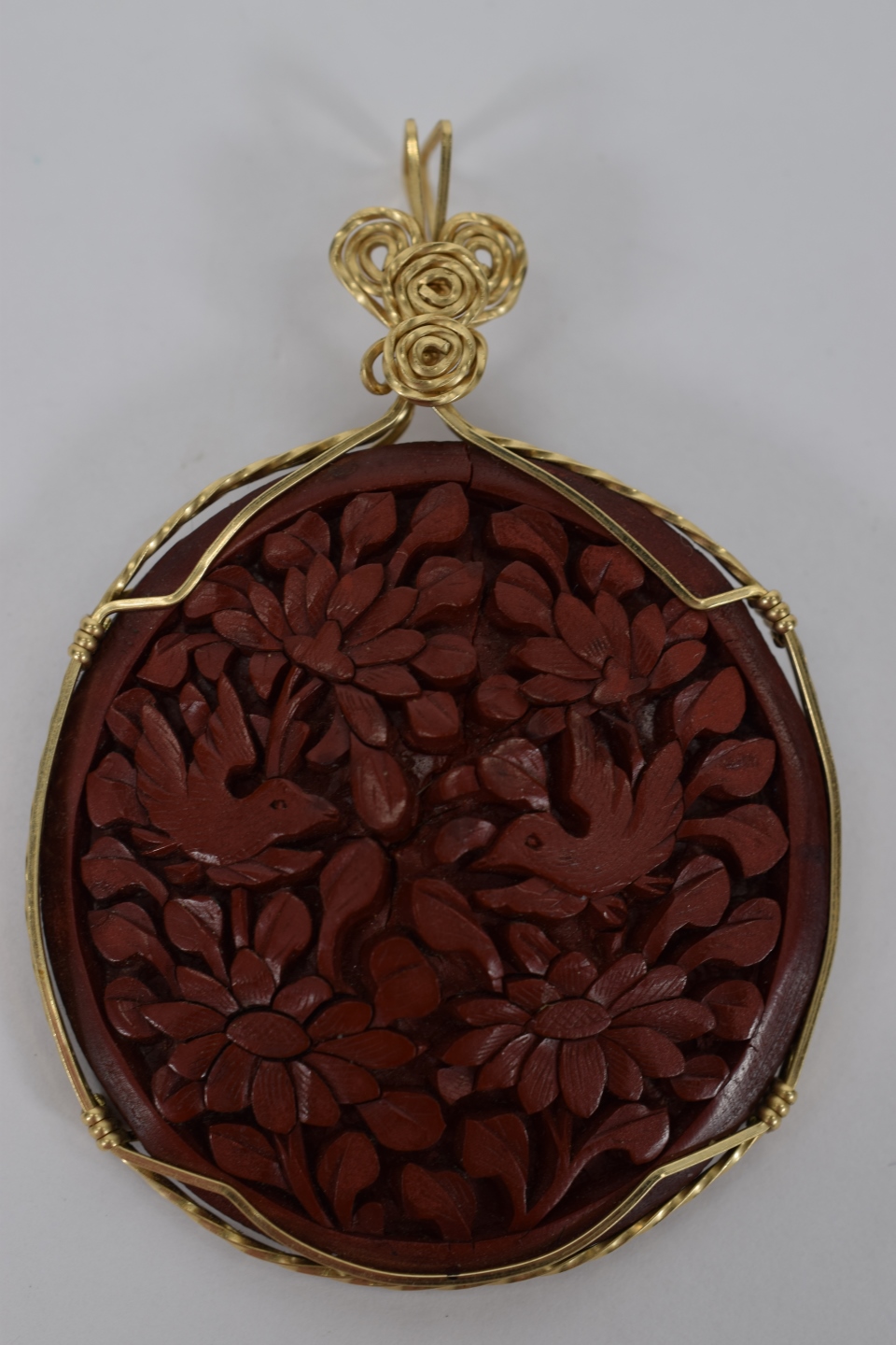Carved Cinnibar round plaque depicting flowers and birds wire wrapped as medallion. Measures approx 2” (not including wired bail). Weighs 8.3g.
