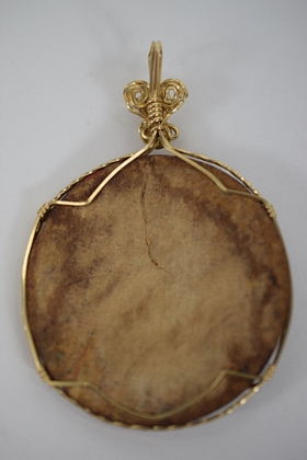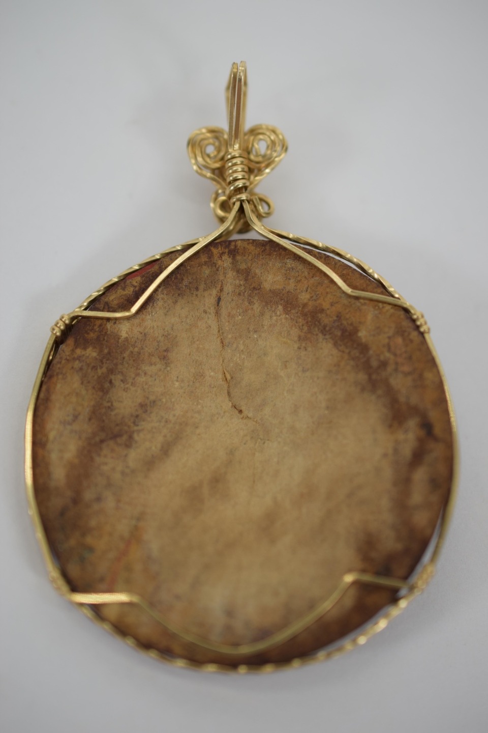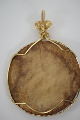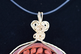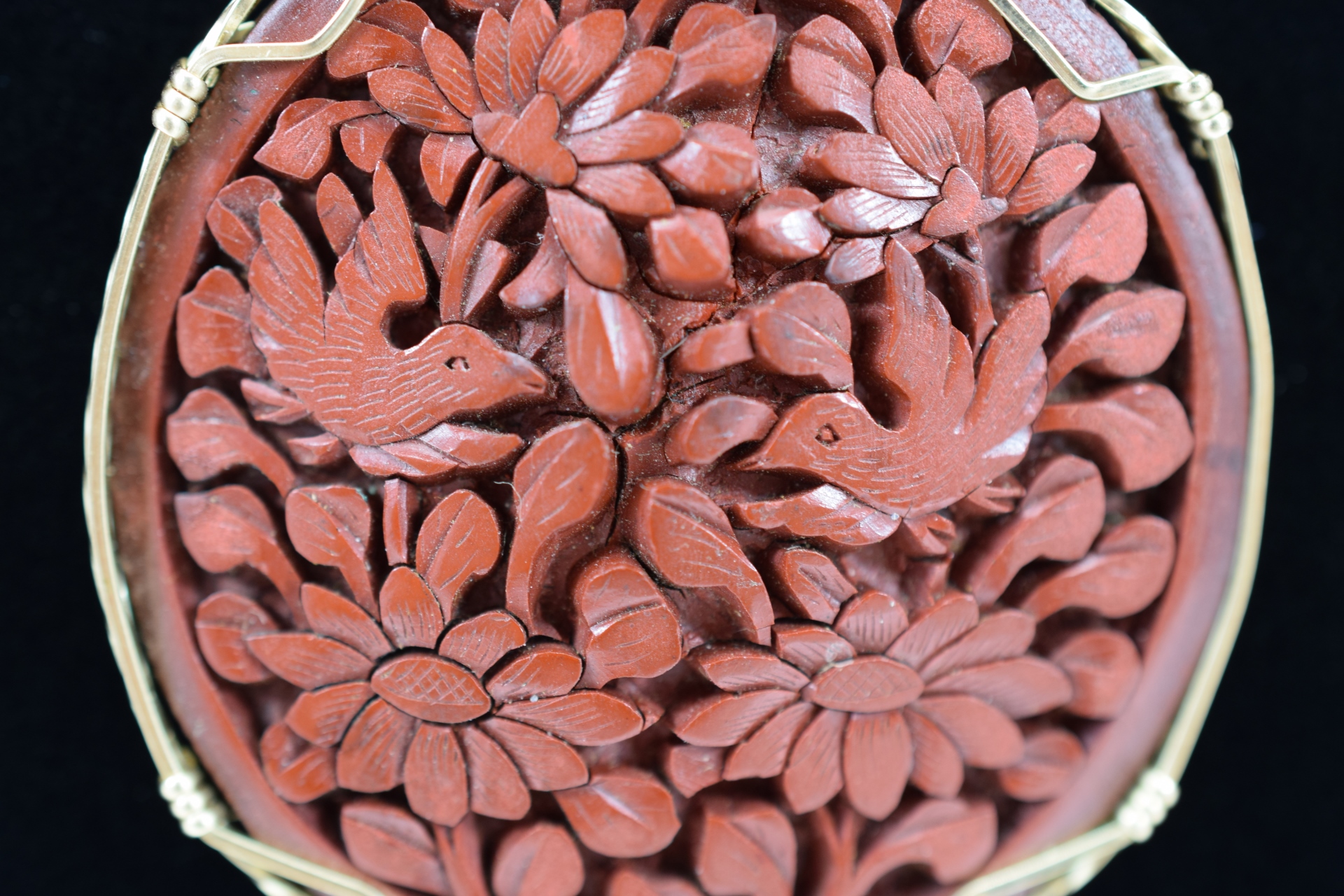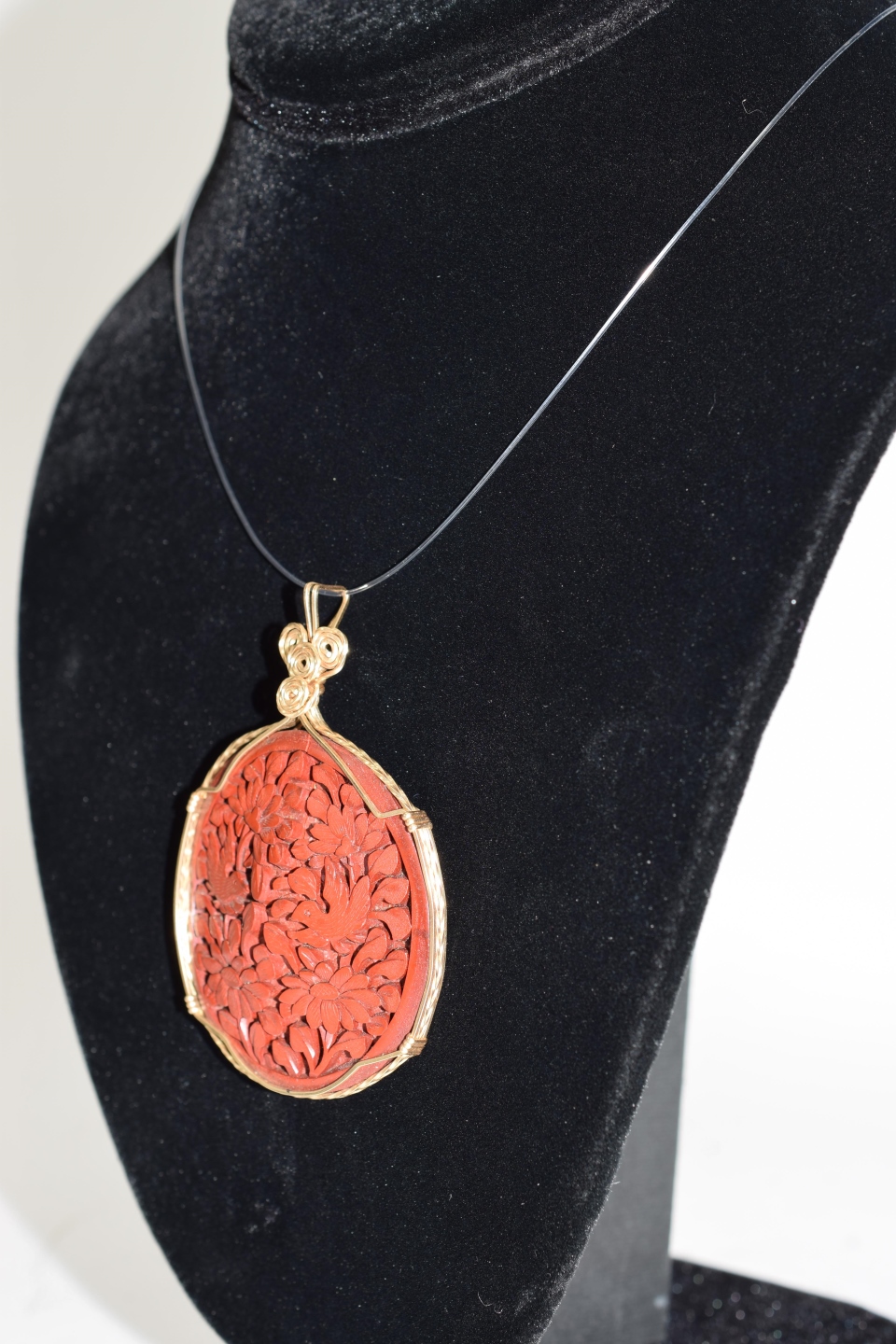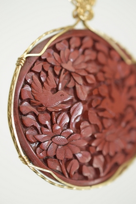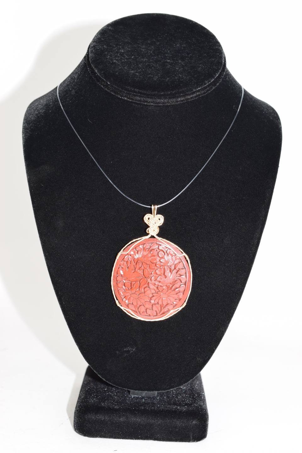 Carved Cinnibar round plaque depicting flowers and birds wire wrapped as medallion. Measures approx 2” (not including wired bail). Weighs 8.3g.