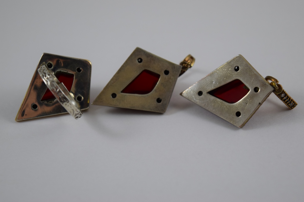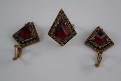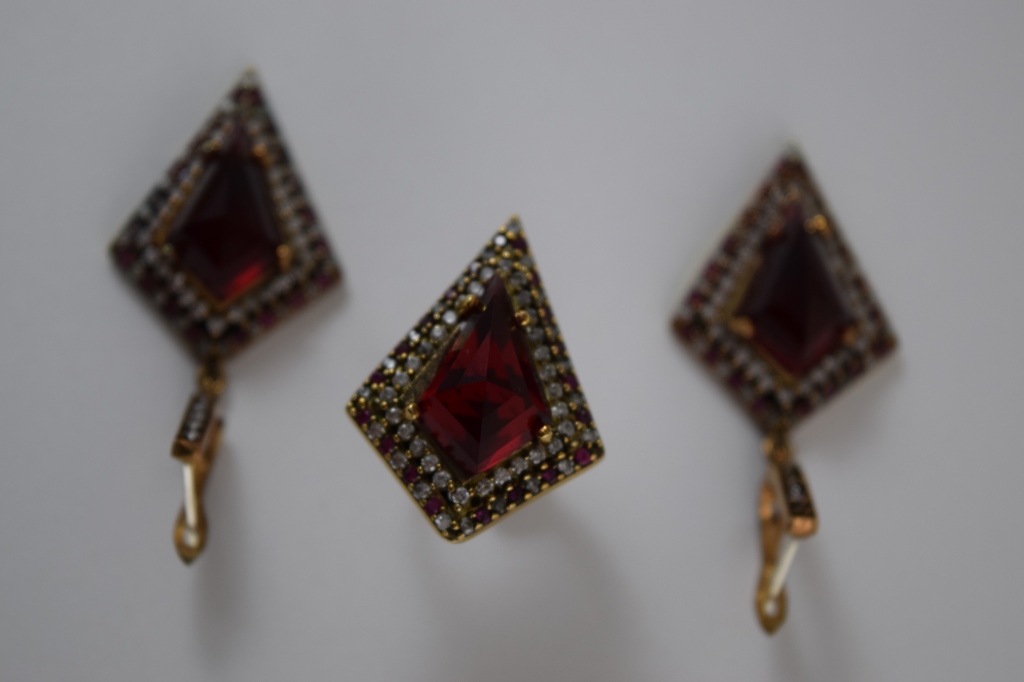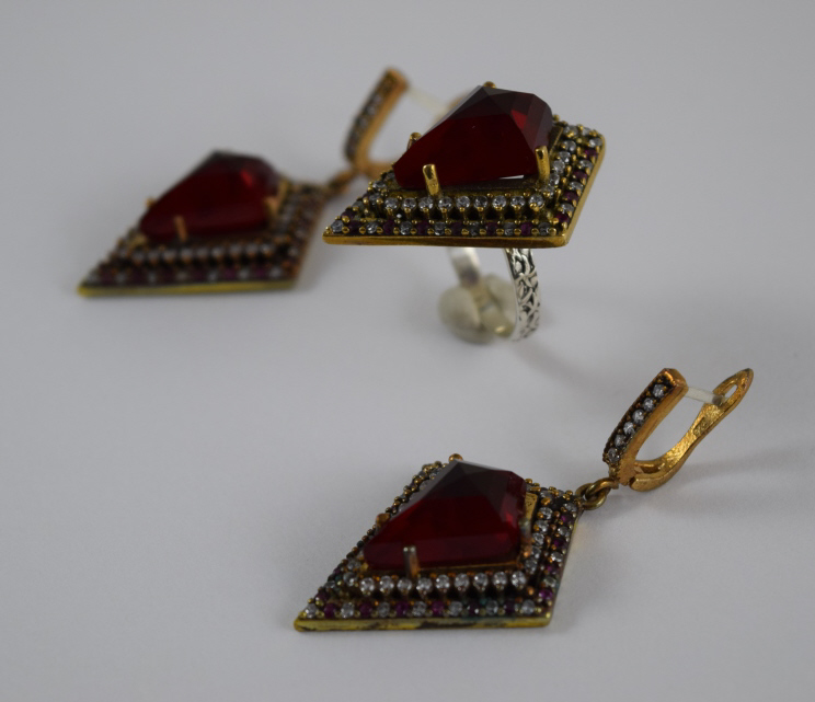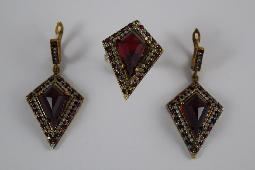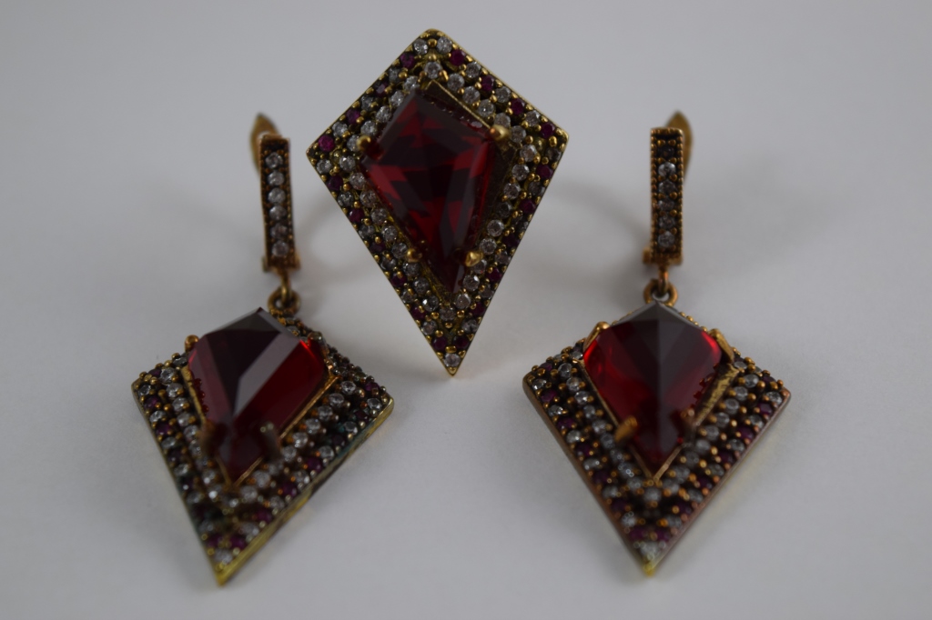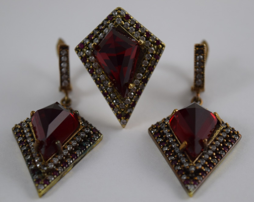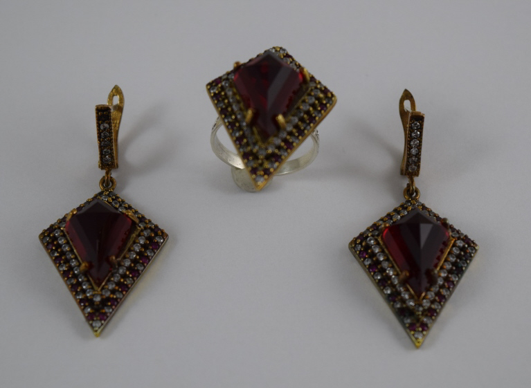 Turkish ruby like stone to center surrounded by white and pink topaz. Ring size 8. Hallmarked "925". Each piece measures 1 1/4" (3.2cm) long x 1" (2.54cm) wide, without bail or ring. Total weight 27.3g. U.S. SHIPPING$15 PLUS INSURANCE