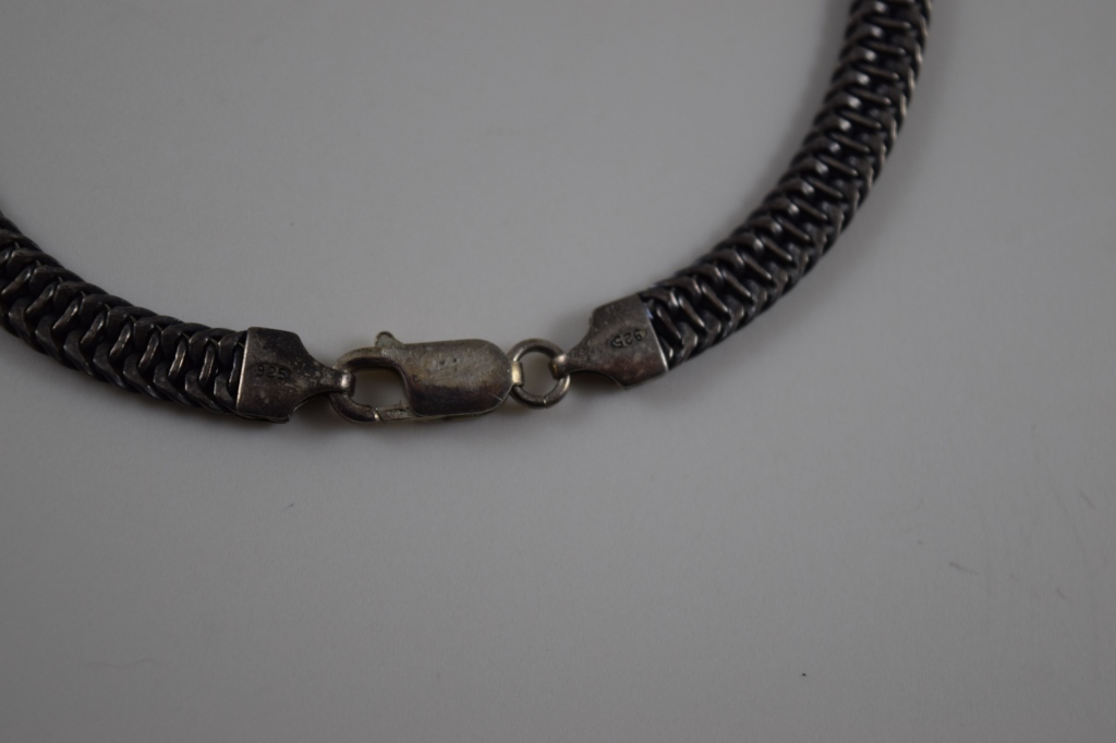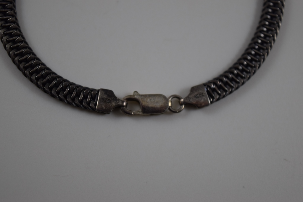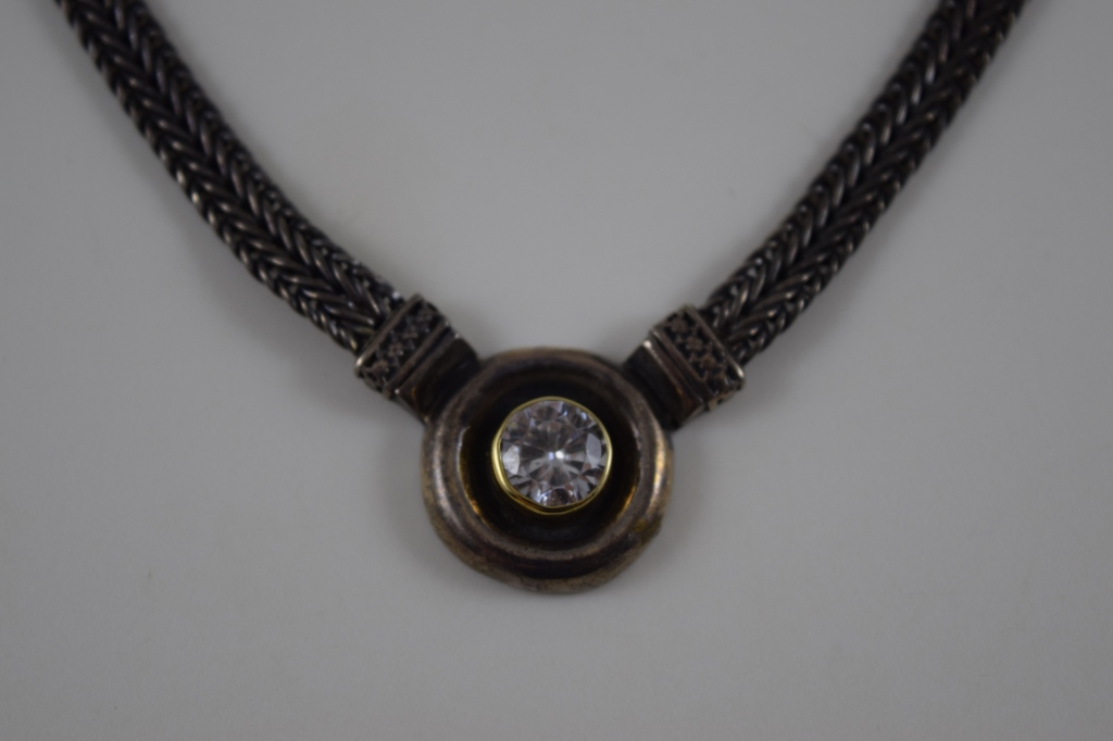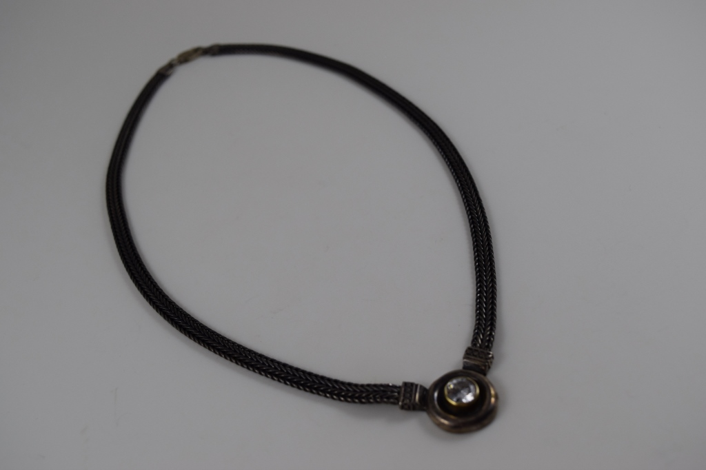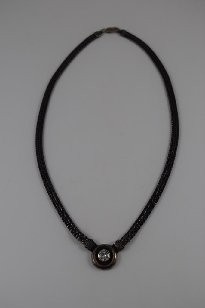 Nice double-link .925 silver necklace with 1/4” (.63cm) stone to center. Hallmarked “.925” and “[worn artist signature]”. Measures 20” (50.8cm). Weighs 33.2g (1.06 ounces troy). U.S. SHIPPING $15 PLUSINSURANCE