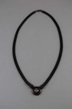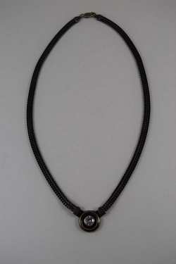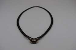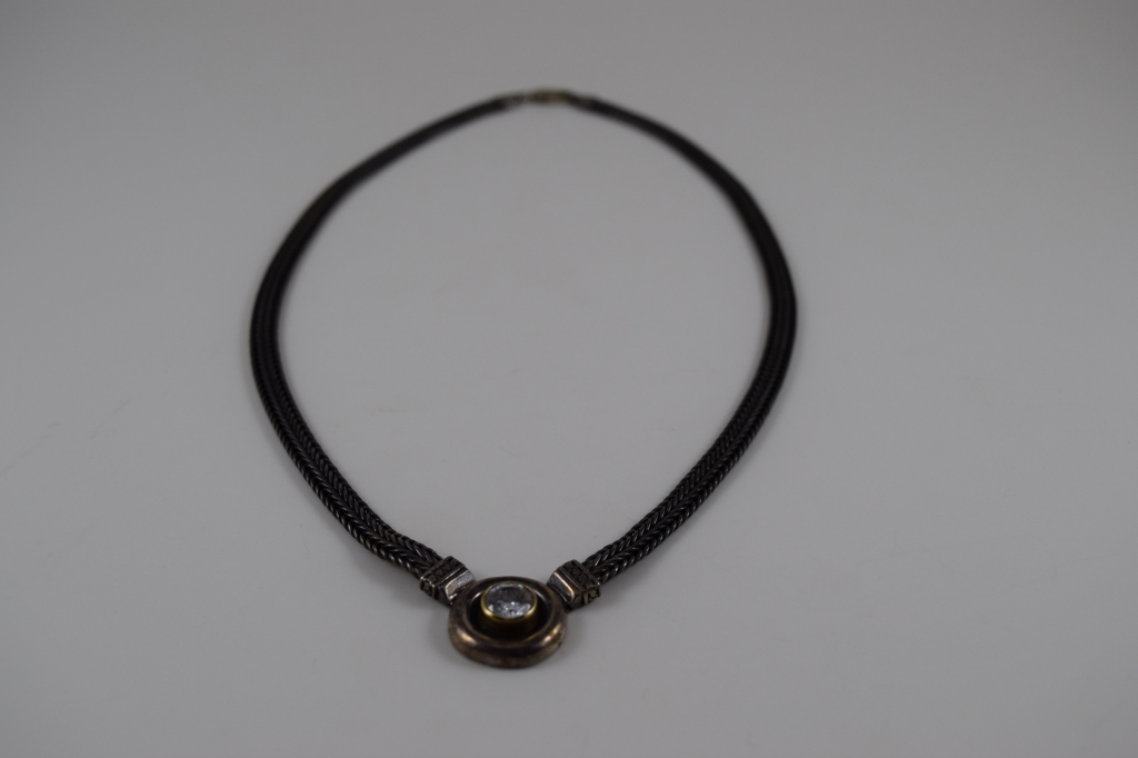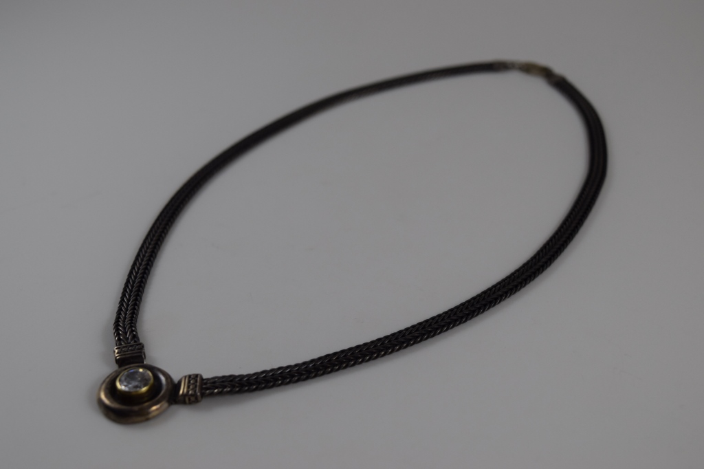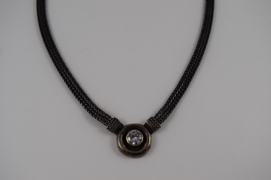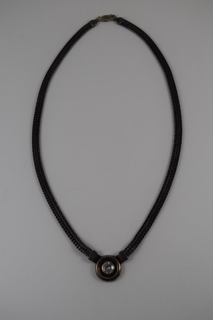 Nice double-link .925 silver necklace with 1/4” (.63cm) stone to center. Hallmarked “.925” and “[worn artist signature]”. Measures 20” (50.8cm). Weighs 33.2g (1.06 ounces troy). U.S. SHIPPING $15 PLUSINSURANCE