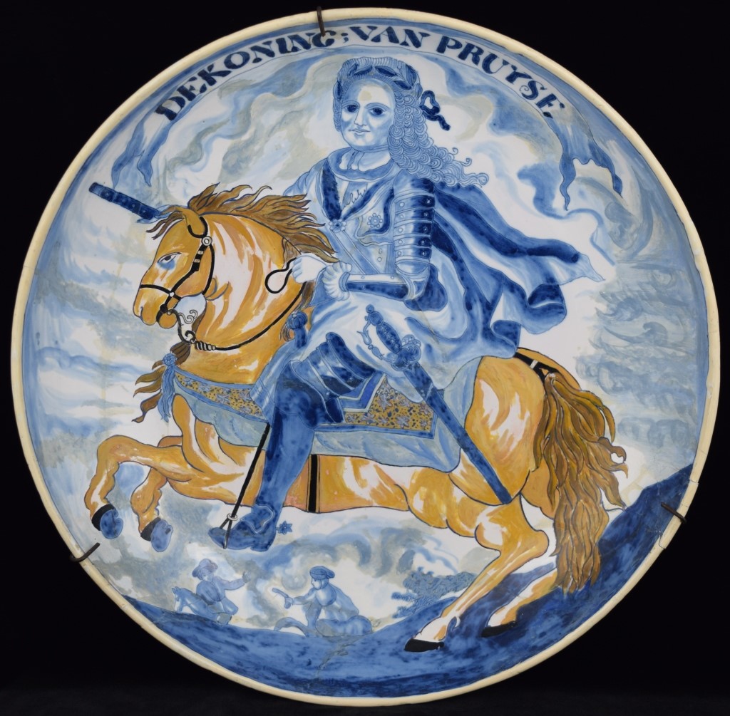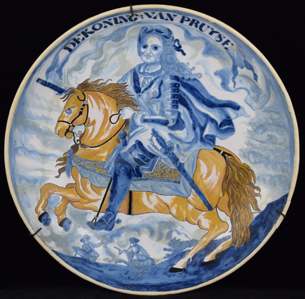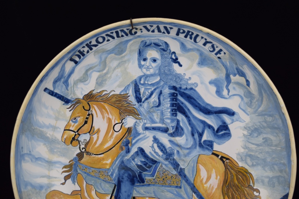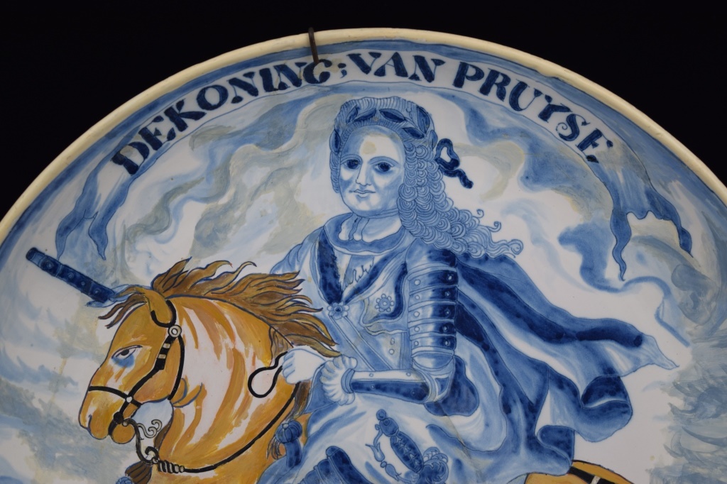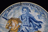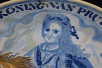 Early Dutch deep charger bowl depicting the King of Prussia. Has notes taped to back. With repair. Measures 15 1/4' in diameter x 3" H. Weighs 3lbs.,6oz.
