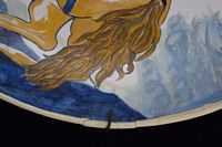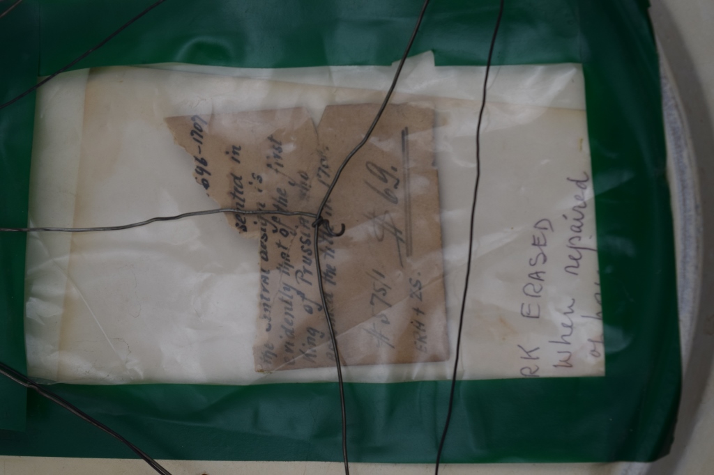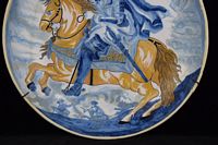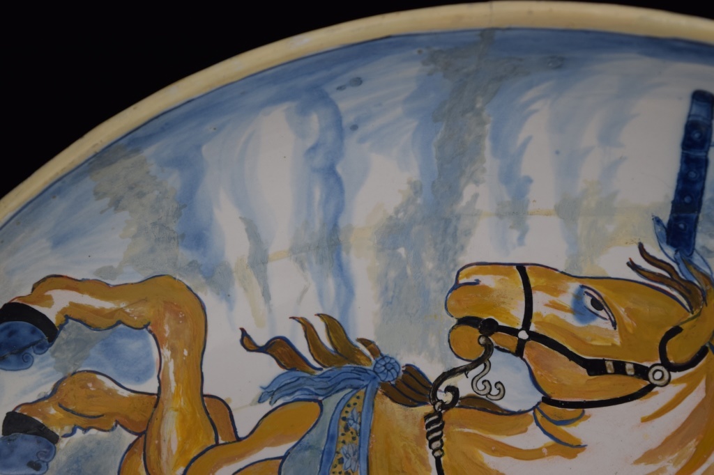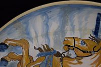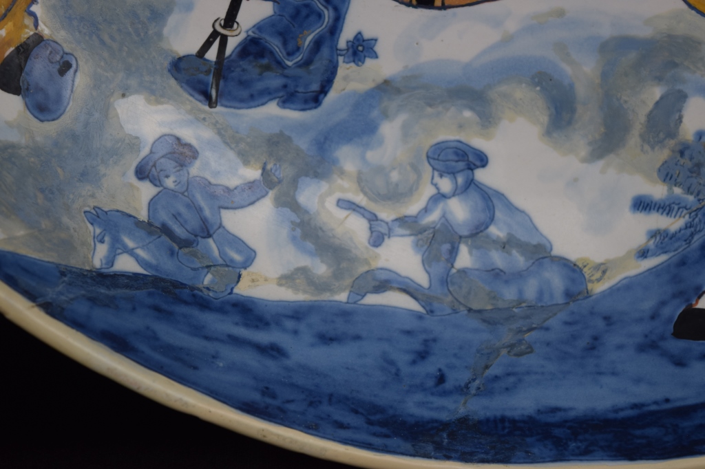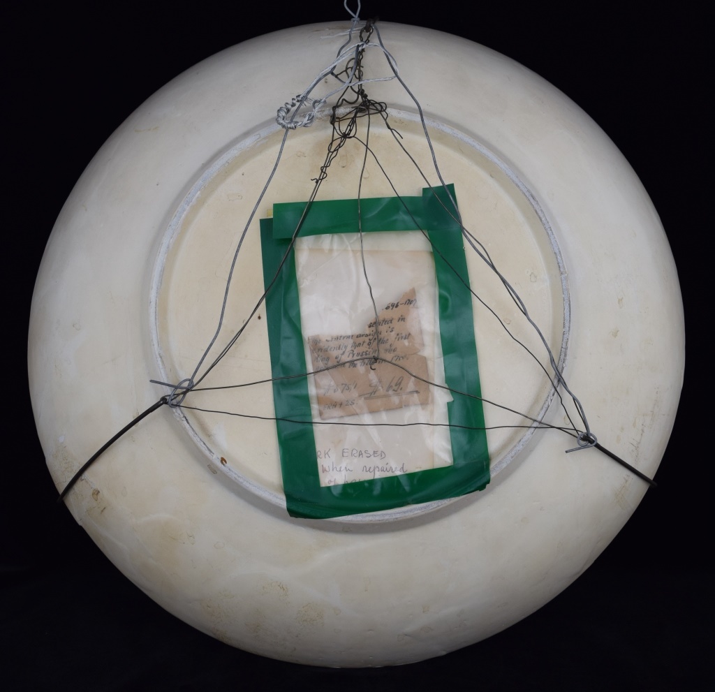 Early Dutch deep charger bowl depicting the King of Prussia. Has notes taped to back. With repair. Measures 15 1/4' in diameter x 3" H. Weighs 3lbs.,6oz.