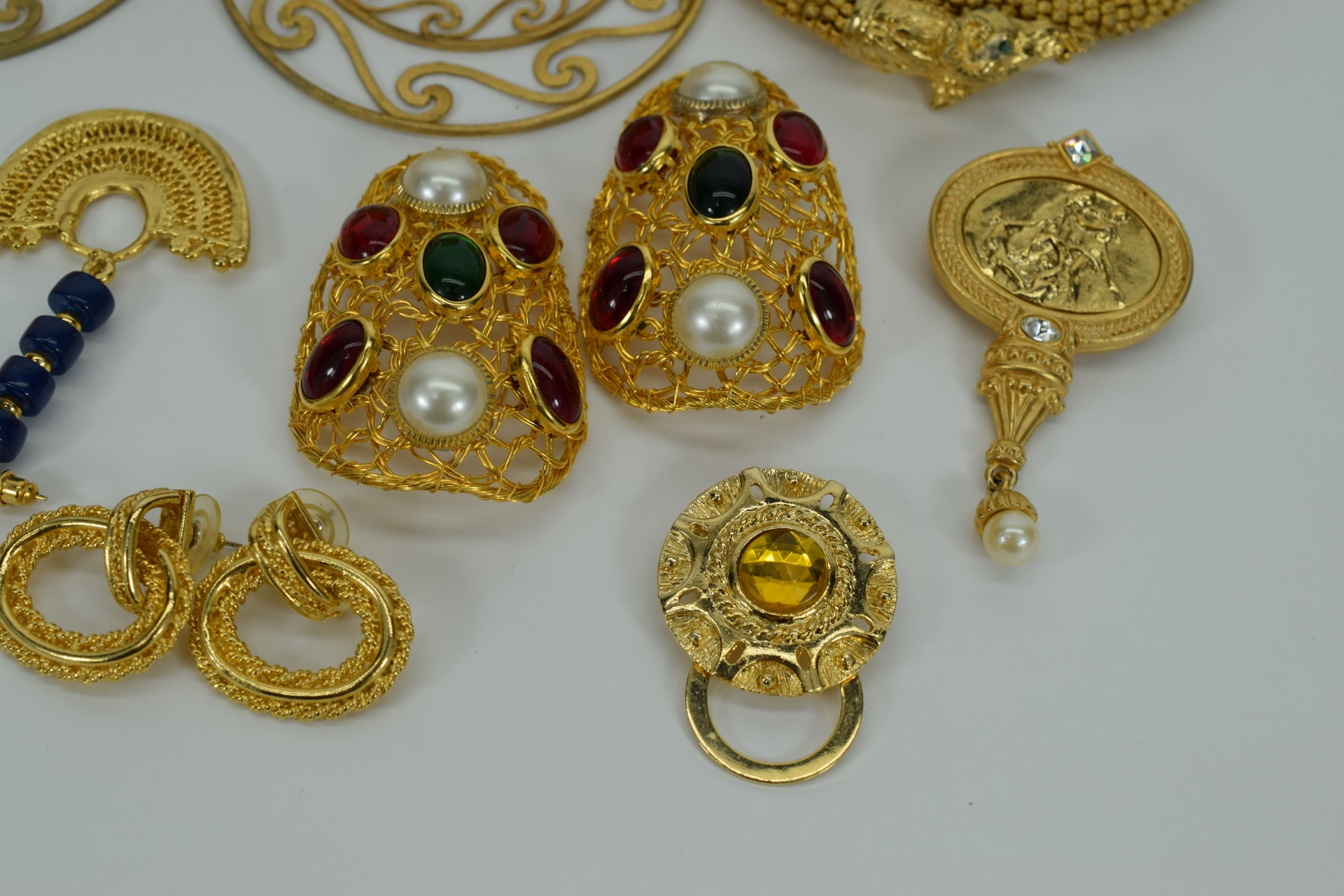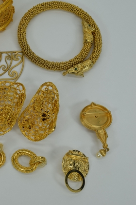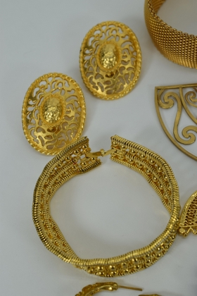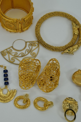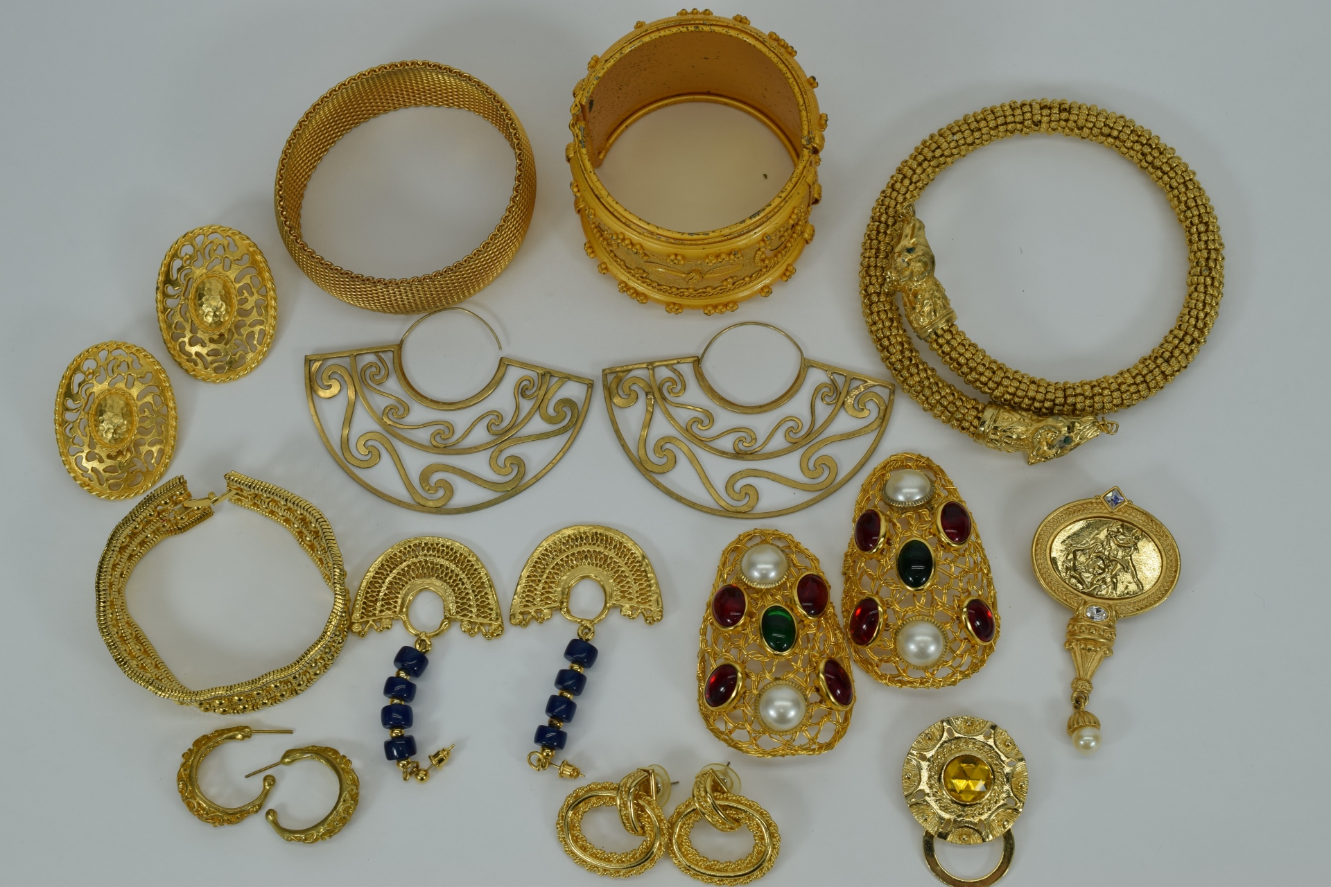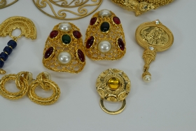 Miscellaneous lot of gold toned costume fashion jewelry including 3 bracelets, 6 sets of earrings,2 brooches/pins, and 1 flexible choker dragon necklace. Weighs 15oz. Total.