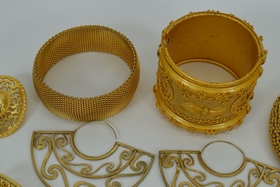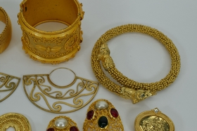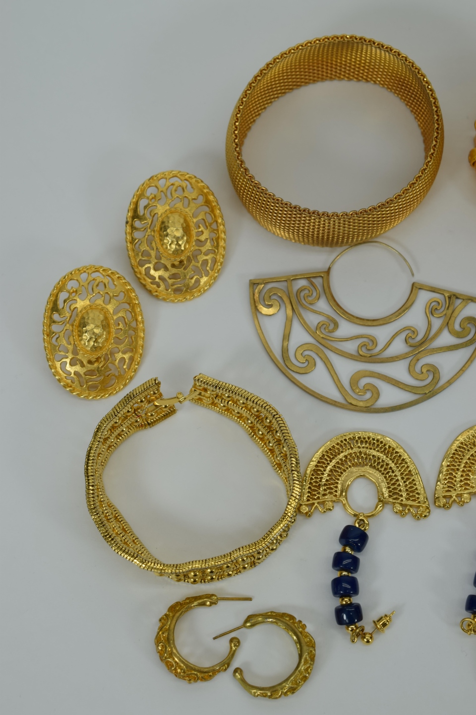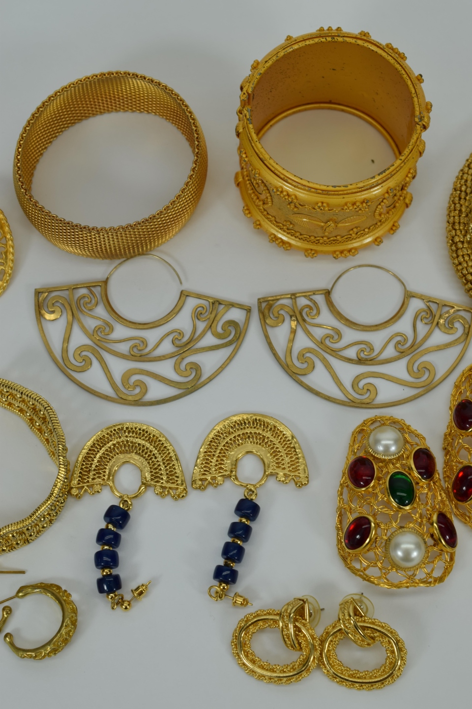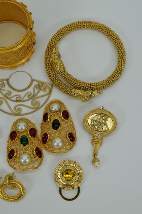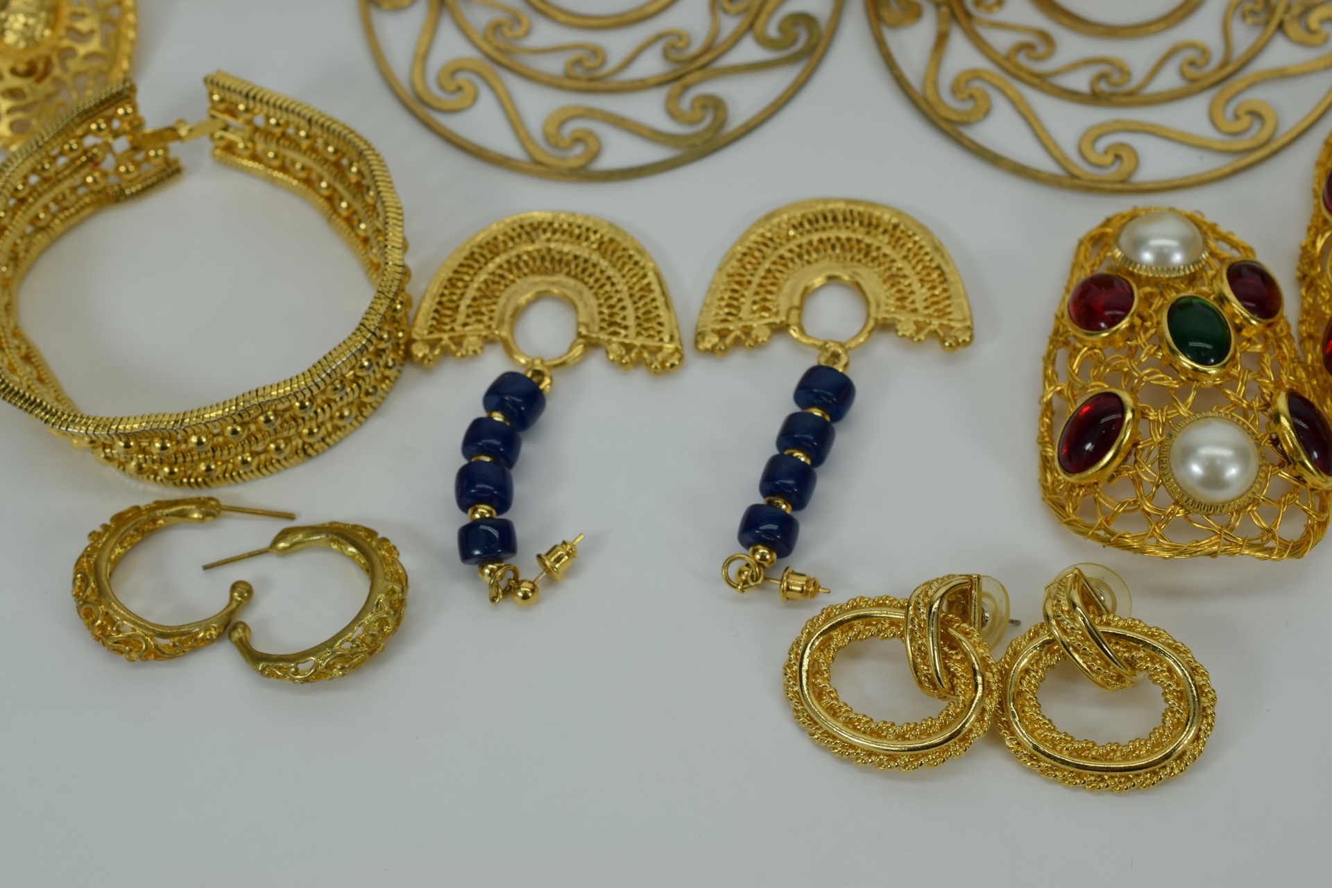 Miscellaneous lot of gold toned costume fashion jewelry including 3 bracelets, 6 sets of earrings,2 brooches/pins, and 1 flexible choker dragon necklace. Weighs 15oz. Total.