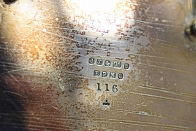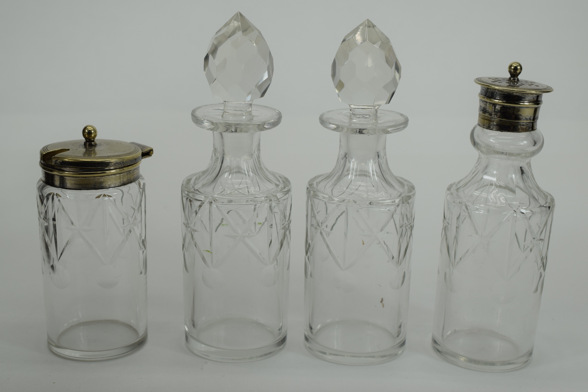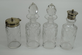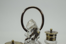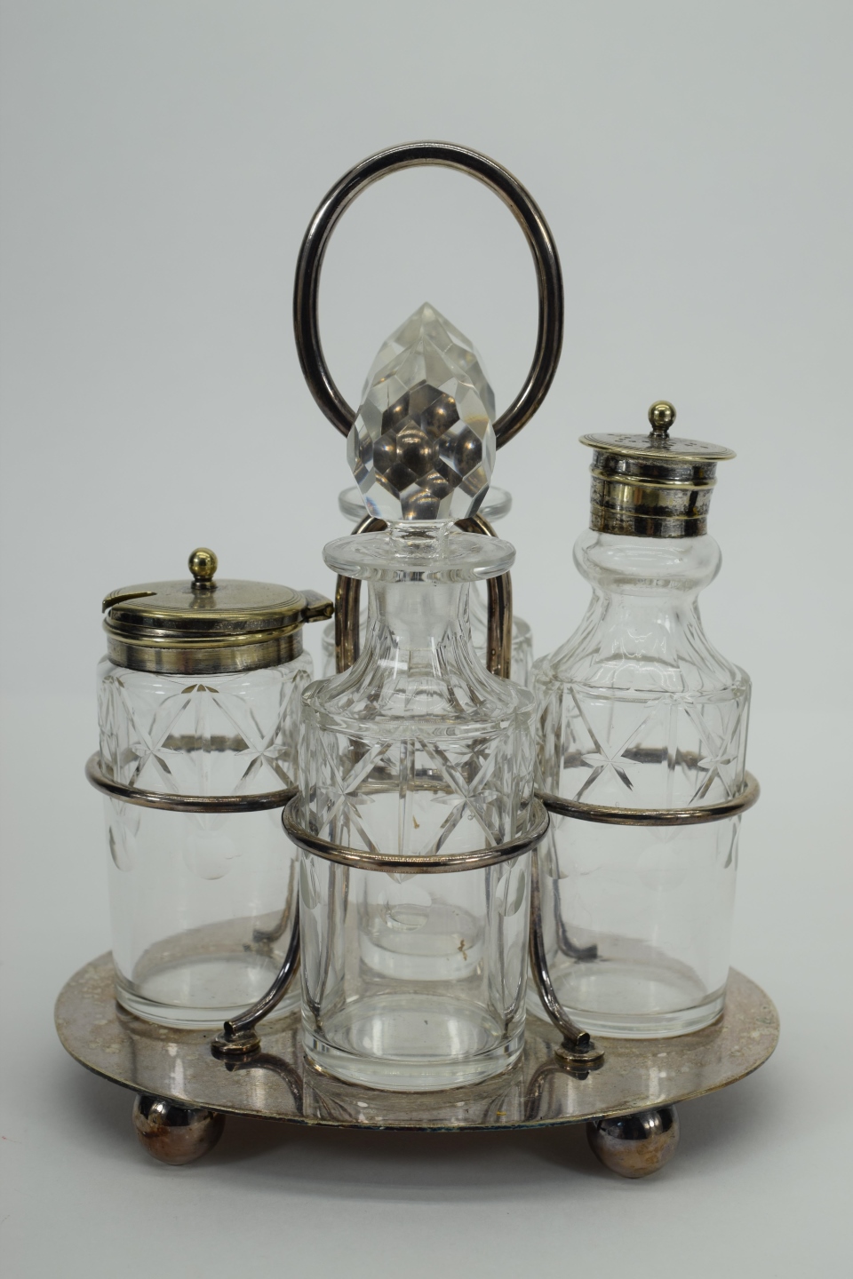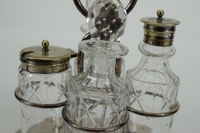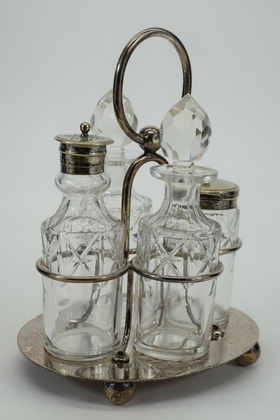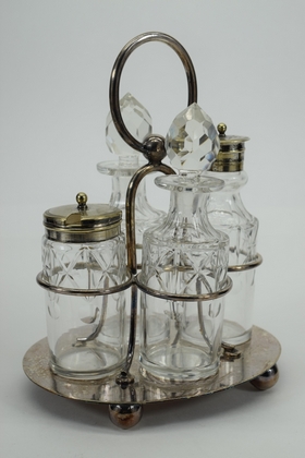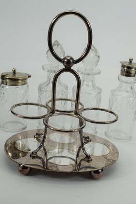 JT&CO silverplate cruet set with oil and vinegar cruets and 2 other miscellaneous jars for sugar, salt, creamer etc. Hallmarked “JT&CO S”, “EPNS” and “116”. JT and English pseudo-hallmarks John Townsend, a Cape of Good Hope Colony silversmith. Active 1824-1841. Measures 6-1/4” L x 5-1/8” W x 8” H. Weighs approx. 2.5lbs. Total.