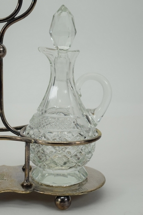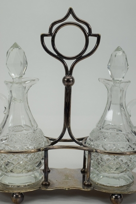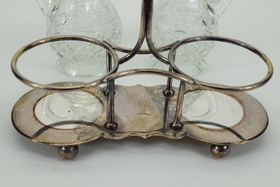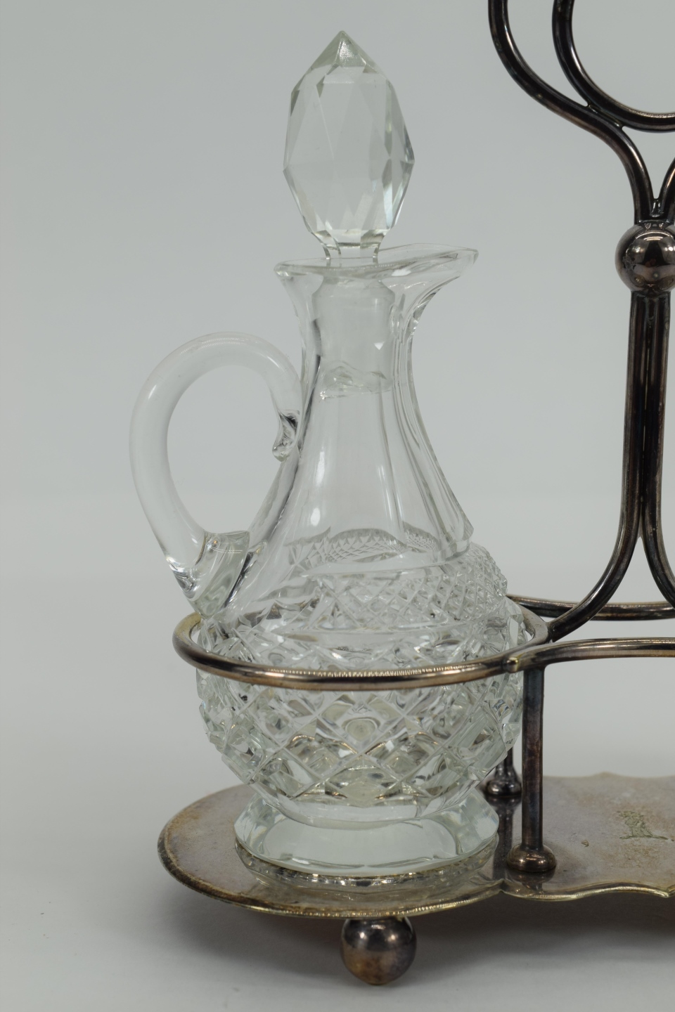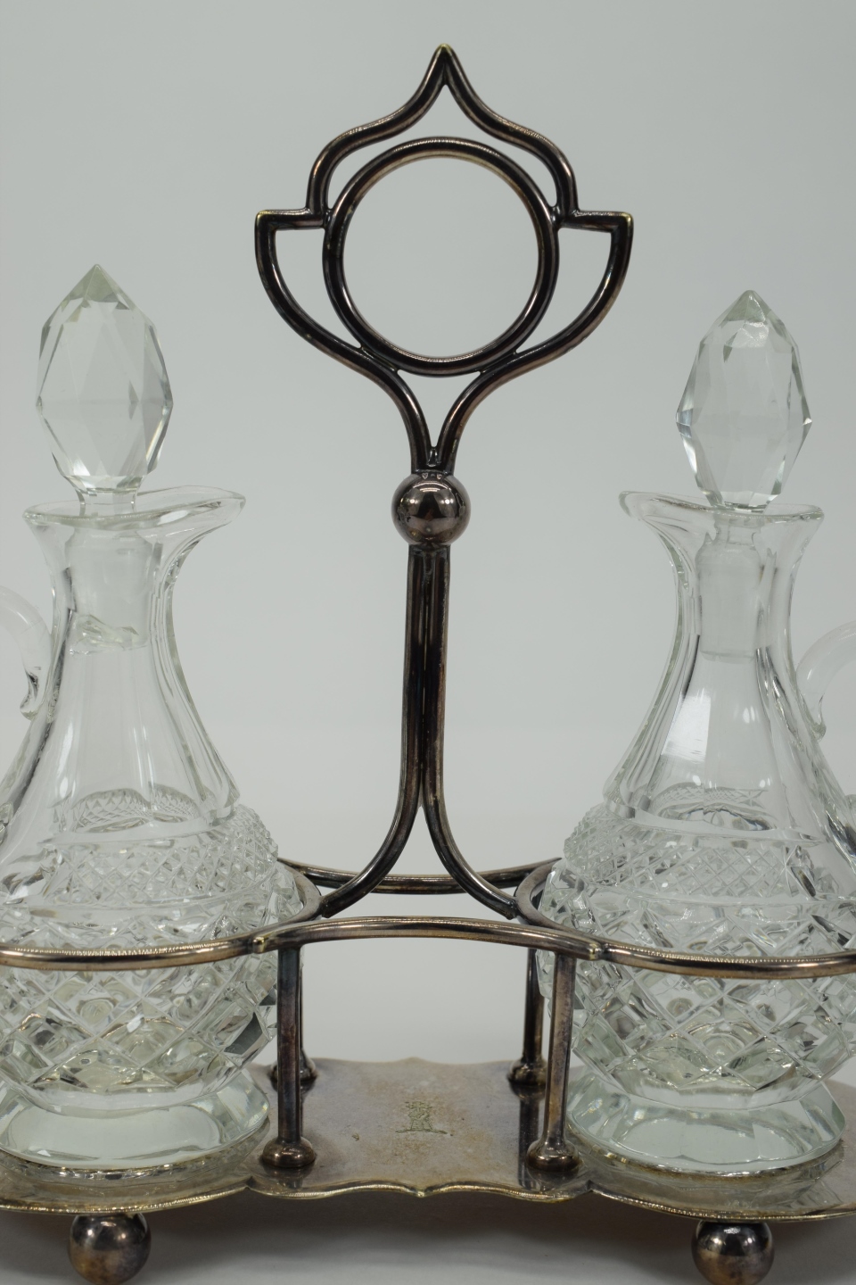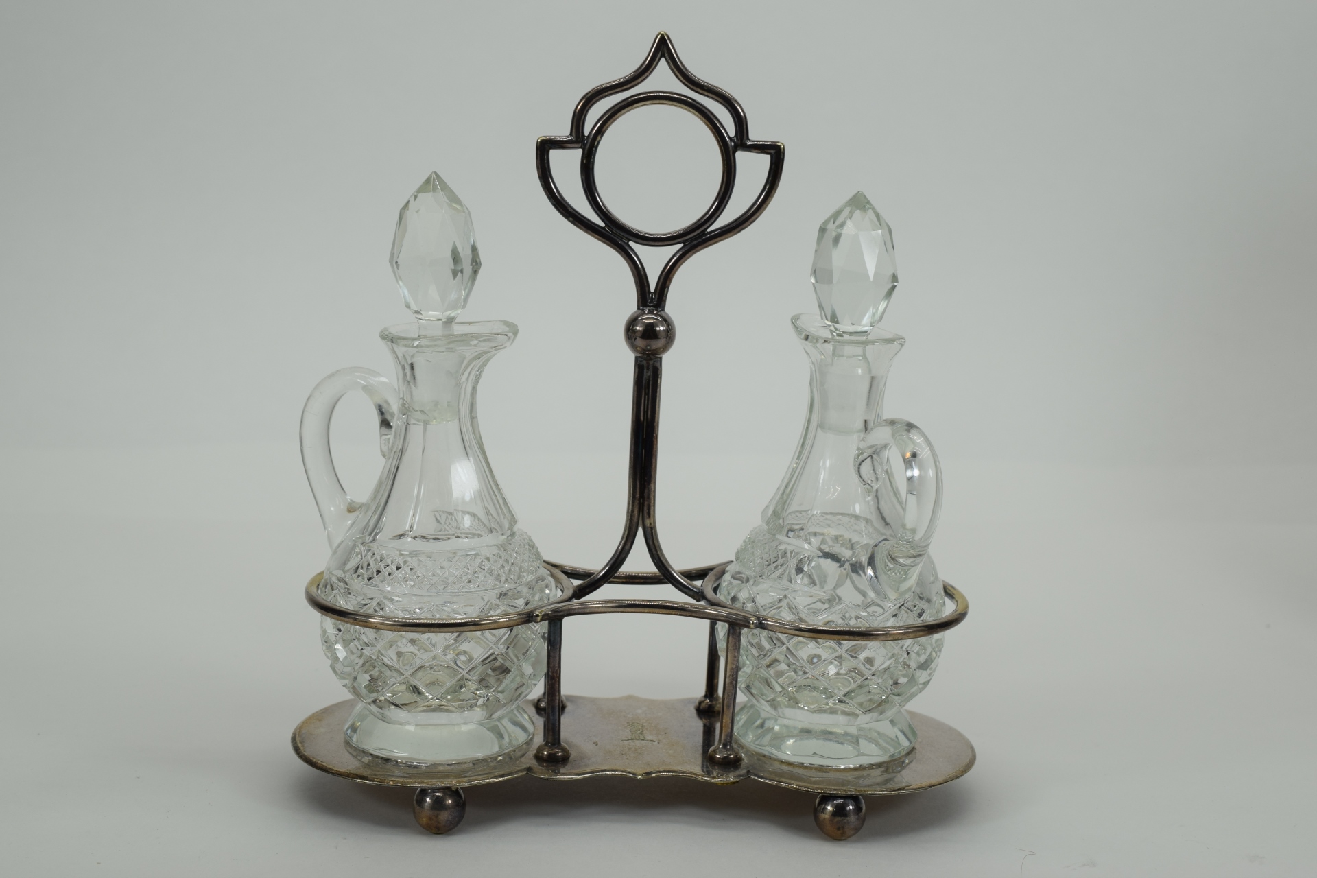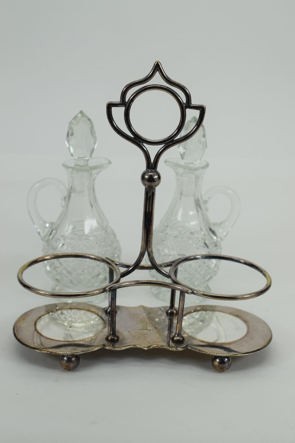 Elkington silverplate oil and vinegar cruet set. Hallmarked “1” with a circle indicating from the 1800's. In between the cruets is a marking of an arm holding a cross. Numerous illegible markings to the bottom as well. Comes with 2 crystal cruets. Measures approx. 8” L x 3-1/2” W x 8-3/4” H. Weighs approx. 2lbs. Total.