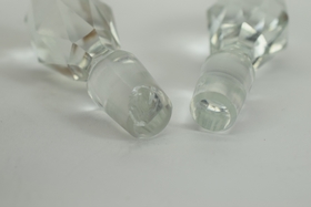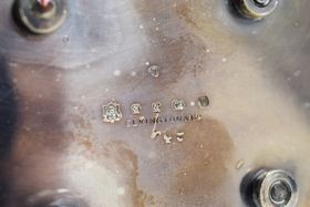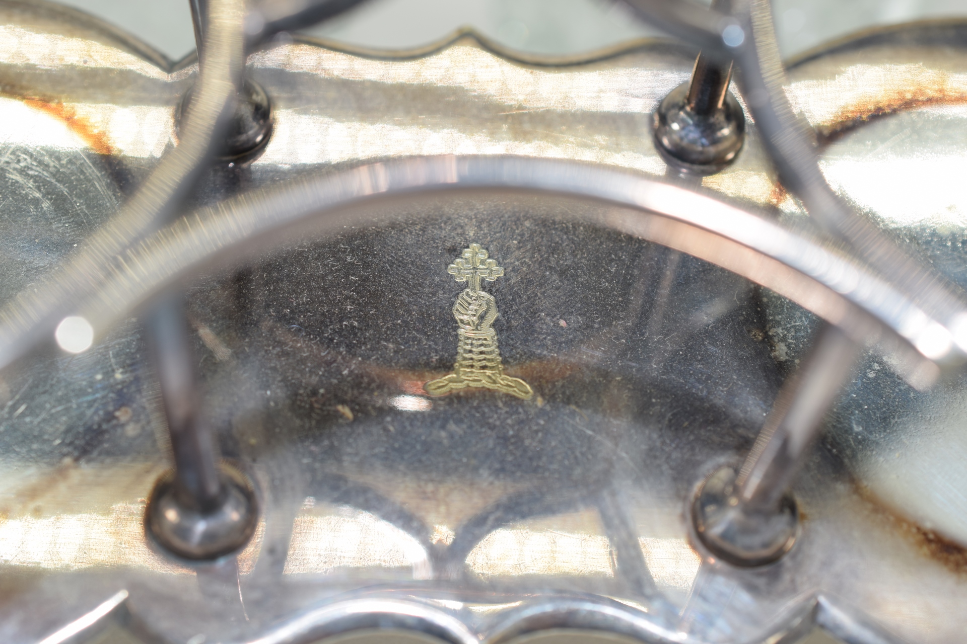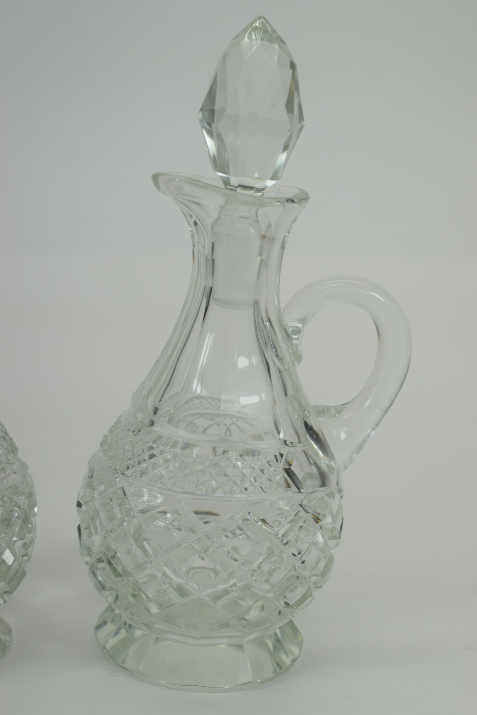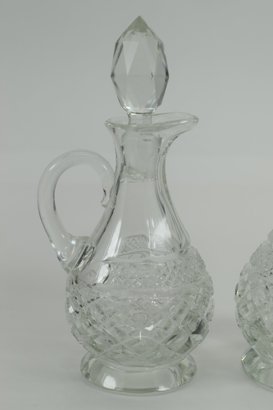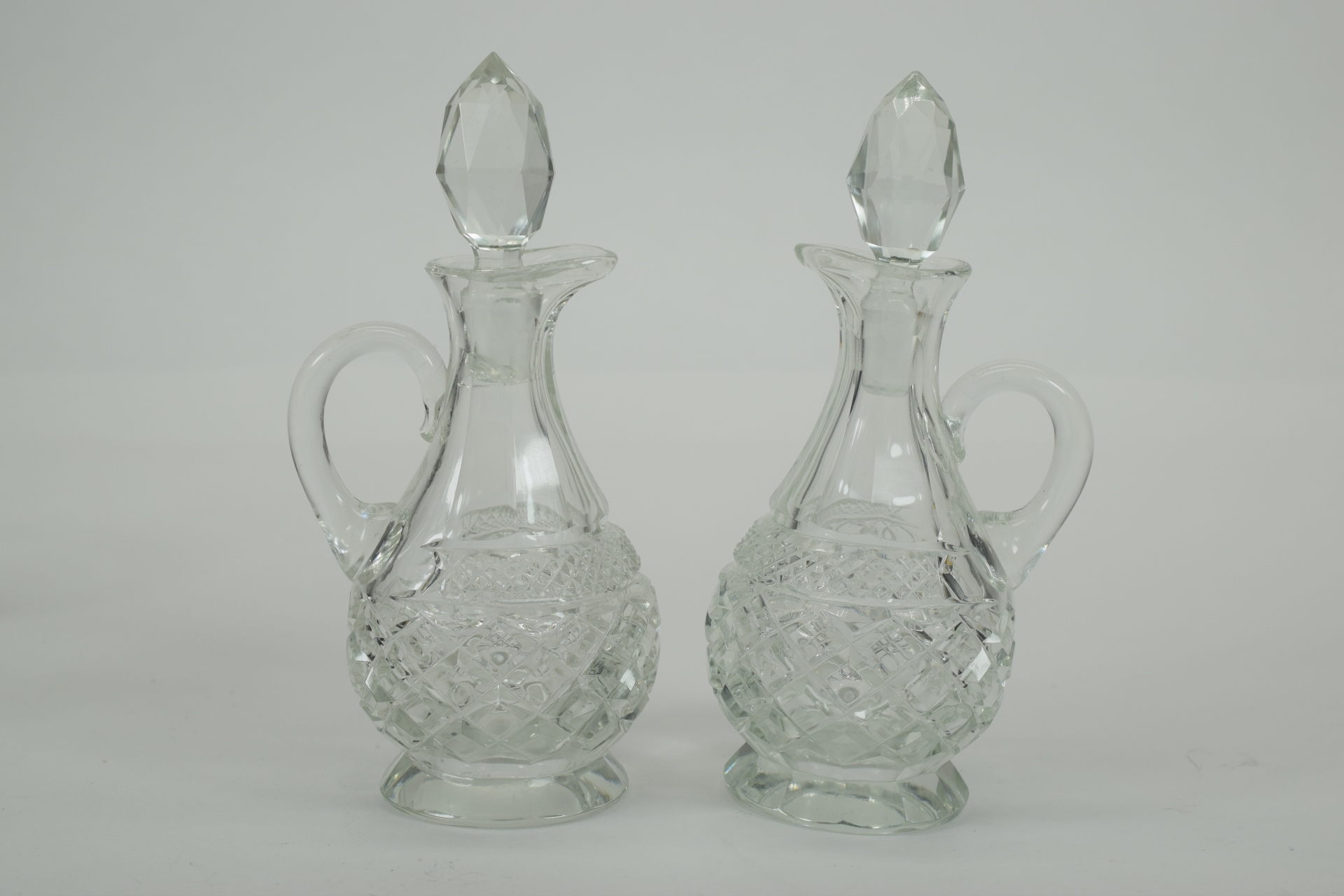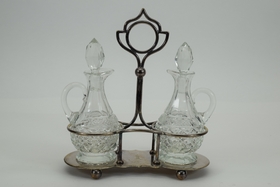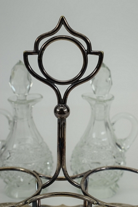Elkington silverplate oil and vinegar cruet set. Hallmarked “1” with a circle indicating from the 1800's. In between the cruets is a marking of an arm holding a cross. Numerous illegible markings to the bottom as well. Comes with 2 crystal cruets. Measures approx. 8” L x 3-1/2” W x 8-3/4” H. Weighs approx. 2lbs. Total.