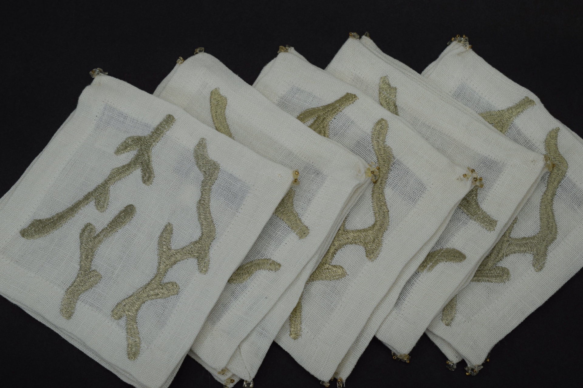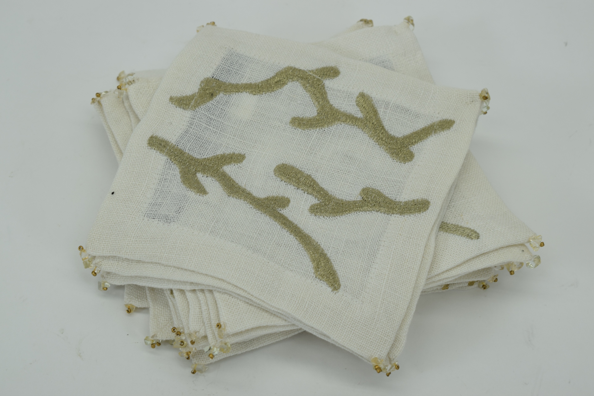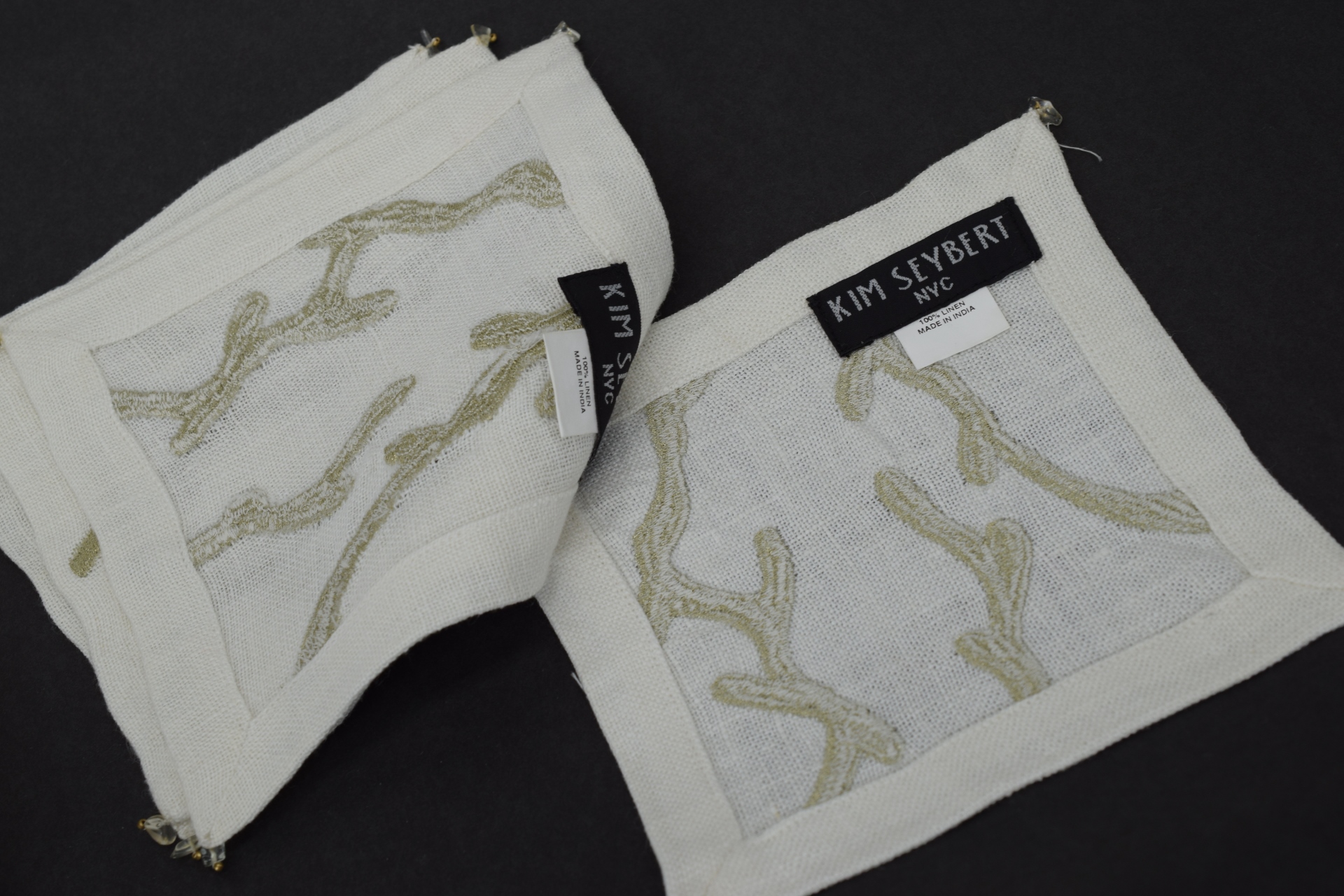 Set of 20 Kim Seybert embroidered beaded beige with decorative coral cocktail napkins. Each has a decorative bead on the corners. 100% linen. Each measures approx. 6” L x 6” W. Weighs approx. 10oz. Total.