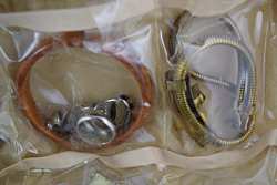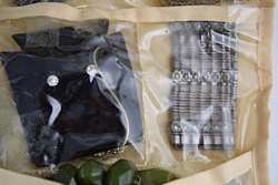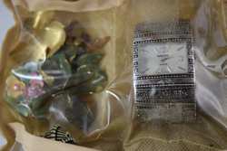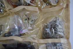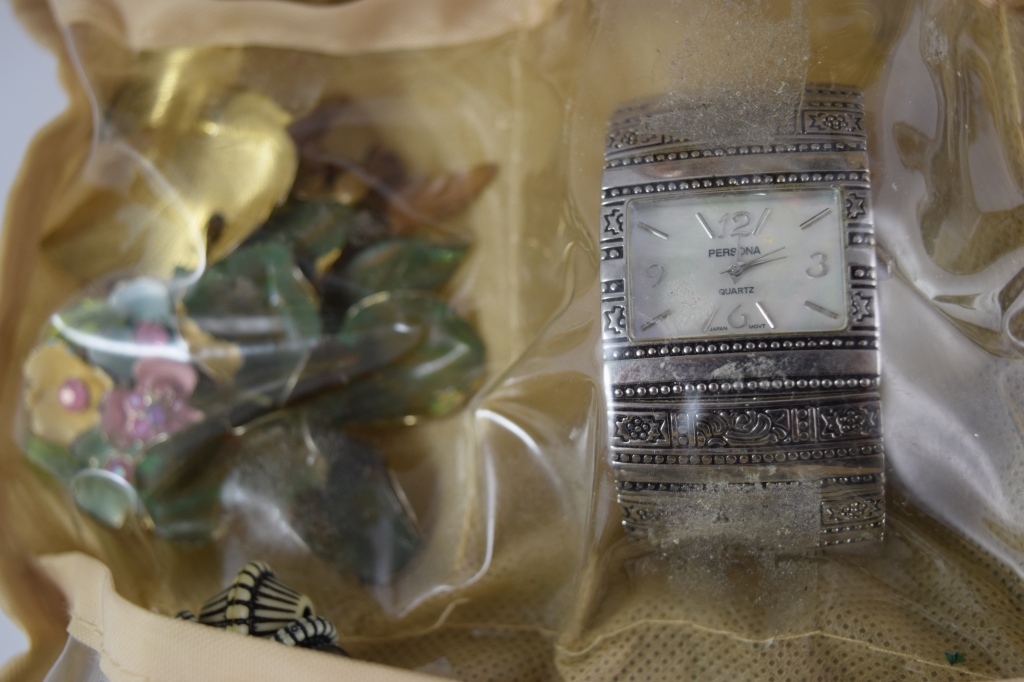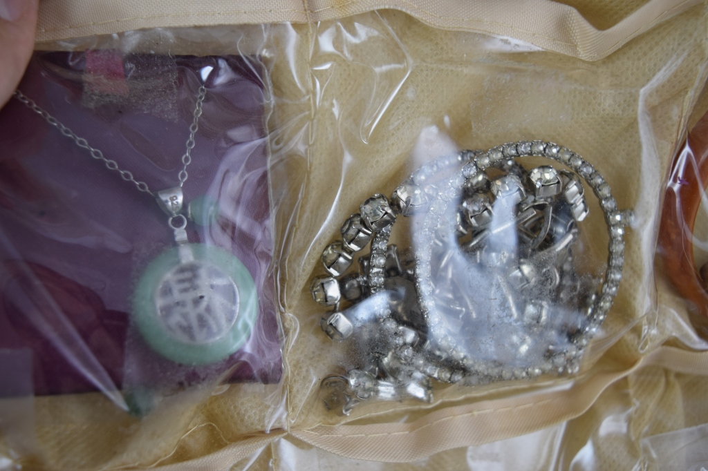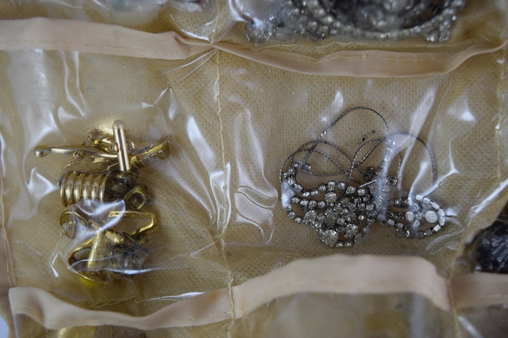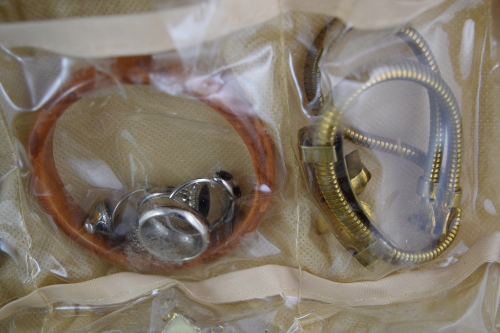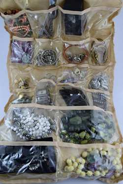 Earrings, rings, bracelets, watches, brooches, pins, coral, jade, spoons, cuff links, tie-pins, enamel, and more. Measures 12" (30.4cm) long x 9" (22.9cm) wide x 6" (15.4cm) high [folded]. Weighs 3lbs., 3oz..U.S. SHIPPING $20 PLUS INSURANCE