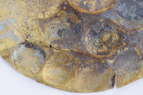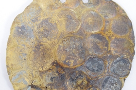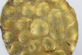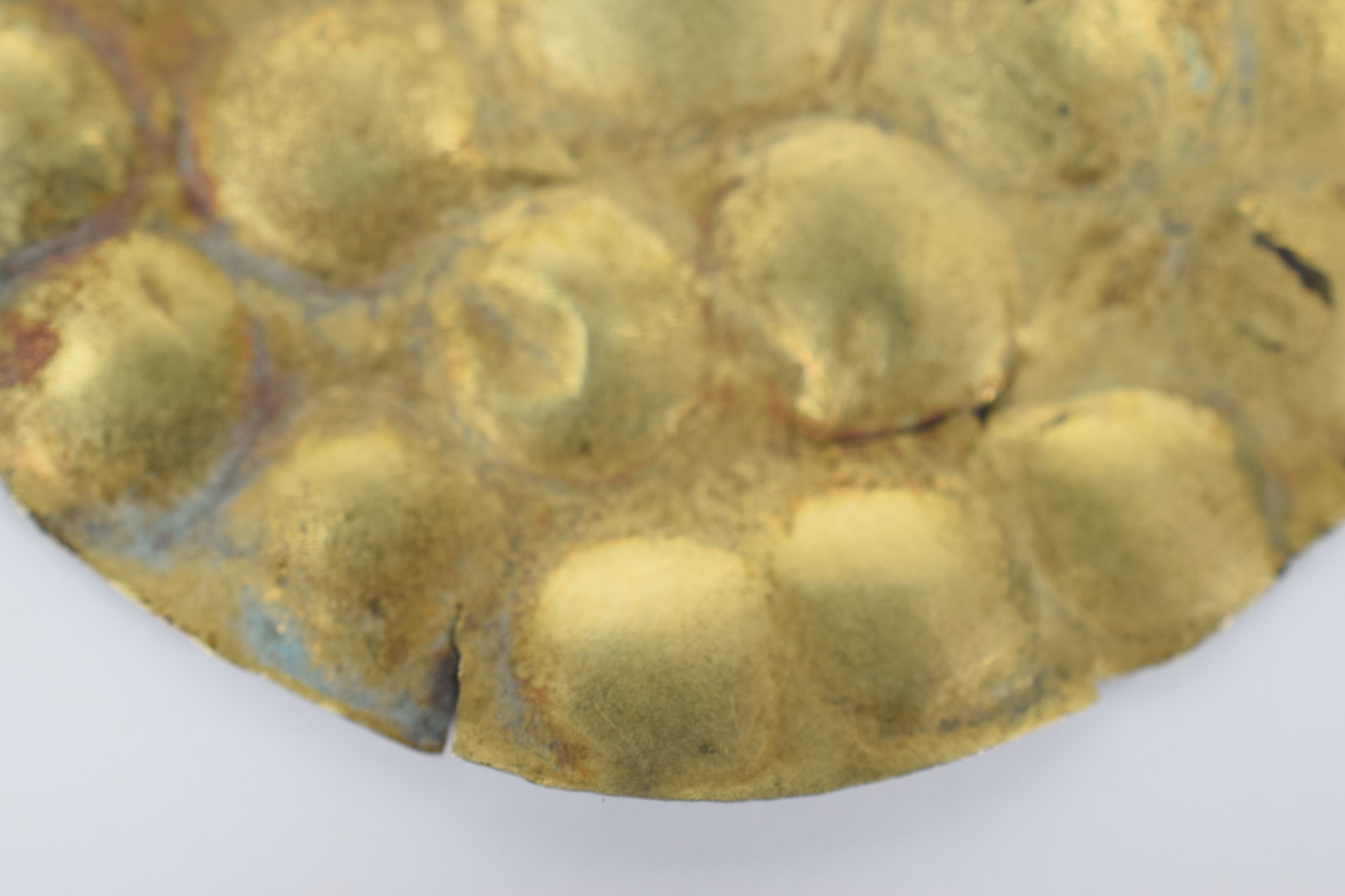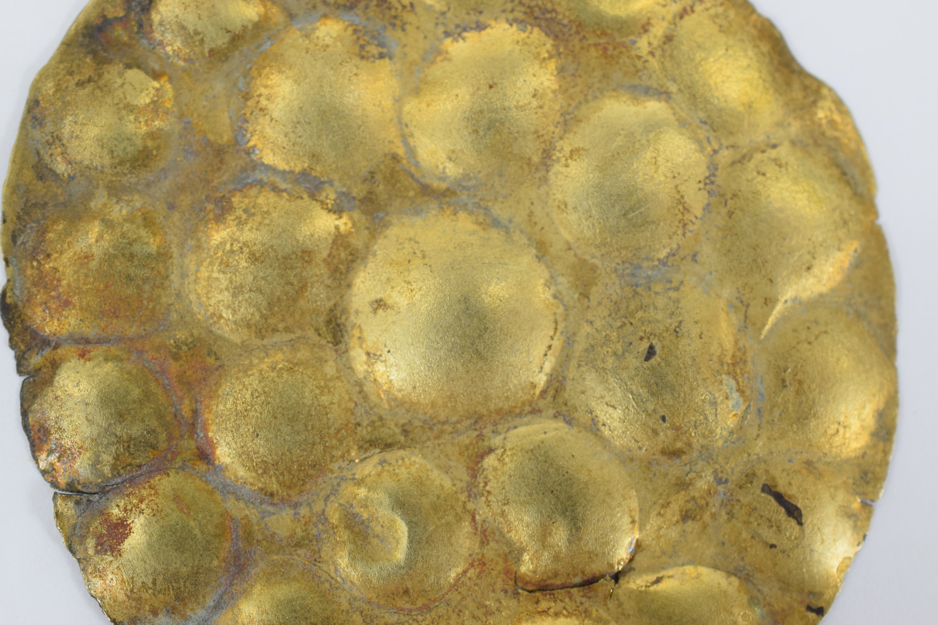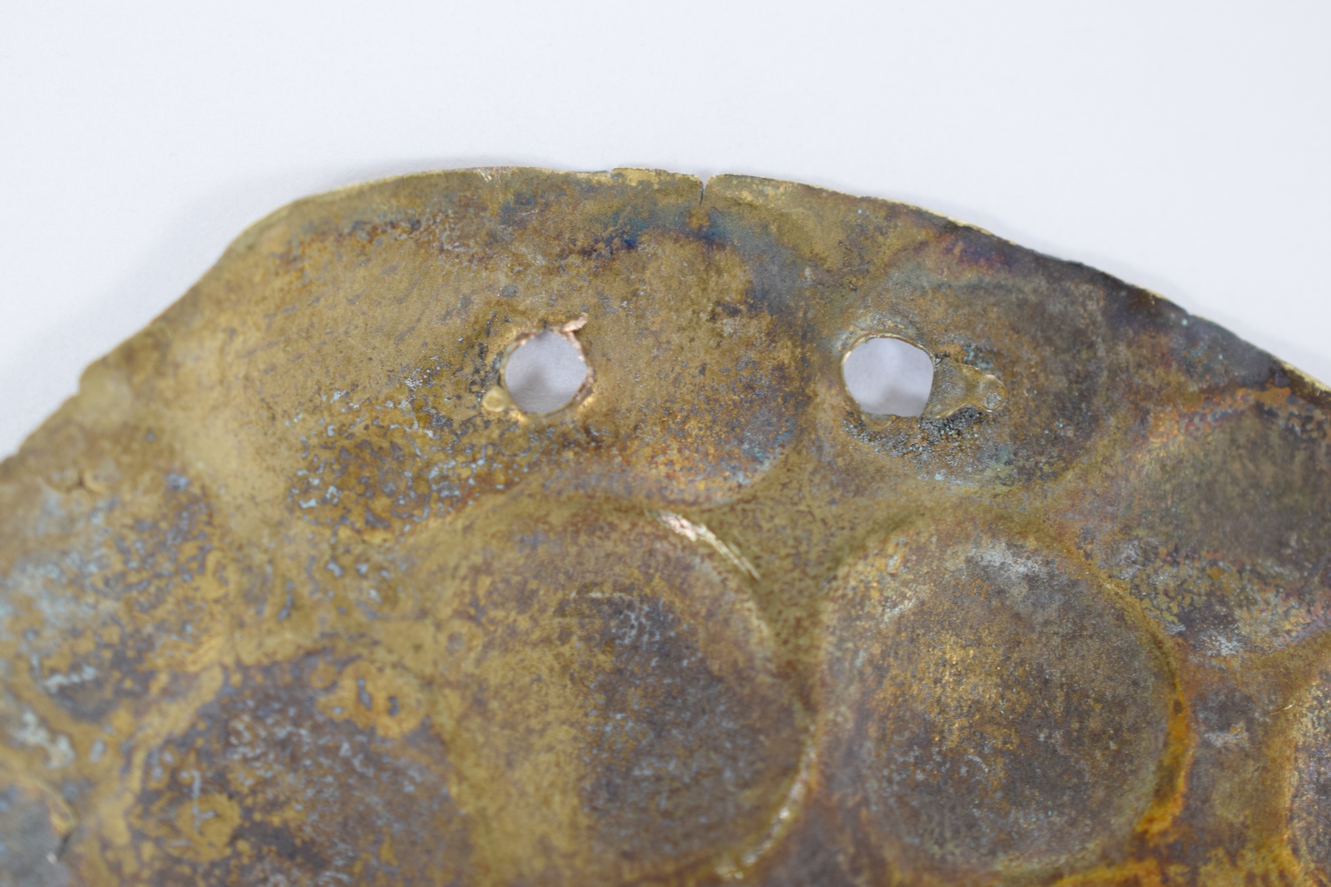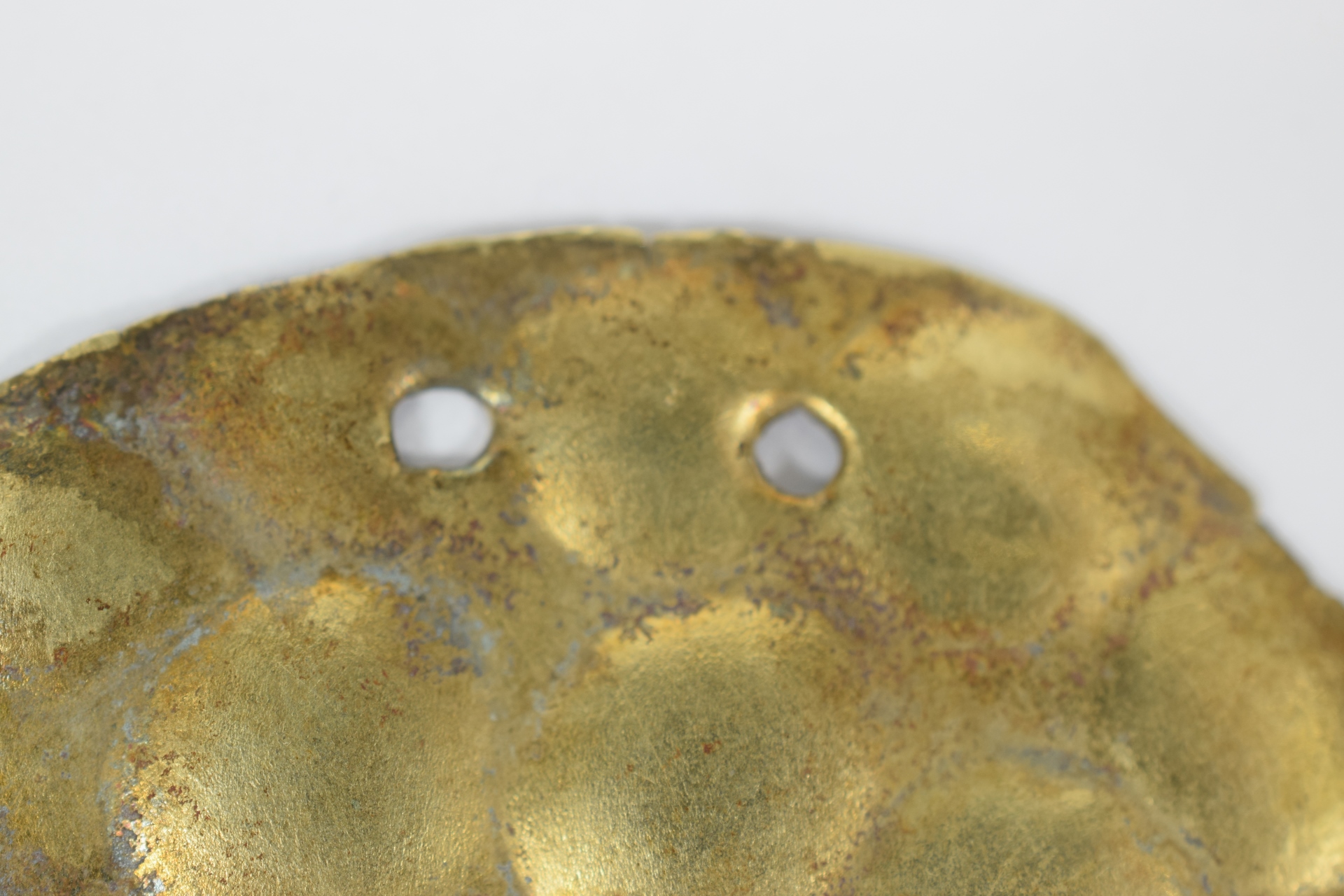 Ancient gold over silver pendant. Origin: Peru Age: 1250-1500 A.D. Measures approximately 2 in Diameter. Weighs 1.6g.