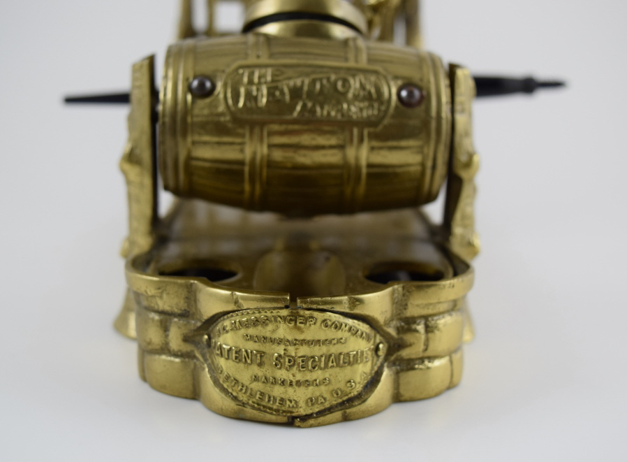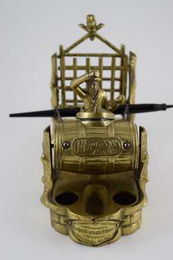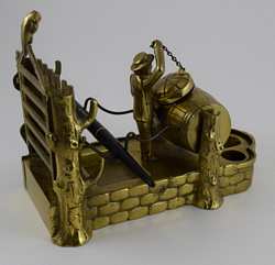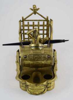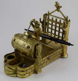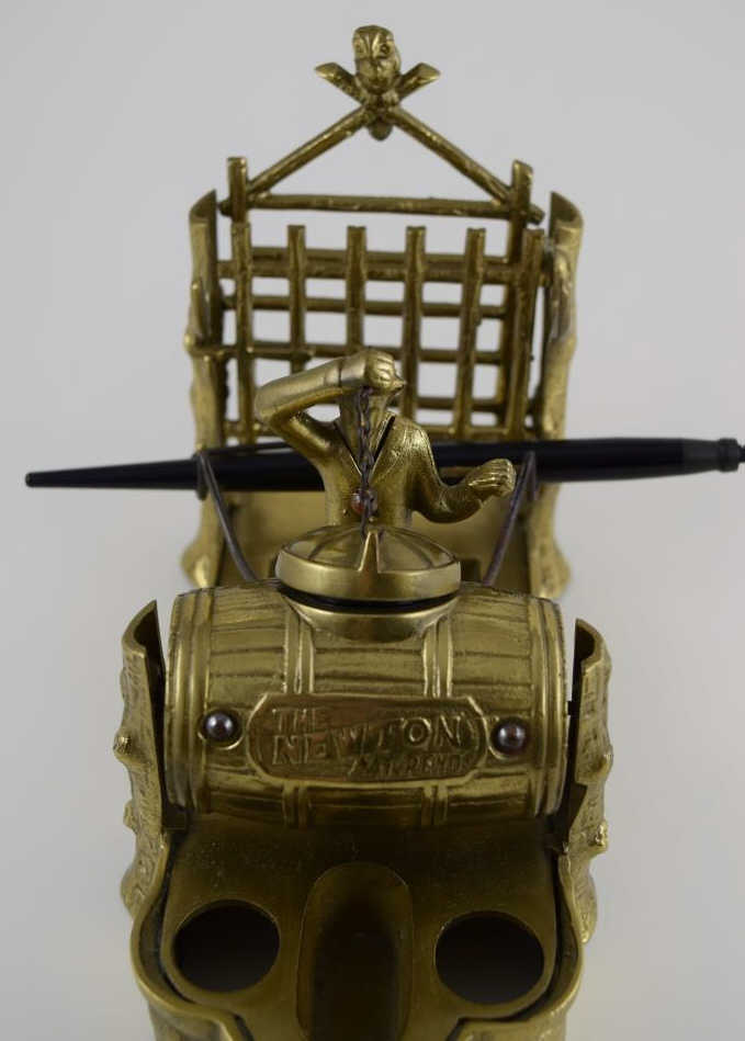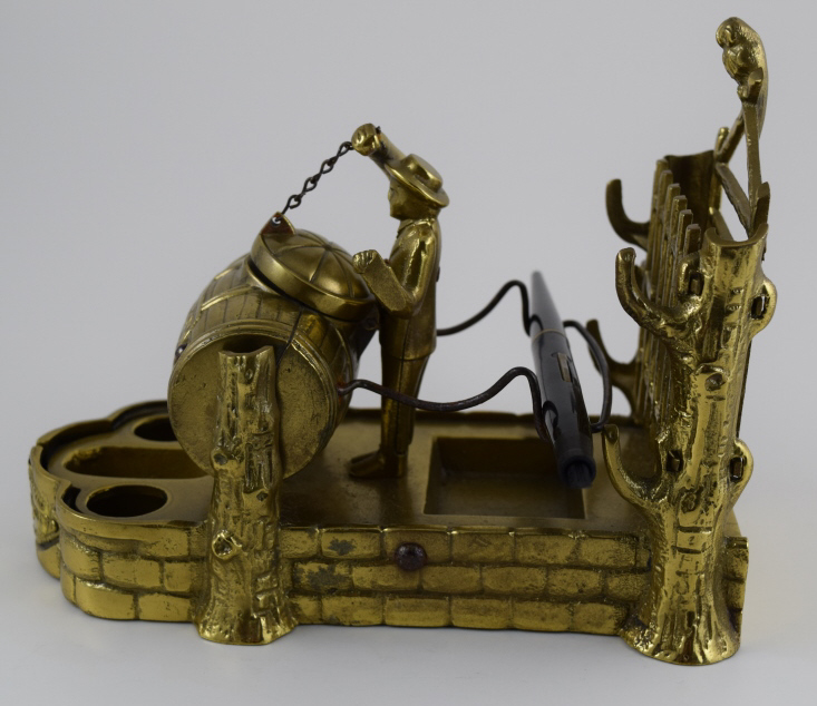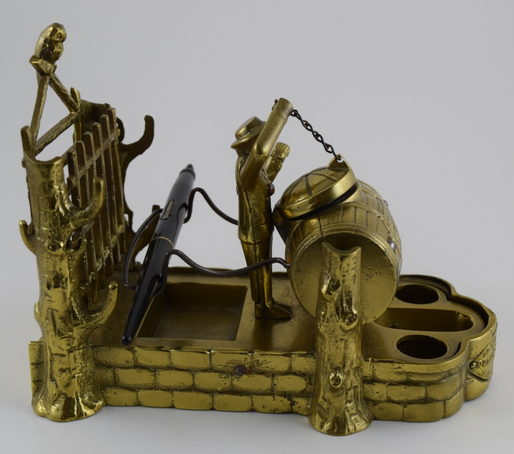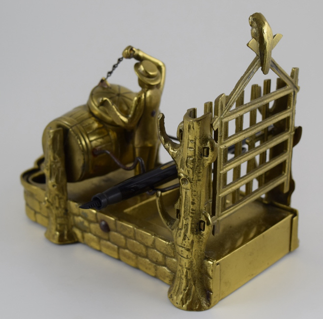 First half 20th century great desk set manufactured so that, when the pen is picked up, the barrel rolls forward for access to the inkwell. Removable fence, with owl atop, to store paper. Tree branches form hooks tohold additional pens. Pen included, although perhaps not original. Marked "THE NEWTON / PAT. PEND" and "J.C. Messinger Company Manufactures Patent Specialties Marketers Bethlehem, Pa. USA". Measures 8" (20.3cm)long x 4" (10.2cm) wide x 6" (15.2cm) high. Weighs 3lbs, 5 oz. THIRD PARTY SHIPPING REQUIRED
