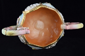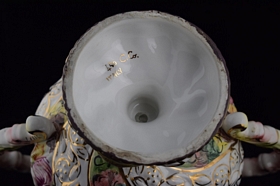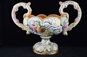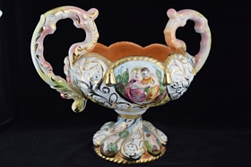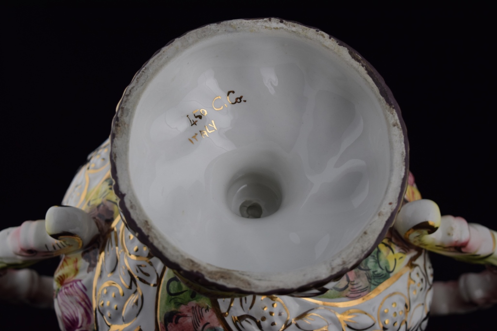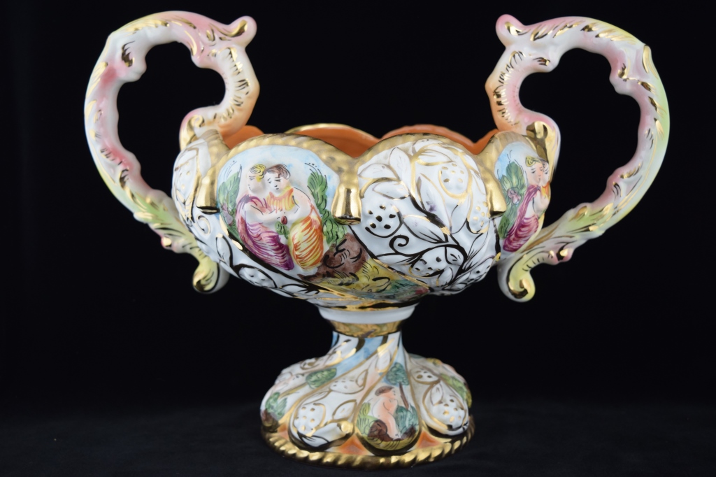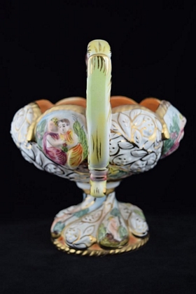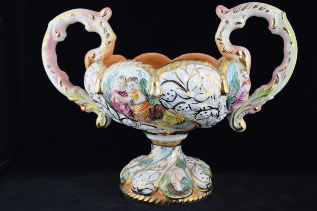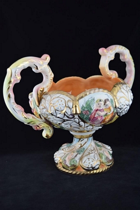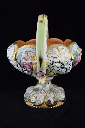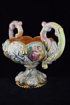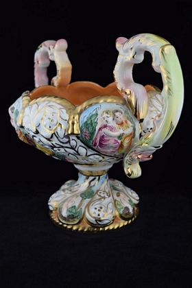 Depicting lovers in flower fields, cupids, gold floral design and gilt trim throughout. Signed "450", "C. Co.", and "Italy" in gold to bottom. Capodimonte Majolica style. Measures 14" L x 10" W x 11 " H. Weighs 1lbs, 2oz.