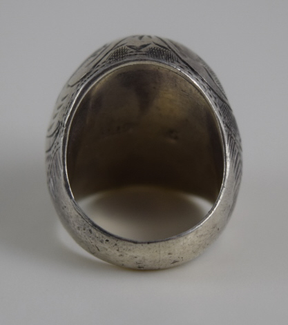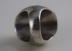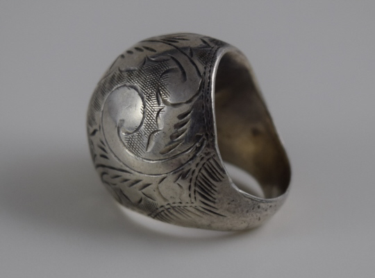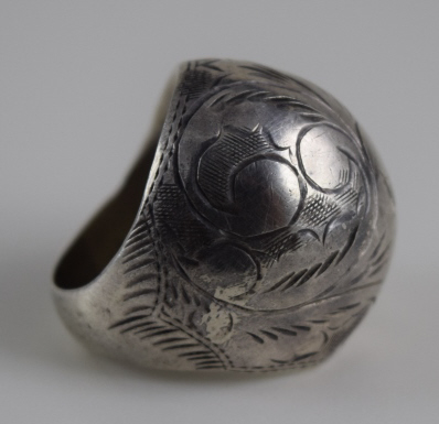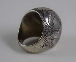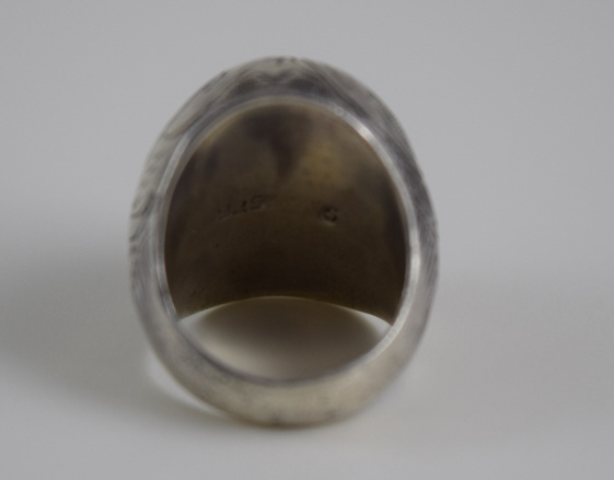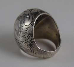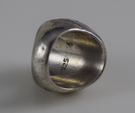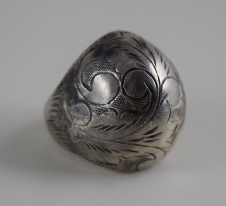 Hand-etched with a floral and leaf motif. Hallmarked "925" and "6". Ring face approx 1" (2.54cm) long x 3/4" (1.9cm) wide x 1/2" (1.27cm) deep. Ring size 6-6.5. Weighs 6.8g. U.S. SHIPPING $15 PLUS INSURANCE