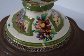 Flower bouquets, plant life, and gold gilt throughout the pierced porcelain urn. Capodimonte Majolica style. Urn itself measures 17" H (+3" base and light fixture finial to top) x 12" W x 7" W (base is 9" W) . Weighs 7lbs.