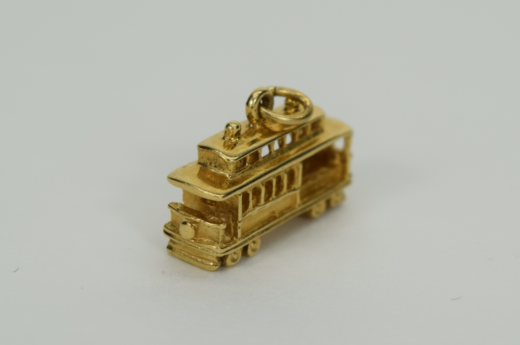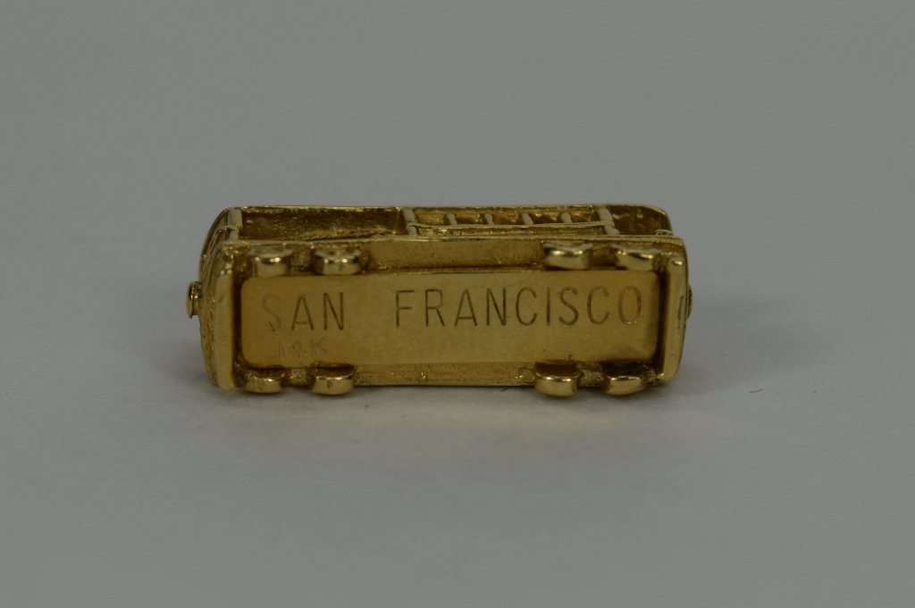 Heavy figural cable car in detail. Measures 3/4" L x 1/4" W x 1/2" H + jump ring. Hallmarked "San Francisco" and "14K" to bottom. Weighs 4.5g.