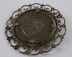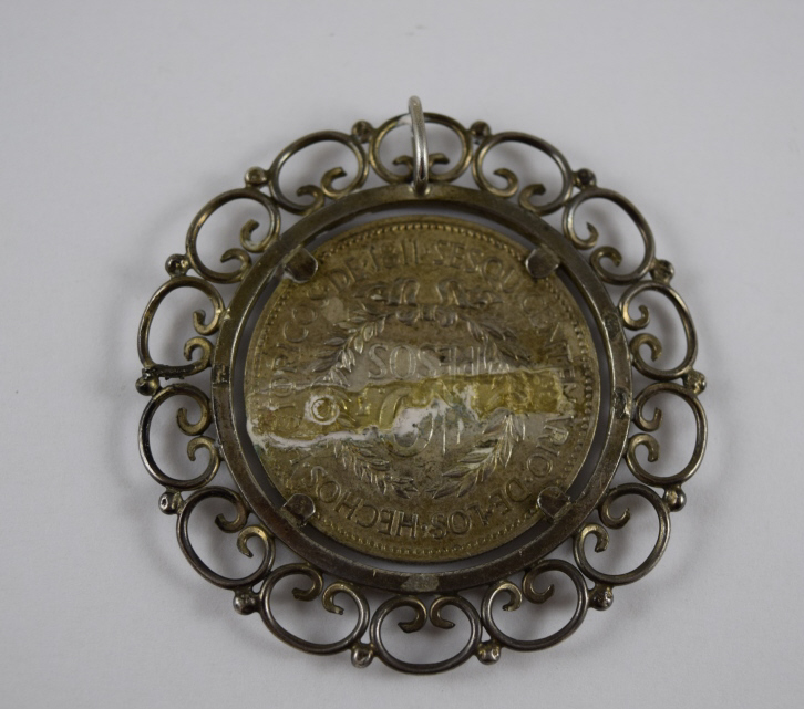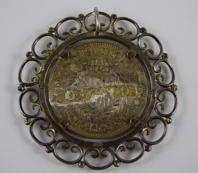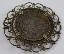 Beautiful sterling silver pendant mounted around a 90% silver 1961 "Sesqui of Revolution against Spain" coin. Obverse: M.G. Rizzello bust facing right with hat. Reverse: Value within wreath. Measures 2"(5.08cm) in diameter. Weighs 22.6g (.73 ounces troy). U.S. SHIPPING $15 PLUS INSURANCE