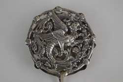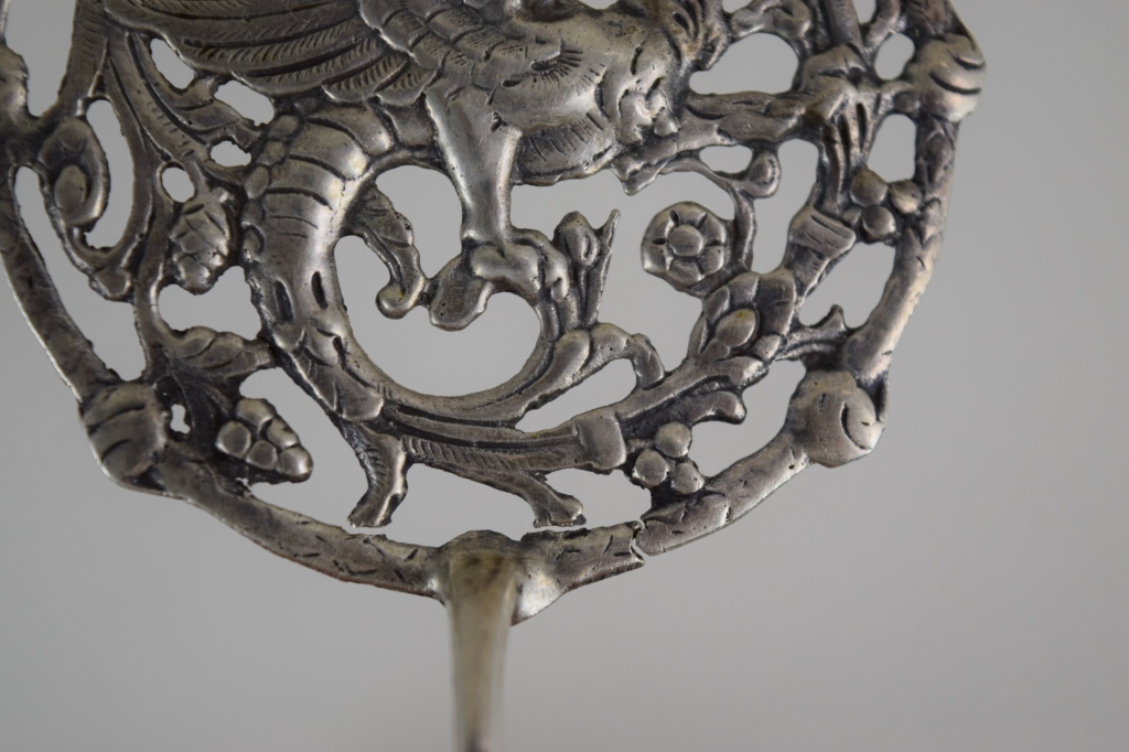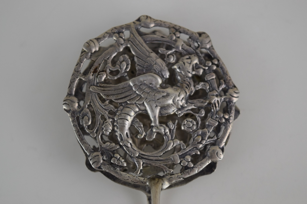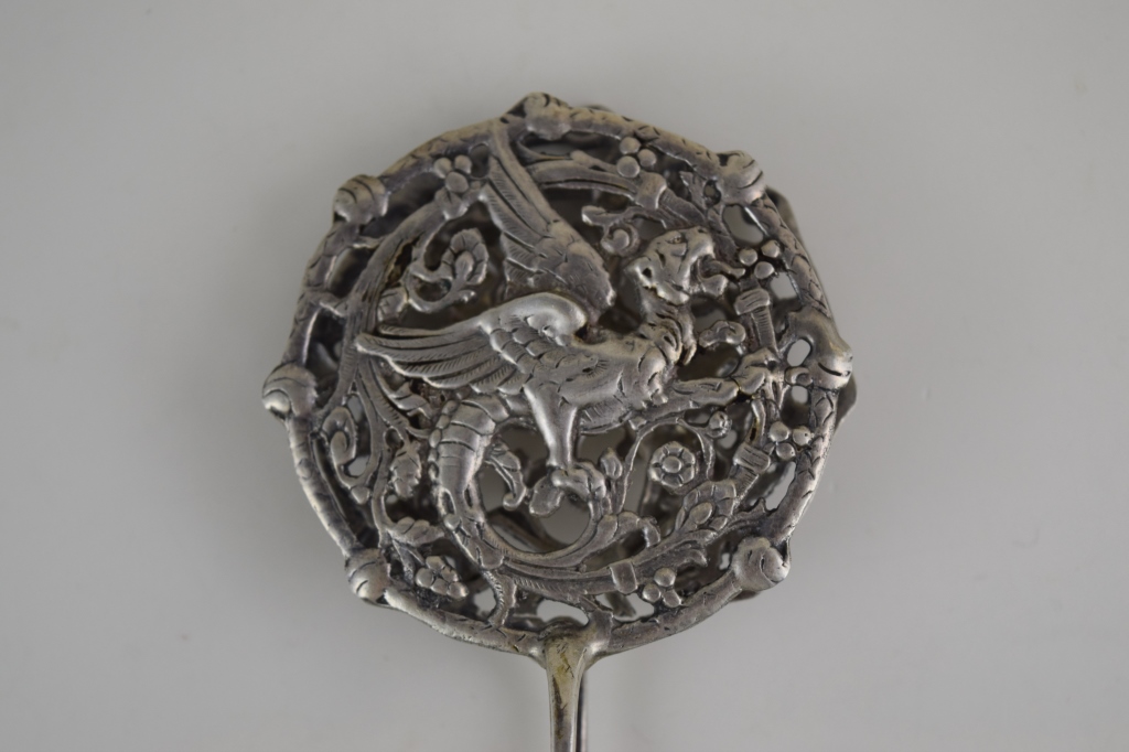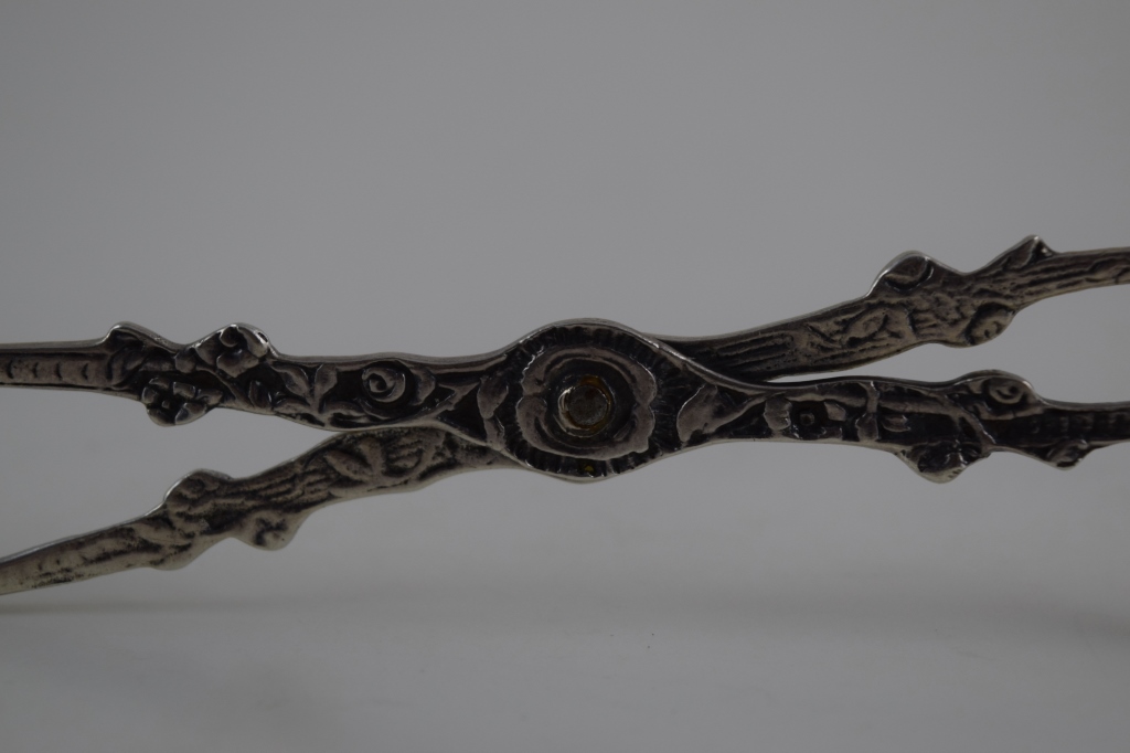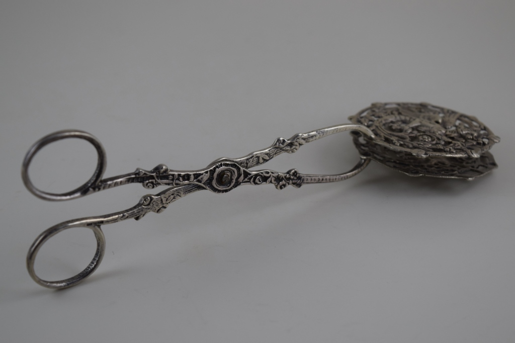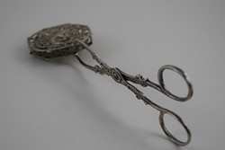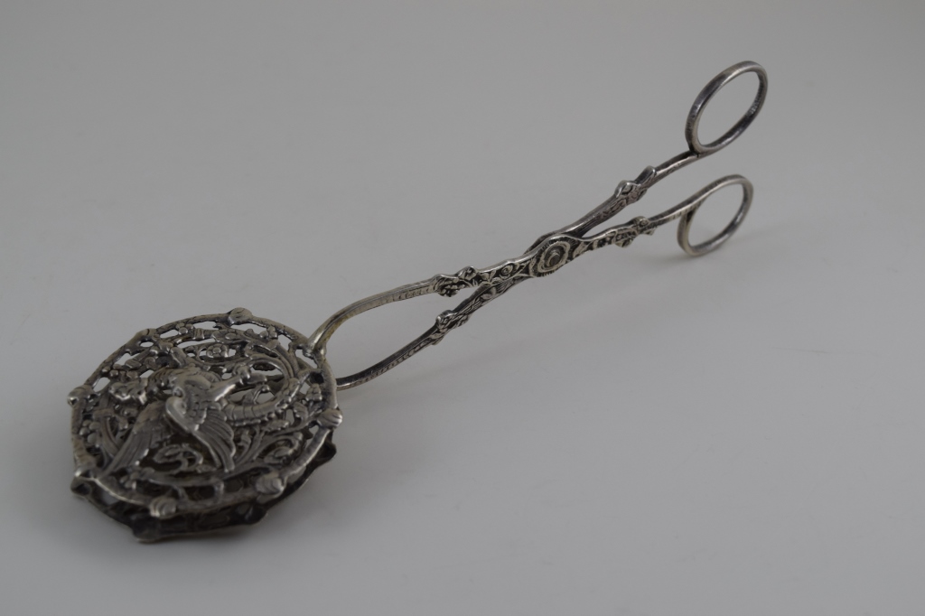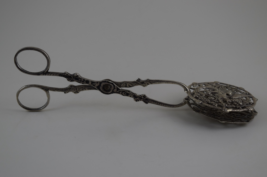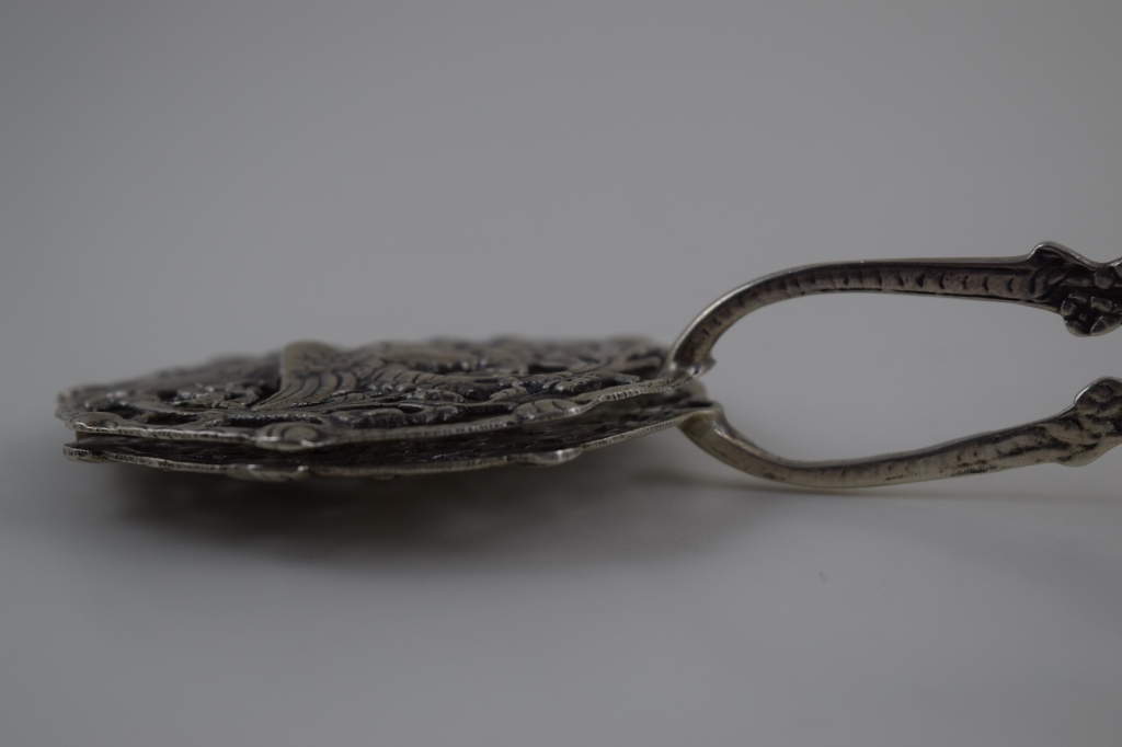 Beautiful Griffin tongs. Measures 8" (20.3cm) long x 2 1/2" (6.3cm) wide. Weighs 76.8g. (2.5 ounces troy). U.S. SHIPPING $15 PLUS INSURANCE