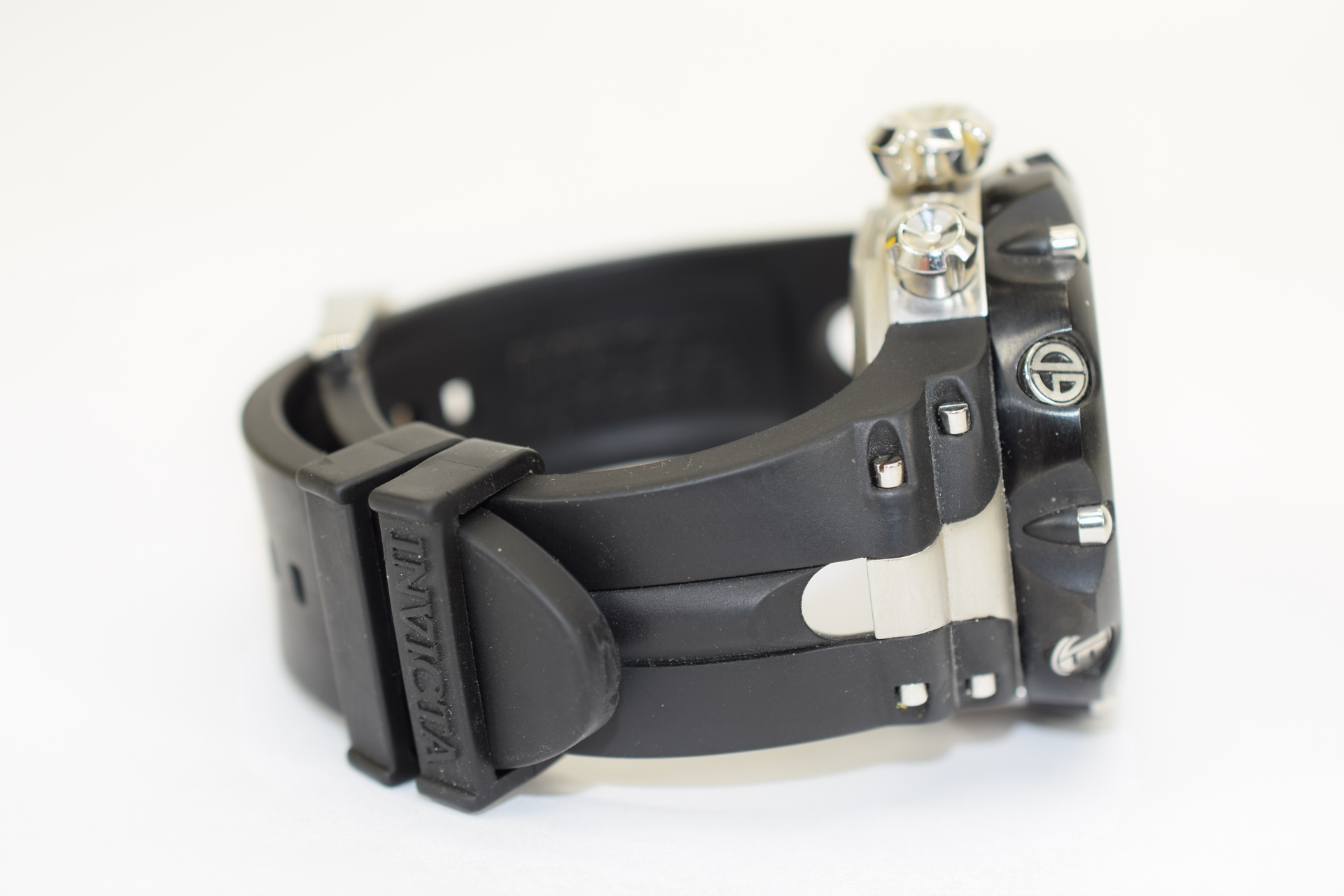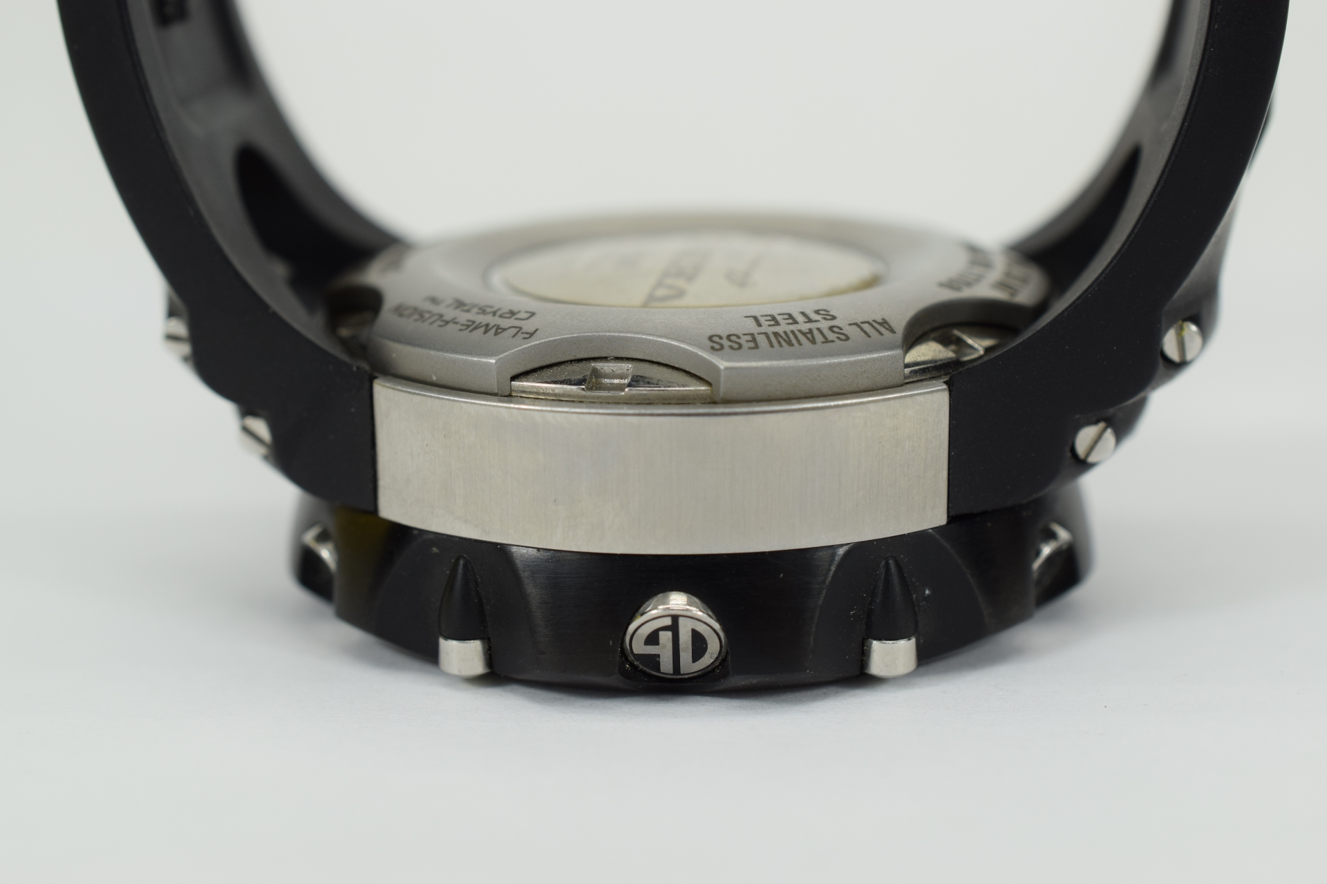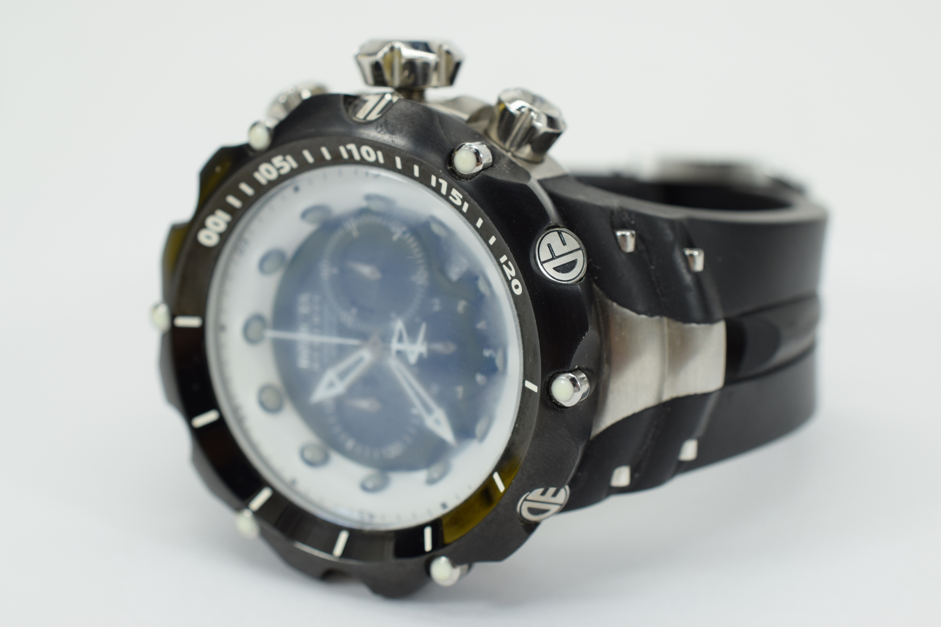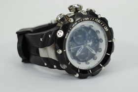 Venom II Swiss Collection Chronograph watch. Water resistant to 660 feet (200 M): suitable for recreational scuba diving. Black stainless steel case measures 53mm diameter by 22mm thick. The Invicta Flame Fusion crystal protects the precise Quartz movemen Measures approx. 11-1/2” L (including face and adjustable buckle). Weighs approx. 8oz.