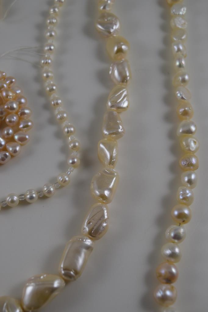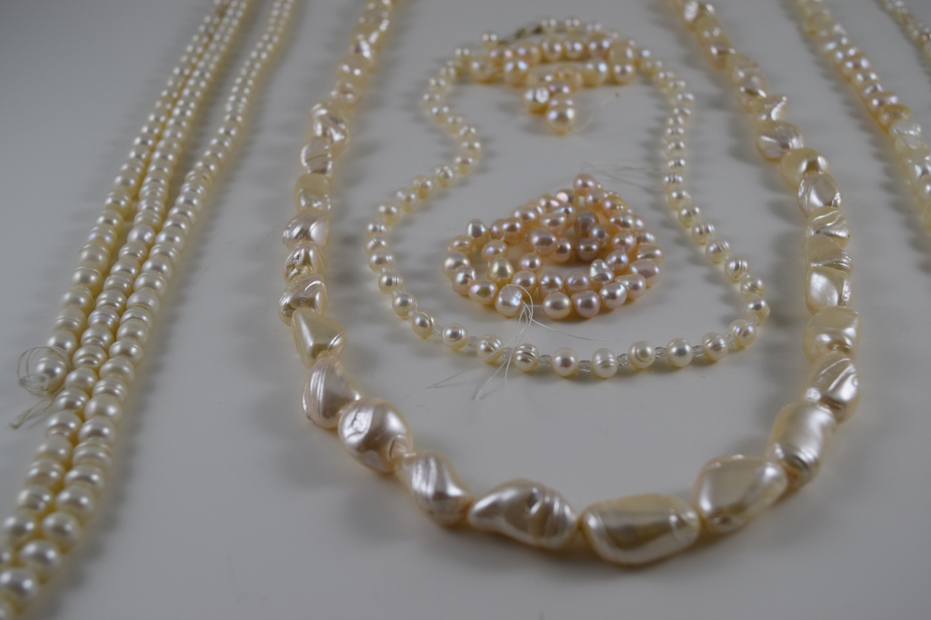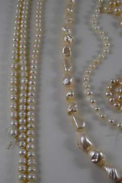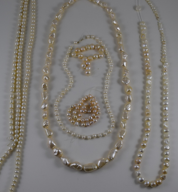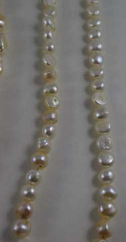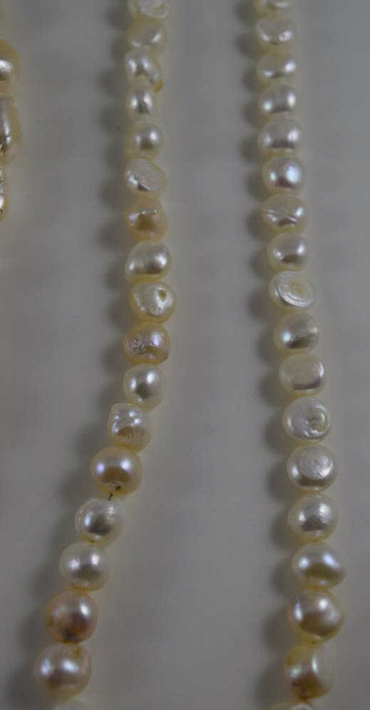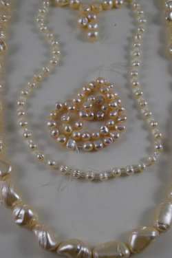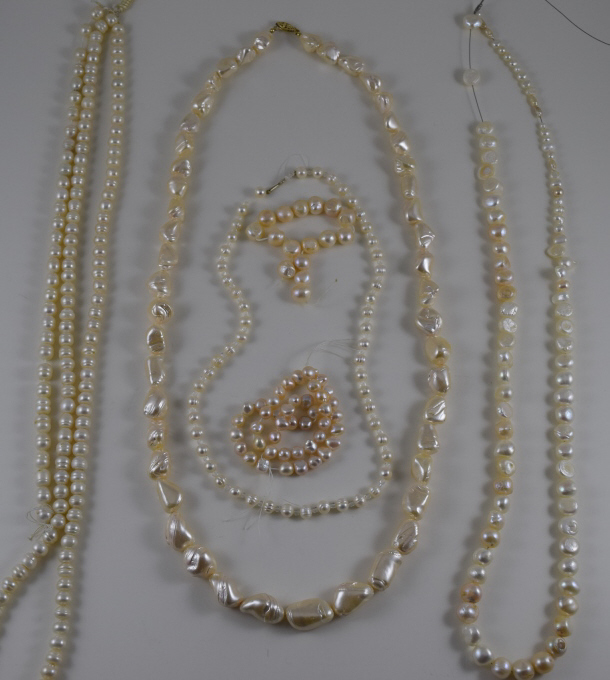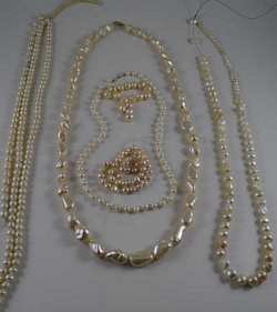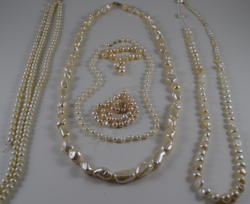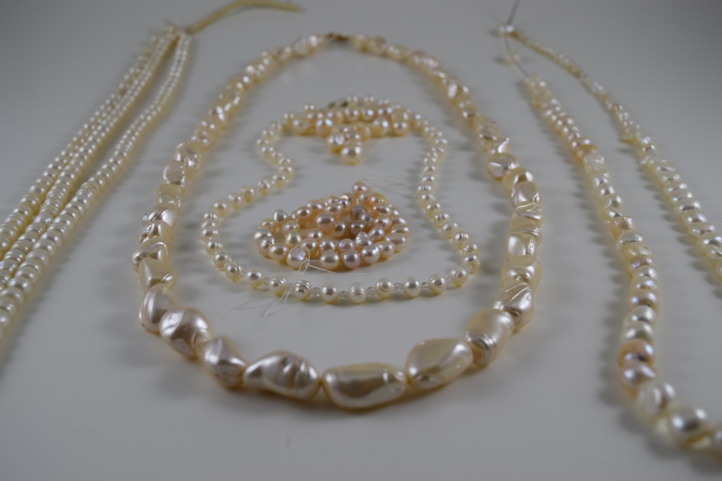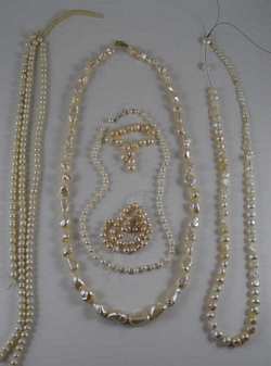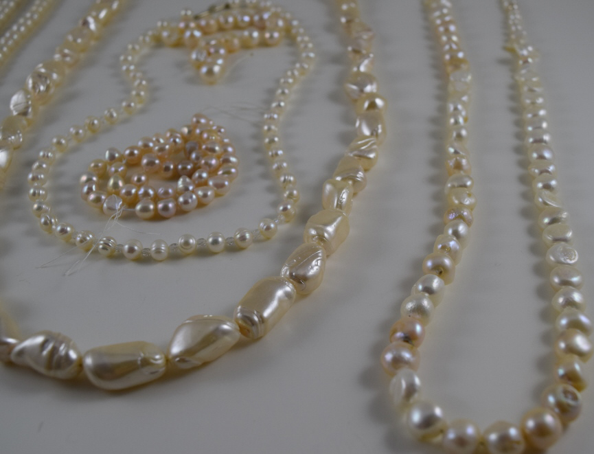 Mallorca/Majorca baroque pearl strands from Spain with certificate and others. One complete large baroque necklace. Three long broken sections, great to re-string. Necklace 30” (76.2cm). Total weight 15oz. U.S.SHIPPING $15 PLUS INSURANCE