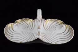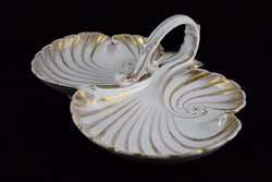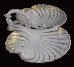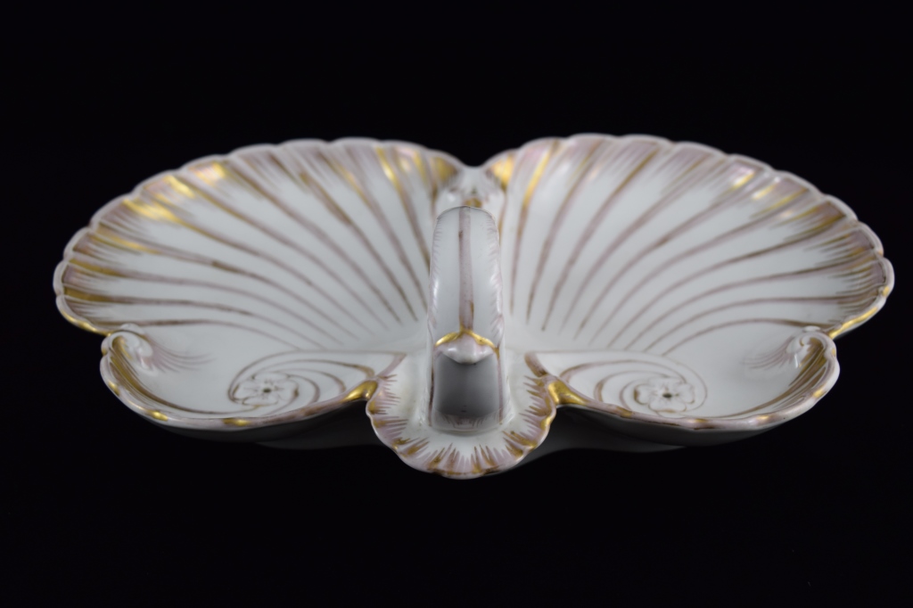 Beautiful KPM scalloped divided serving dish. Gold gilt and floral motif to double shells. KPM scepter and KPM orb "KOENIGL. PORZELLAN MANUFAKTUR" (with Eagle) to bottom. Measures 12" (30.5cm) long x 8" (20.3cm) wide x 4"(10.2cm) high. Weighs 1lbs., 15oz. THIRD PARTY SHIPPING REQUIRED