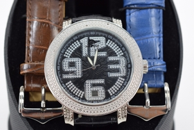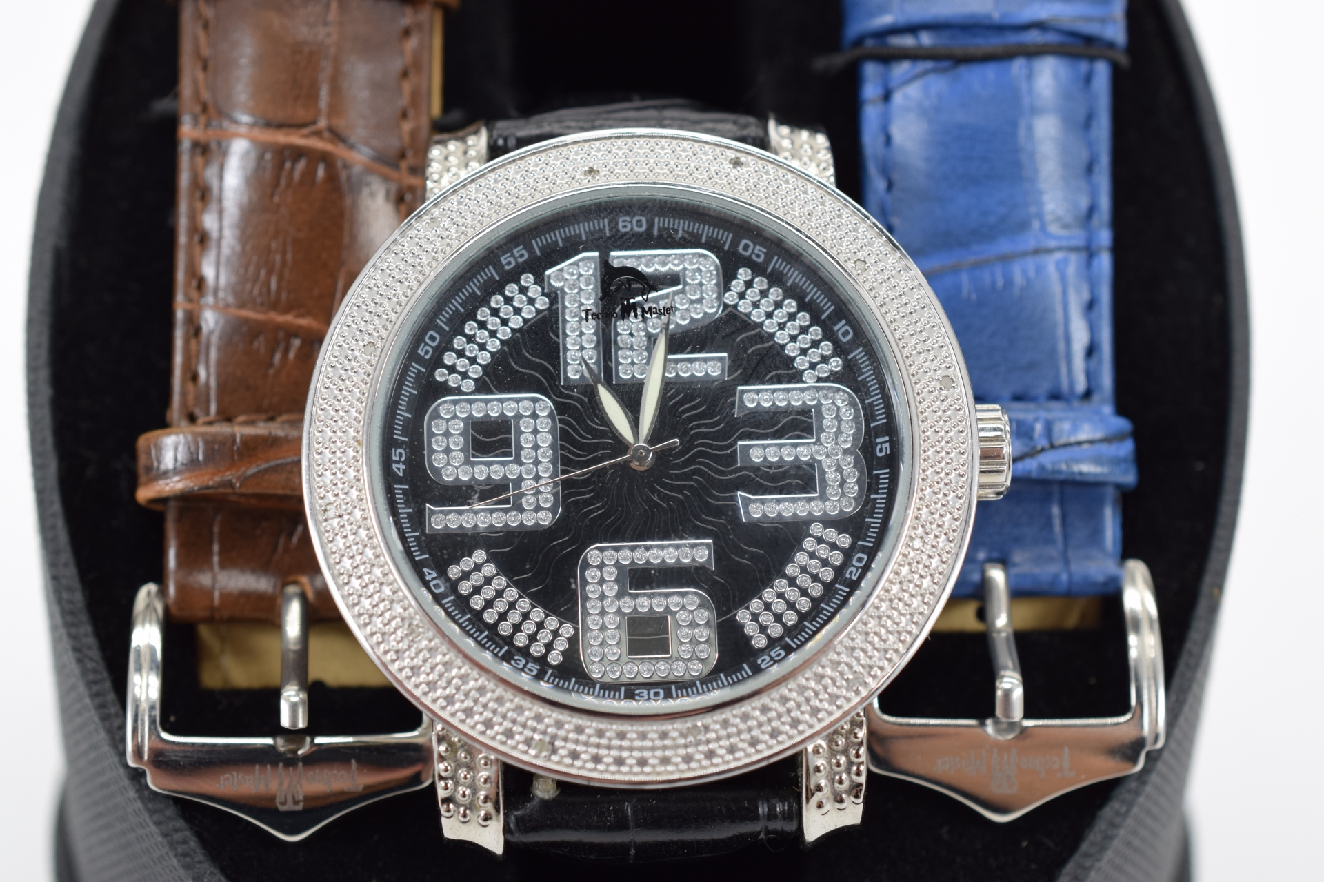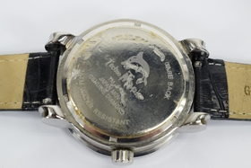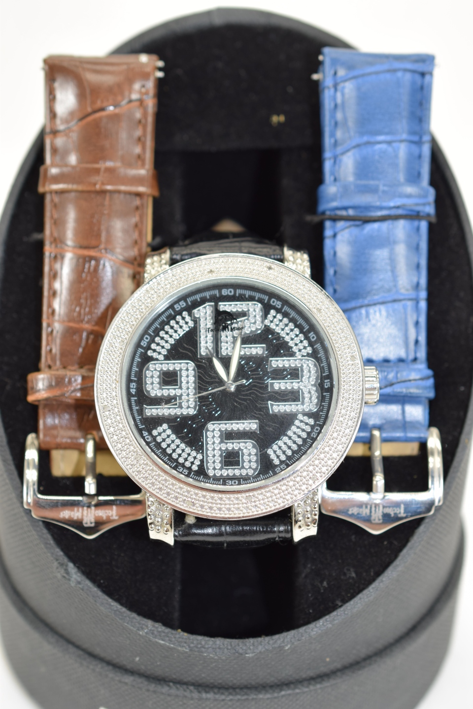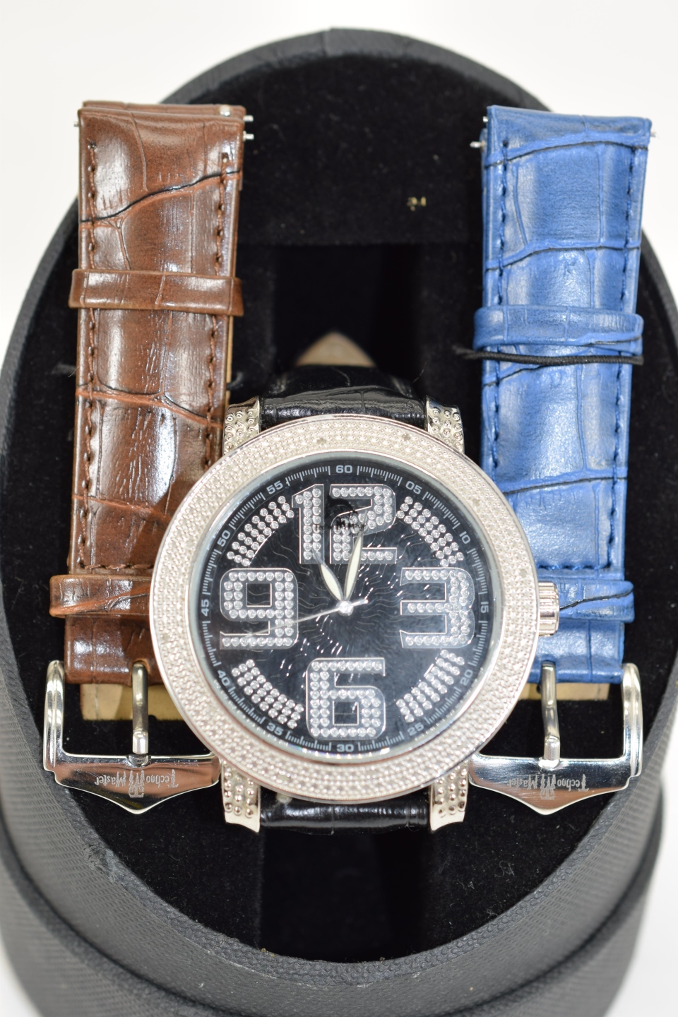 Stainless Steel Quartz Men's Watch. Comes in original presentation box with 2 extra bands/straps. Face measures approx. 2” diameter. Bands approx. 8-1/2” L (with buckle). Weighs approx. 12oz (in case).