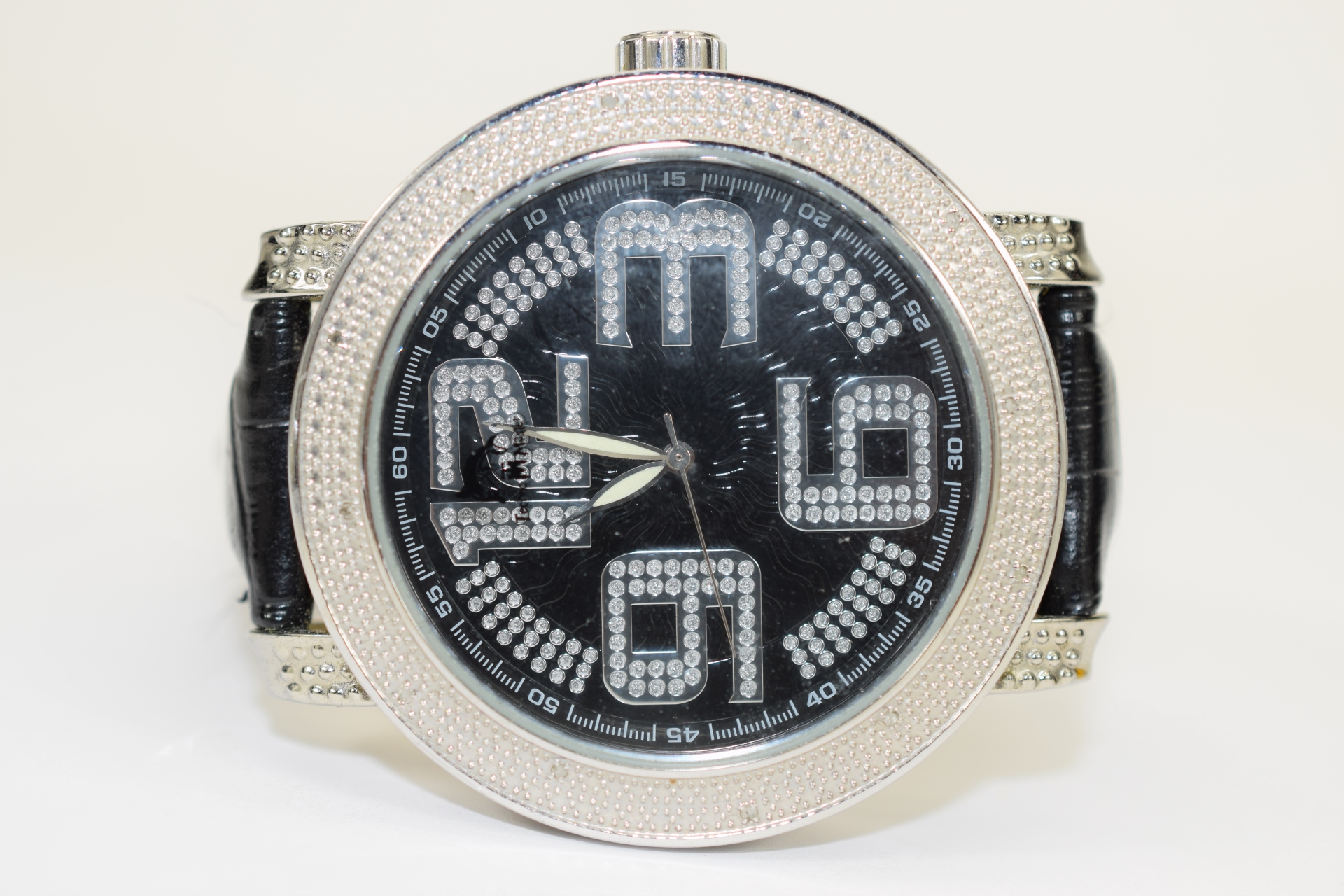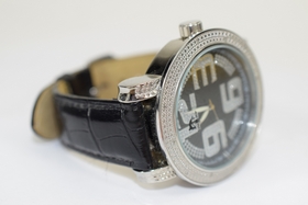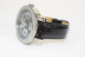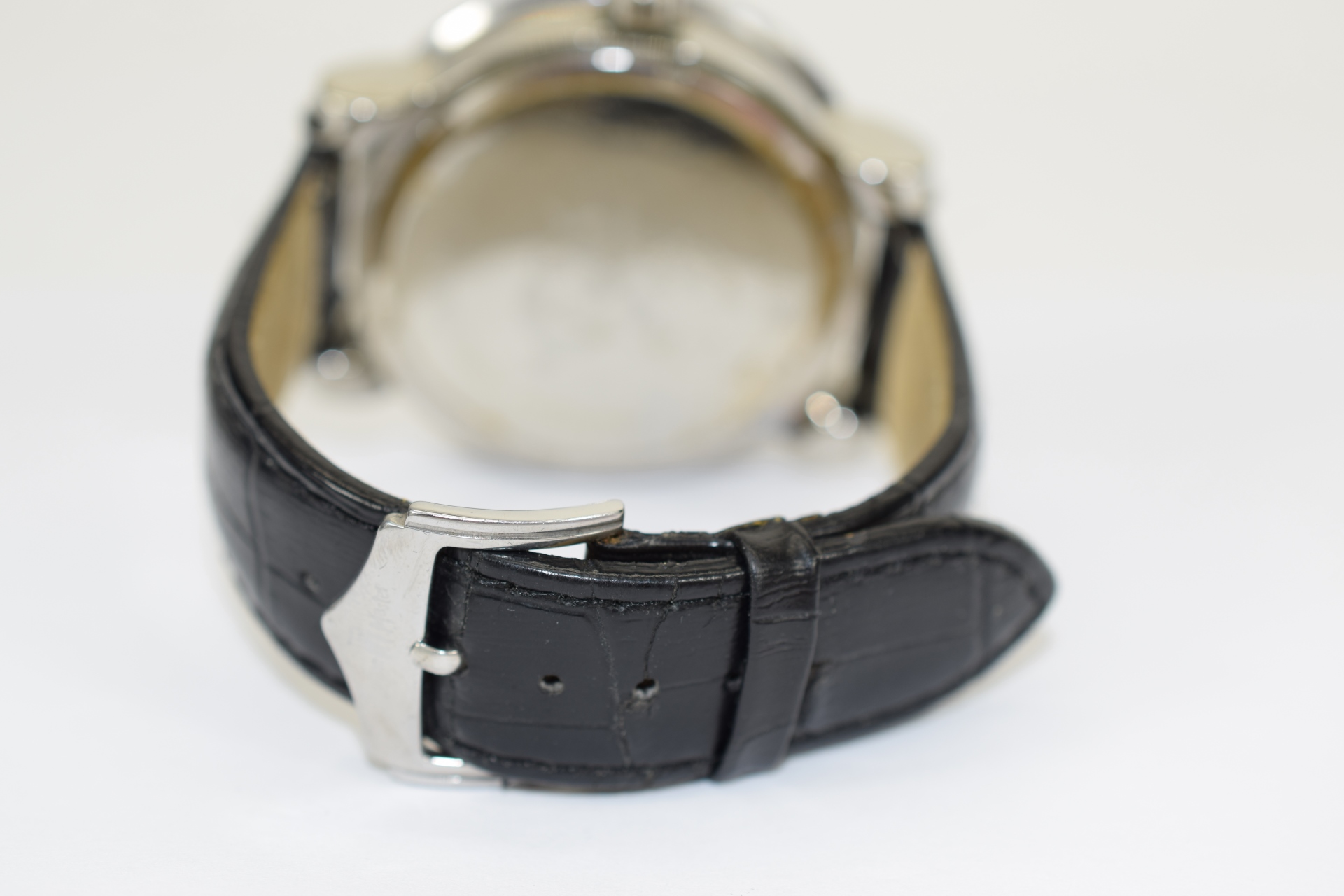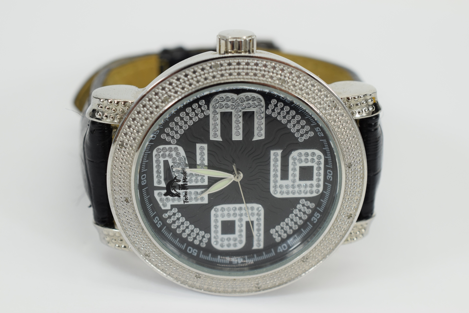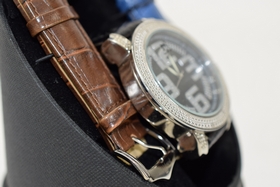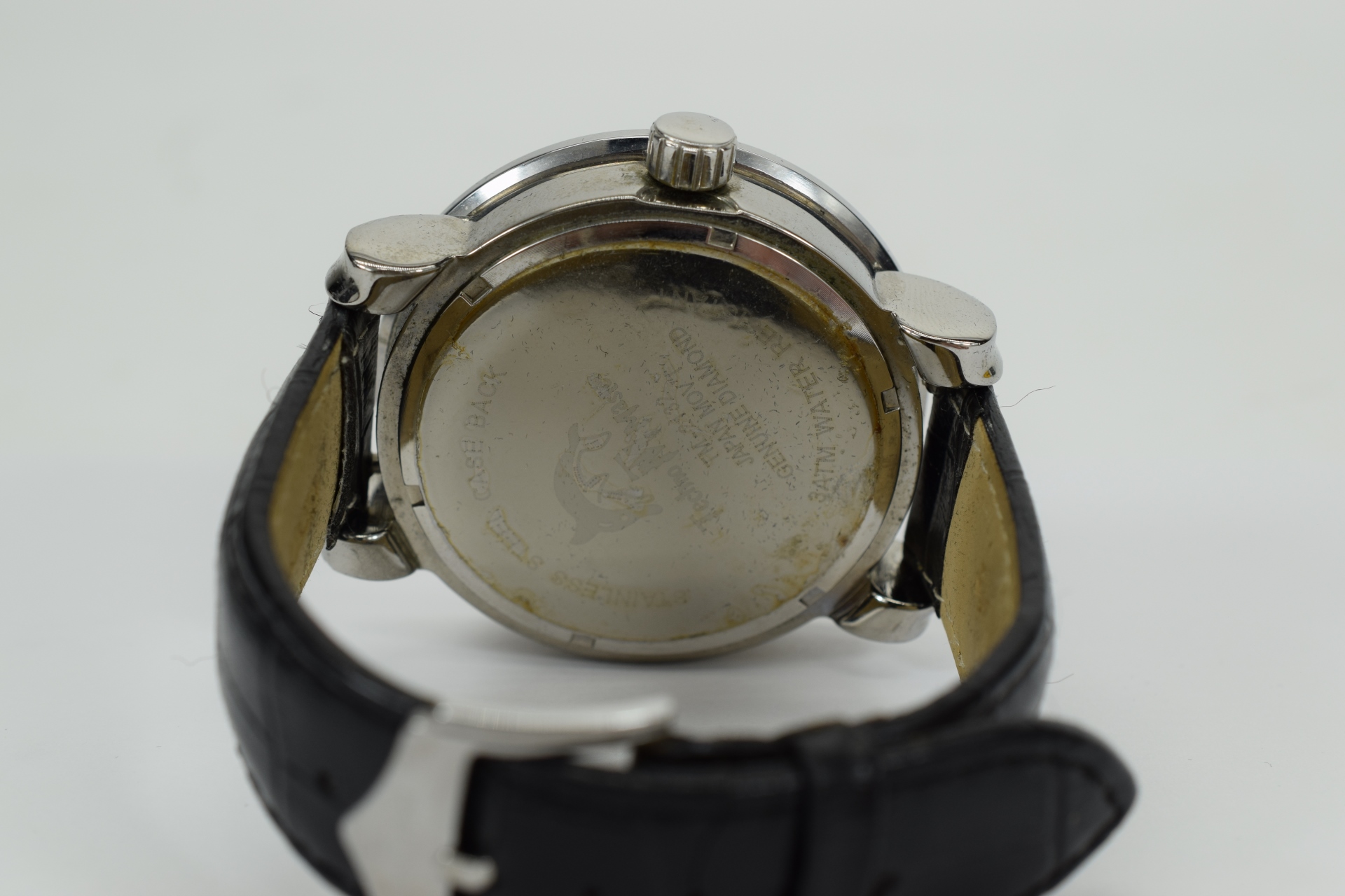 Stainless Steel Quartz Men's Watch. Comes in original presentation box with 2 extra bands/straps. Face measures approx. 2” diameter. Bands approx. 8-1/2” L (with buckle). Weighs approx. 12oz (in case).