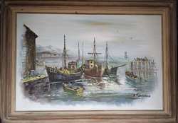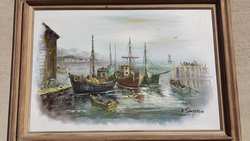 A beautiful harbor boat scene oil on canvas. Depicting boats anchored in the harbor with surrounding villages. Frame measures 31" (78.7cm) high x 43" (109.2cm) wide. THIRD PARTY SHIPPING REQUIRED.