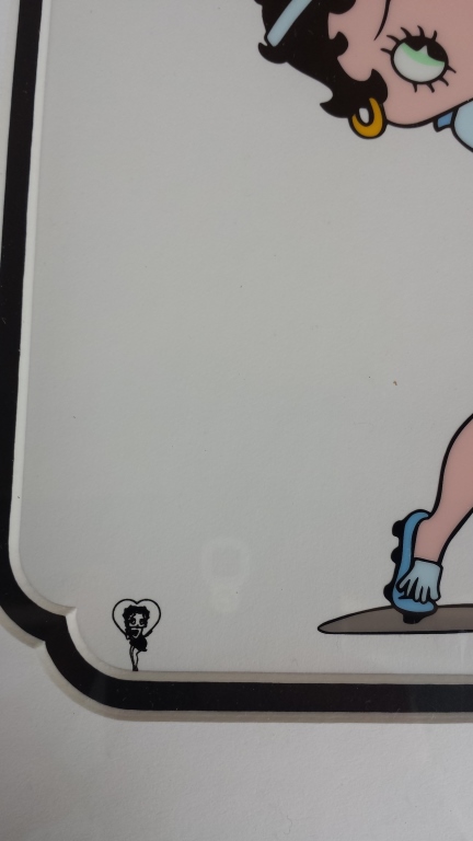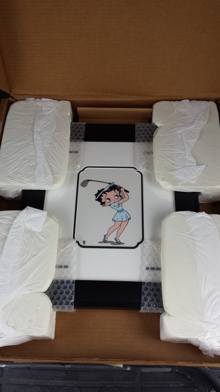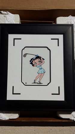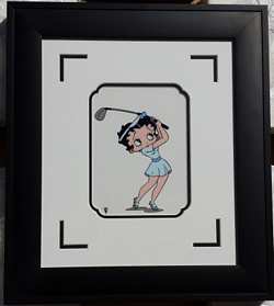 A limited edition Betty Boop "Golf Mini" Cel. Depicting Betty Boop playing gold. Sericel with color background. From the original limited edition of 9500. Certification marl from King Features Syndicate, Inc./ Fleischer Studios. Copy of certificate of authenticity & appraisal included (appraised value $320). Museum quality mat and framing, stored in fitted box (included). Work itself measures 8'' (20.3cm) high x 6'' (15.3cm) wide. Framemeasures 17" (43.2cm) high x 15" (38.1cm) wide. THIRD PARTY SHIPPING REQUIRED.