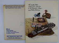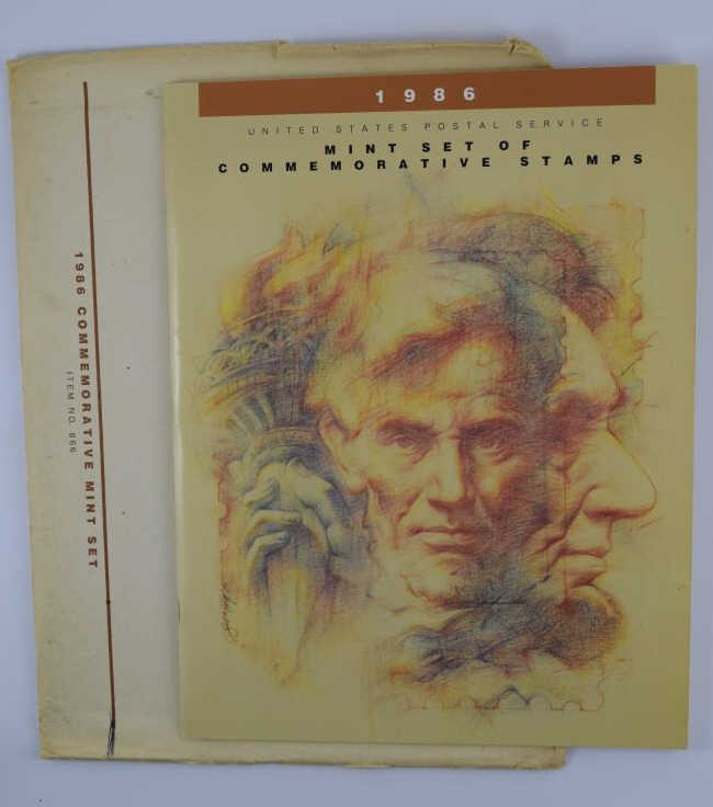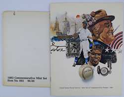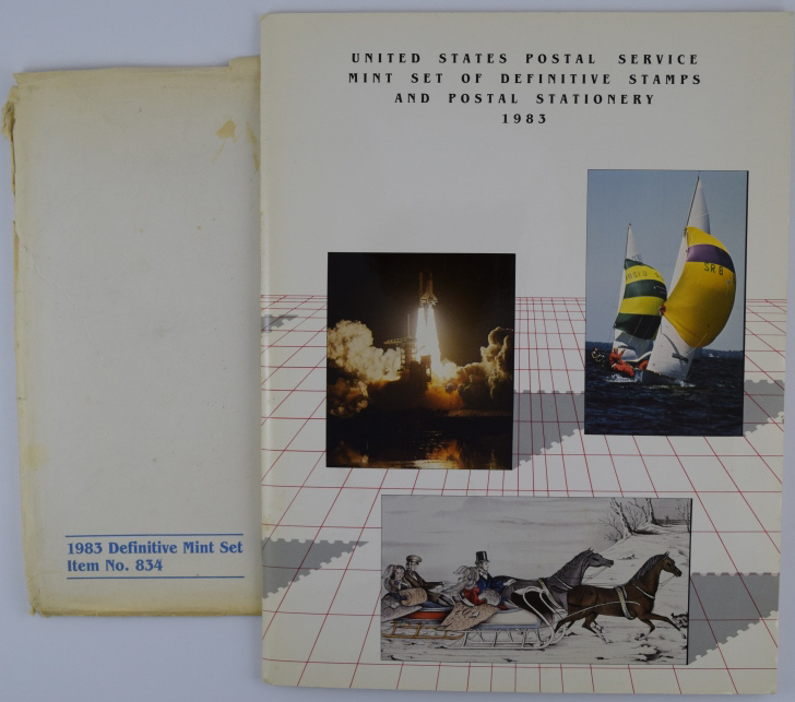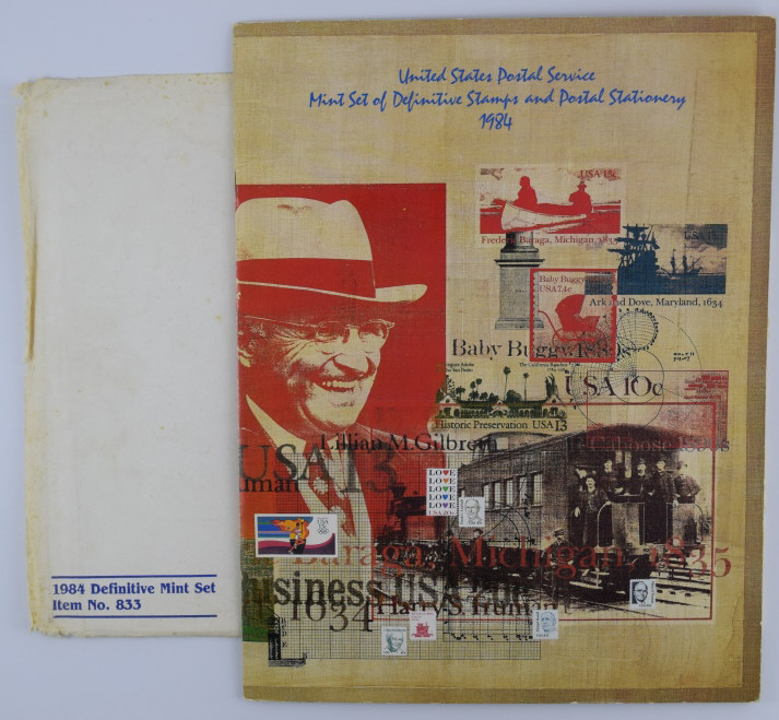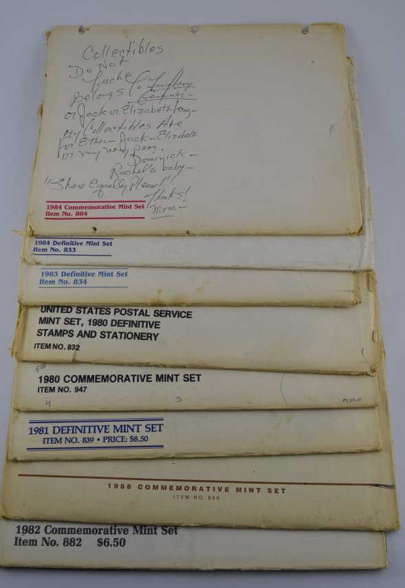 Includes: 1982 Commemorative Mint set (item 882, $6.50), 1986 Commemorative Mint set (item 866), 1981 Definitive Mint set (item 839, $8.50), 1980 Commemorative Mint set (item 947), 1980 Definitive Mint set (item832), 1983 Definitive Mint set (item 834), 1984 Definitive Mint set (item 833), and 1984 Commemorative Mint set (item 884). Measures 12" (30.4cm) long x 9" (22.3cm) wide x 1" (2.54cm). Weighs 2lbs., 14oz. THIRD PARTYSHIPPING REQUIRED