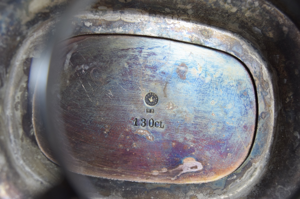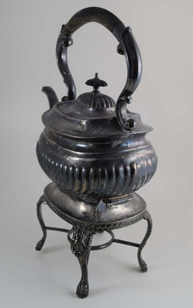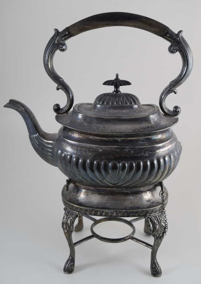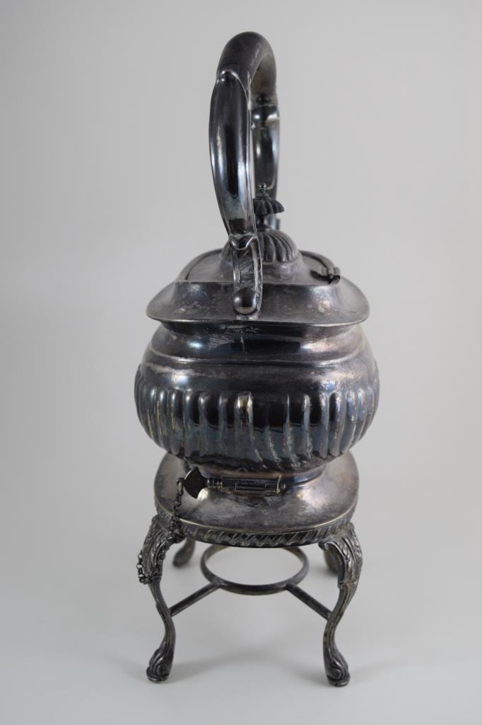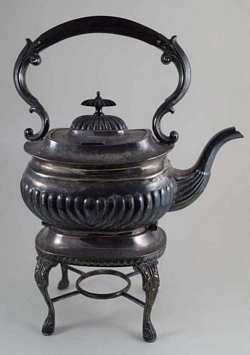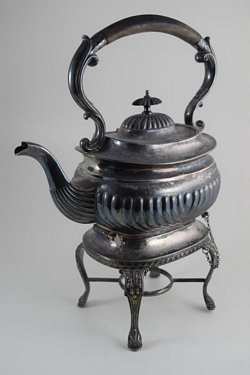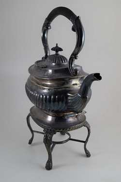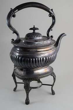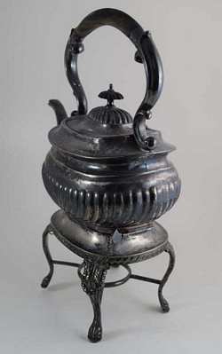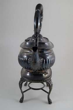 Silver Plate teapot or coffee. It appears that pulling one pin will allow for tilting pour, removing 2 pins allows for complete removal from base. Measures 13 1/2" (34.3cm) high x 10" (25.4cm) wide x 5 1/2"(13.9cm)(13.9cm) deep. Weighs 2lbs., 10oz. THIRD PARTY SHIPPING REQUIRED