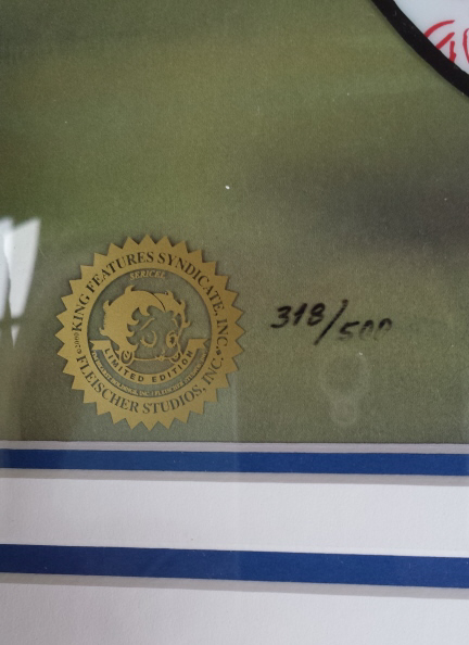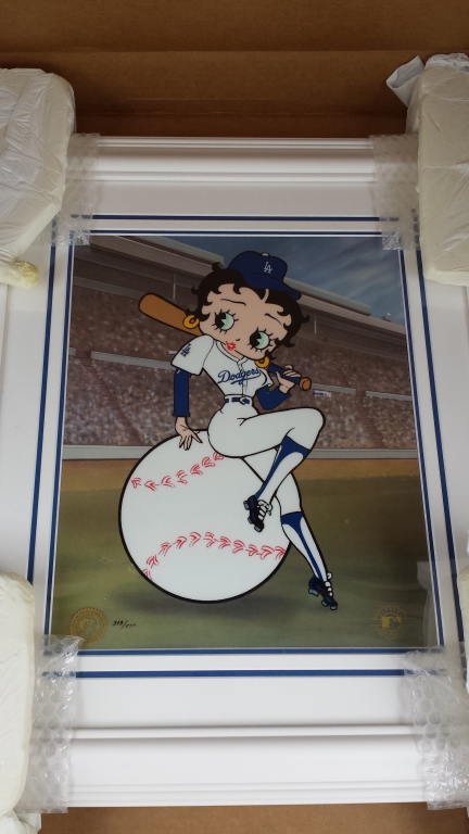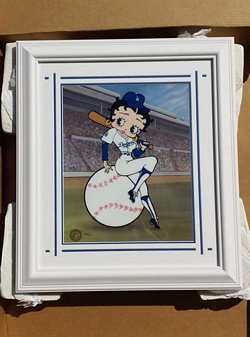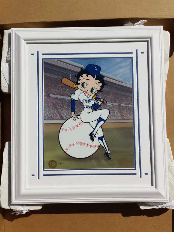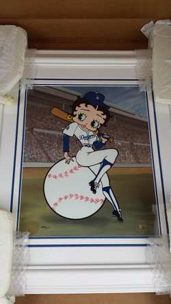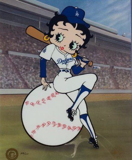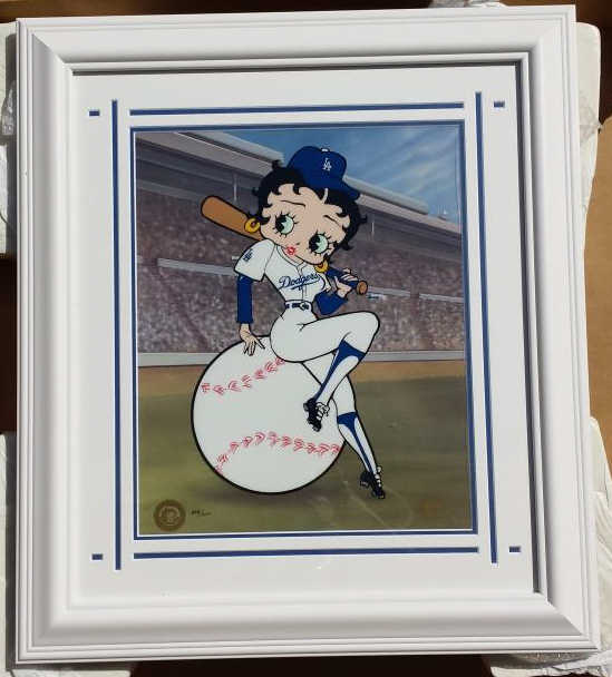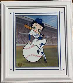 A limited edition Betty Boop "Betty on Deck" Cel. Depicting Betty Boop dressed in Los Angeles Dodgers baseball team uniform. Sericel with color background. From the original rare limited edition of 500...THISIS NOT THE MORE RECENT COMMON EDITION OF 5000! Certified King Features Syndicate, Inc./ Fleischer Studios. M.L.B. Officially Licensed Los Angeles Dodgers Sericel. Copy of certificate of authenticity & appraisalincluded (appraised value $350). Museum quality mat and framing, stored in fitted box (included). Work itself measures 16 9/16'' (42.1cm) high x 13'' (33cm) wide. Frame measures 25" (63.5cm) high x 22" (55.9cm)wide. THIRD PARTY SHIPPING REQUIRED.