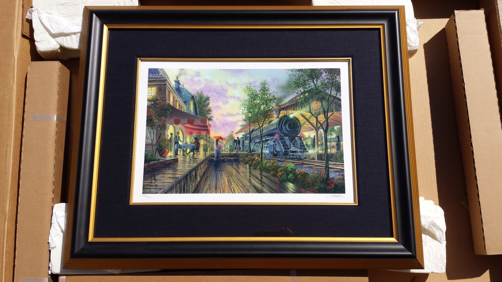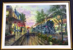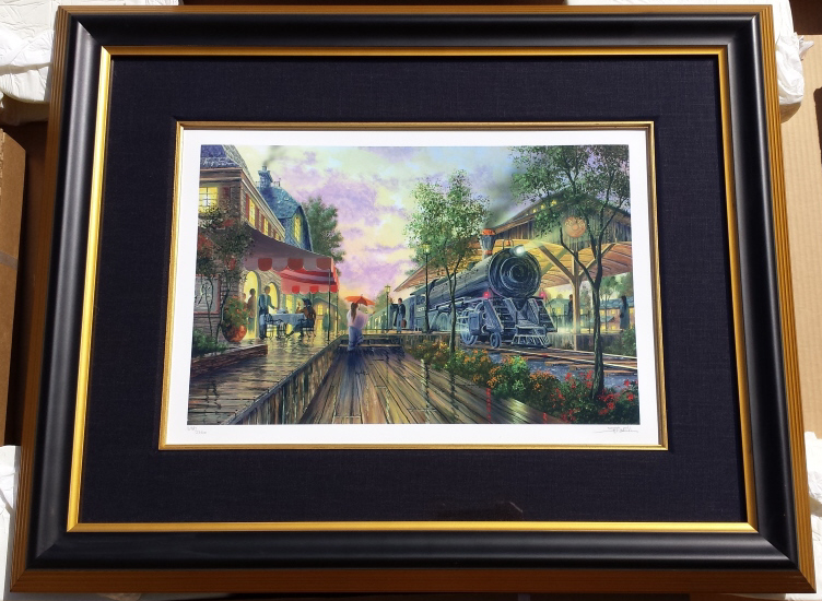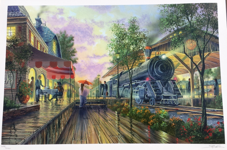 A limited edition Ken Shotwell "Paris Rendezvous" Seriolithograph. Depicting Parisian scene with locomotive train. seriograph/ lithograph in color on paper. Hand signed and numbered in pencil by KenShotwell. From the limited edition of 2250. Copy of certificate of authenticity and appraisal included (appraised value $540). Museum quality mat and framing, stored in fitted box (included). Work itself measures11 1/2'' (29.2cm) high x 17 1/2'' (44.5cm) wide. Frame measures 23 1/4" (59.1cm) high x 29 1/4" (74.3cm) wide. THIRD PARTY SHIPPING REQUIRED.