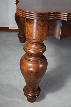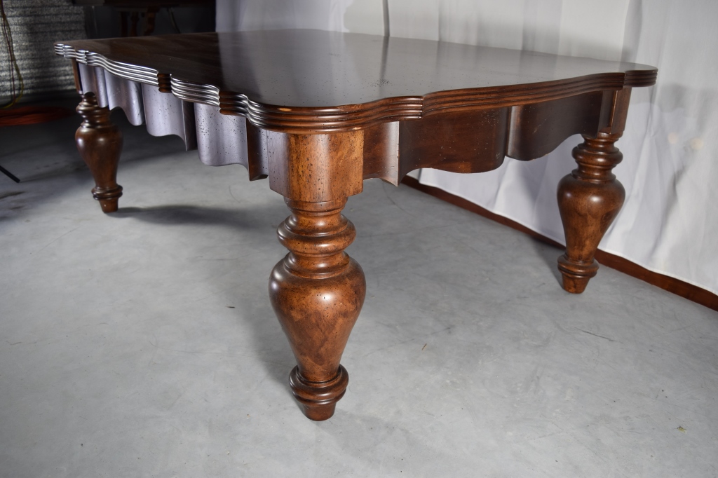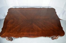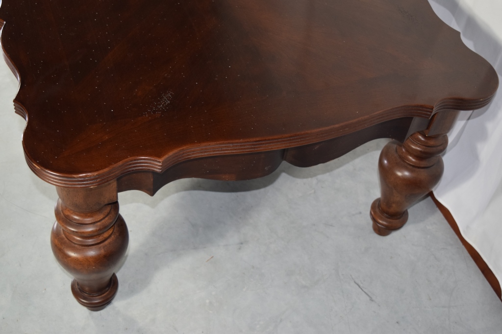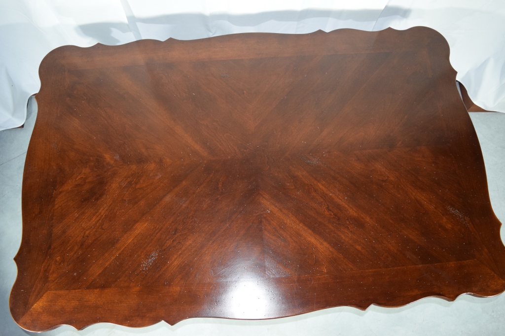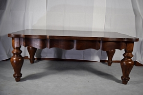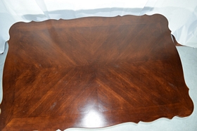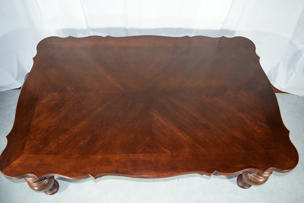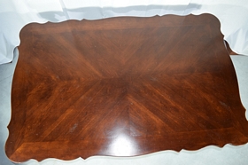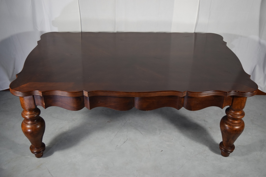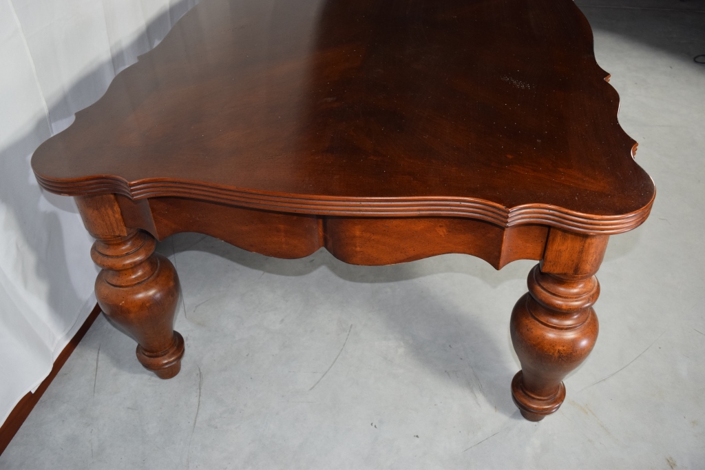 Reeded trim scalloped edges, turned legs. Measures 58" L x 38" W x 22" H.