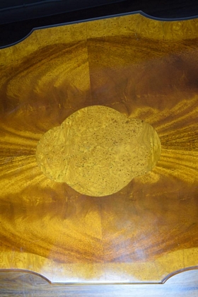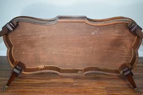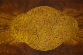 278 - MID CENTURY BURL WOOD INLAY WHEELED TABLE