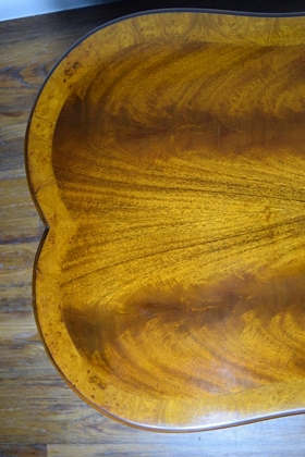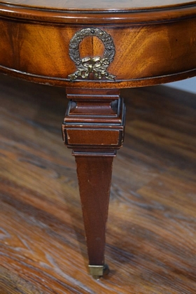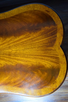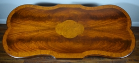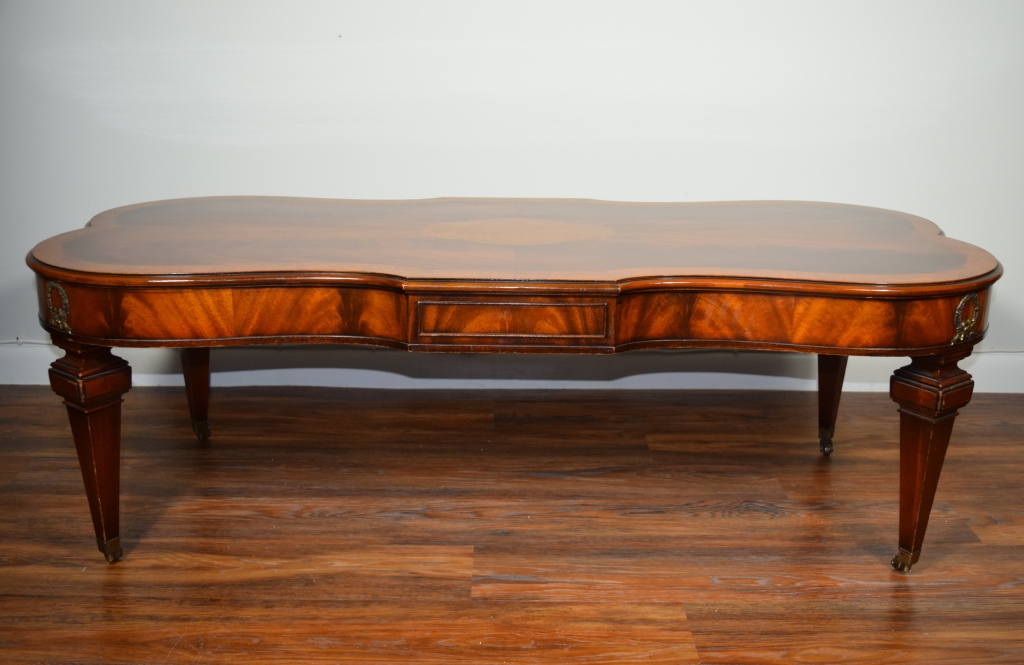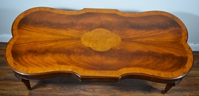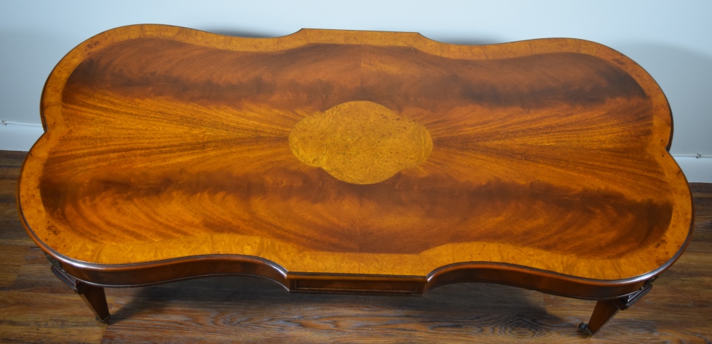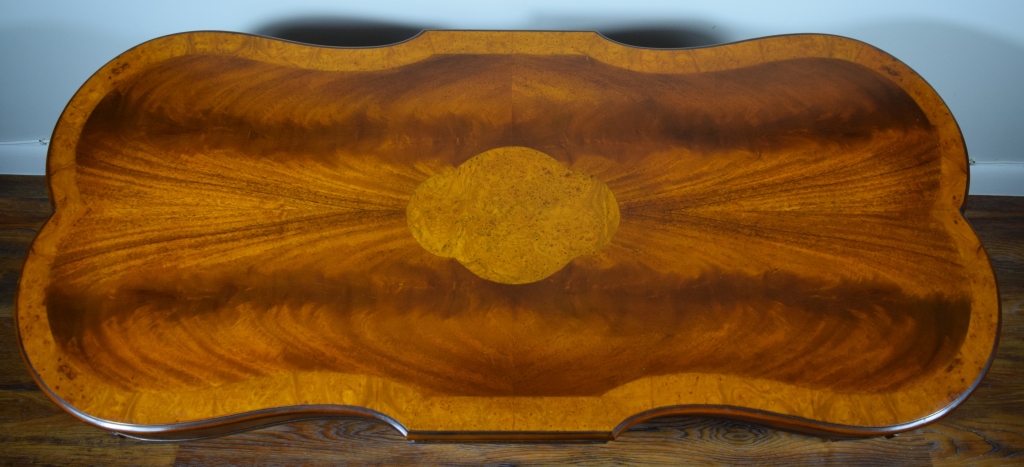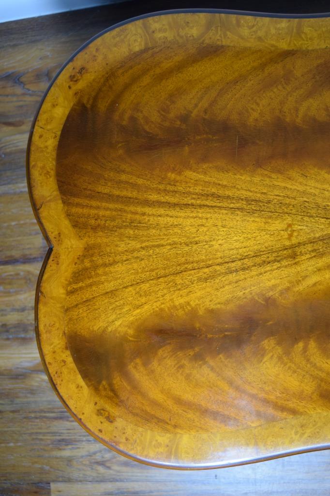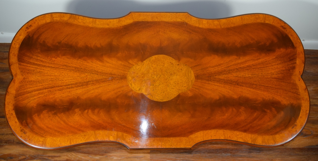 Gorgeous burl wood inlaid table. Elongated shaped table and matching shaped glass top, having burl border and centerpiece. Ormolu wreaths to 4 corners of the table and 4 small wheels to 4 legs. Circa 1930's-60's. Measures 50" L x 23" W x 16 1/2" H.