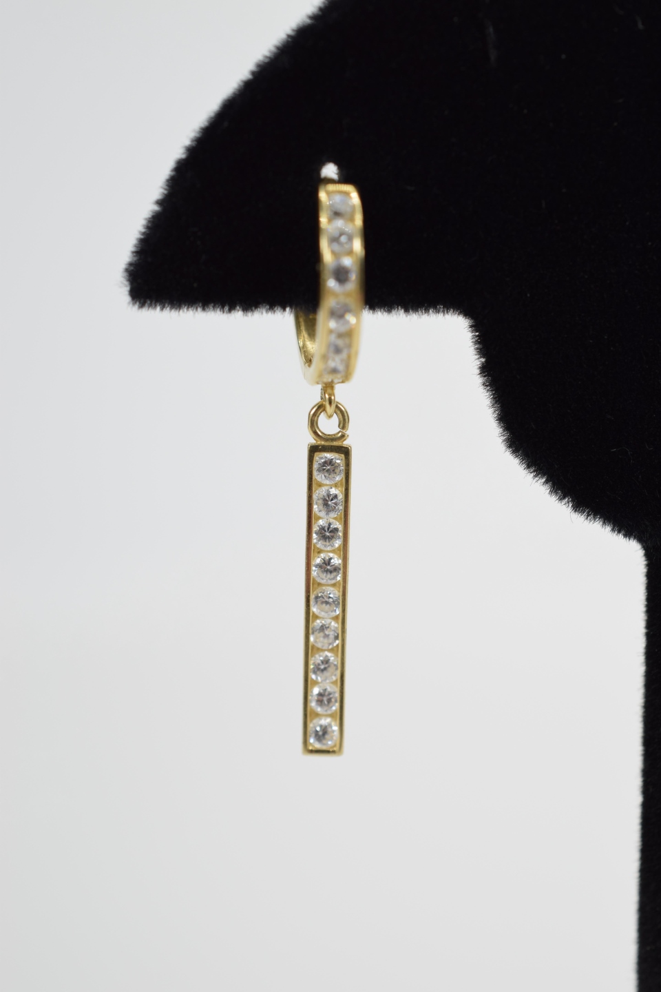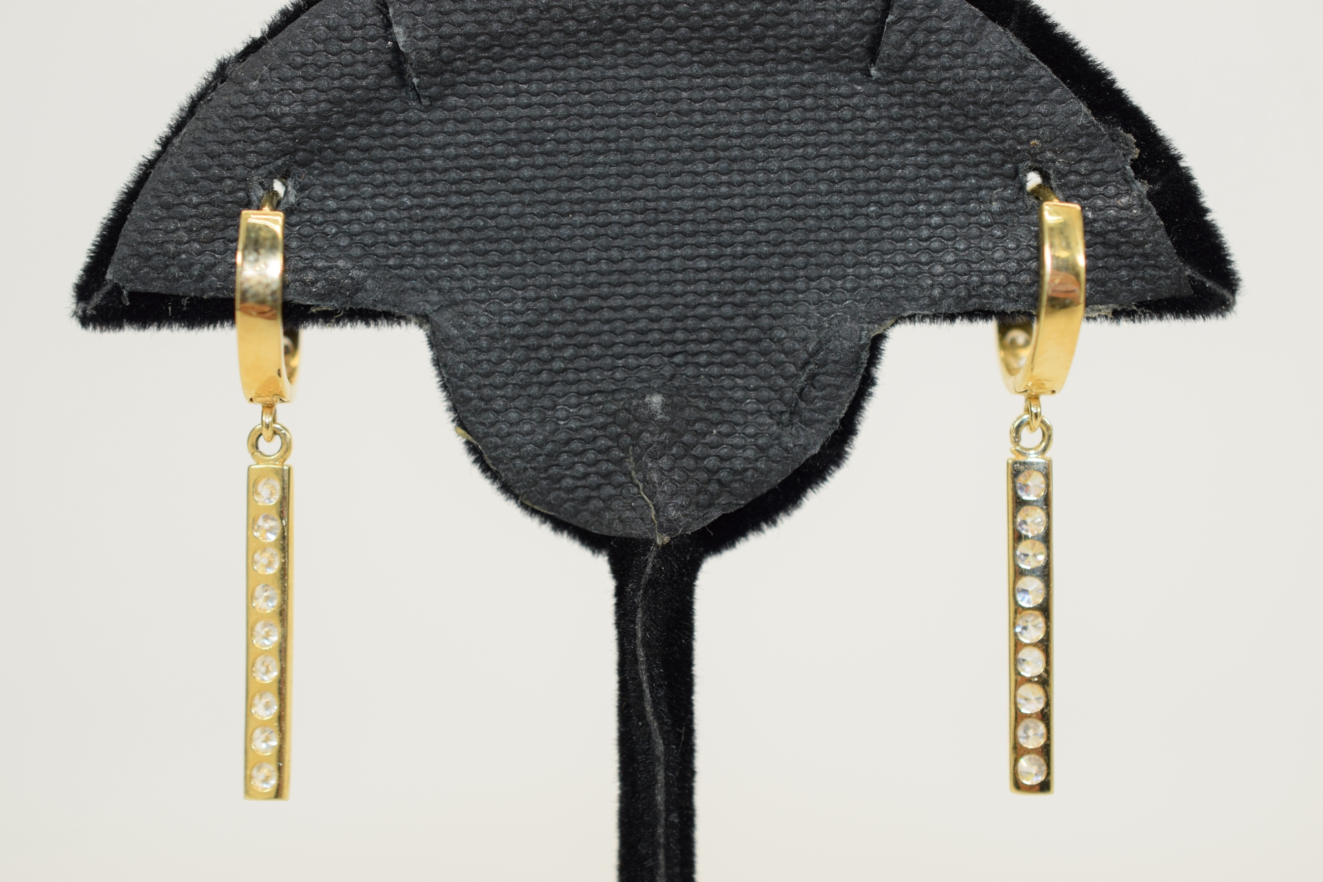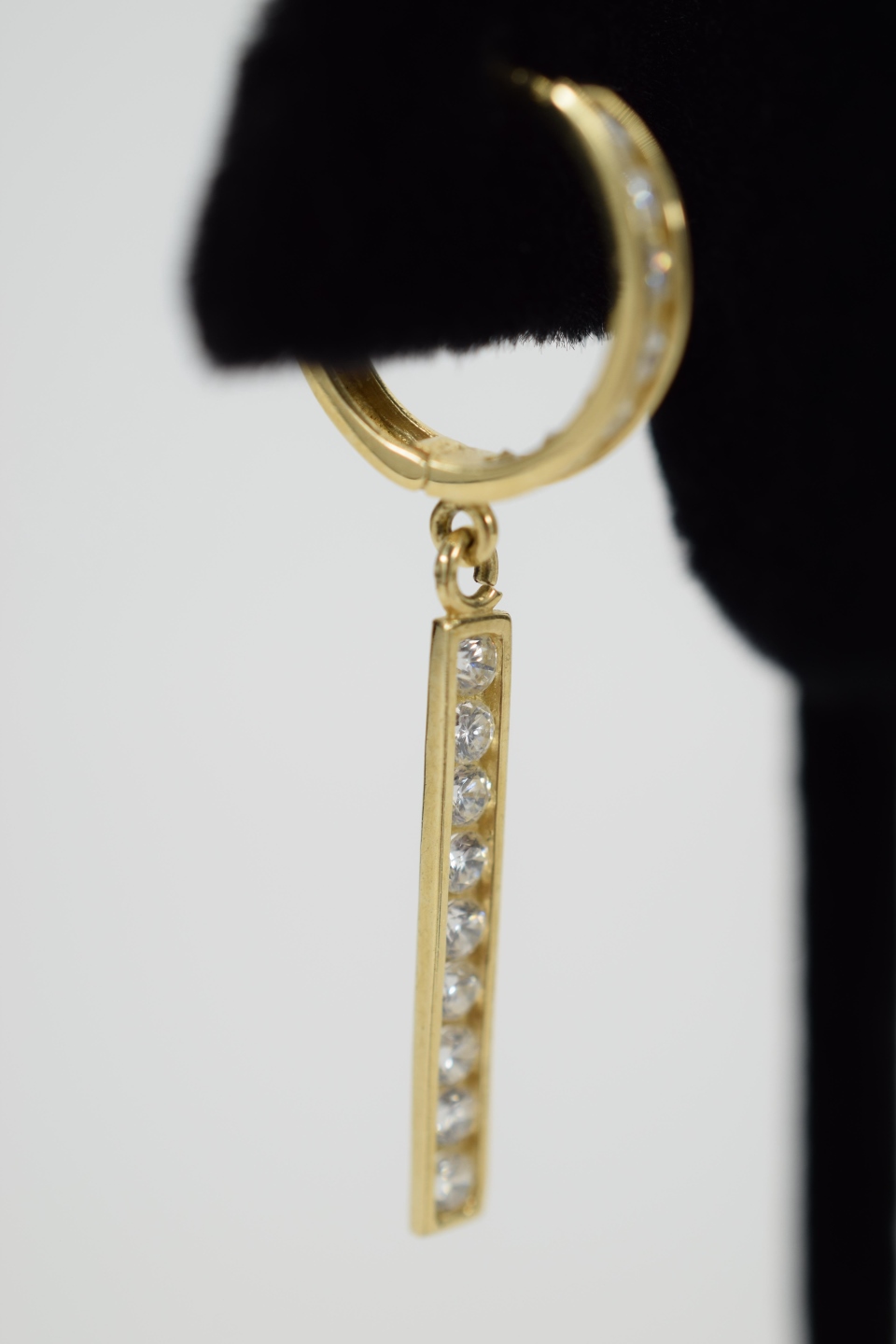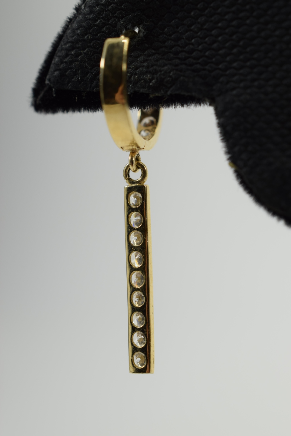 Huggie hoops with a dangling strip of gemstones testing as tourmaline / iolite. Hallmarked 14K. Measures 1-3/8” L. Weighs 2.4g. Total.
