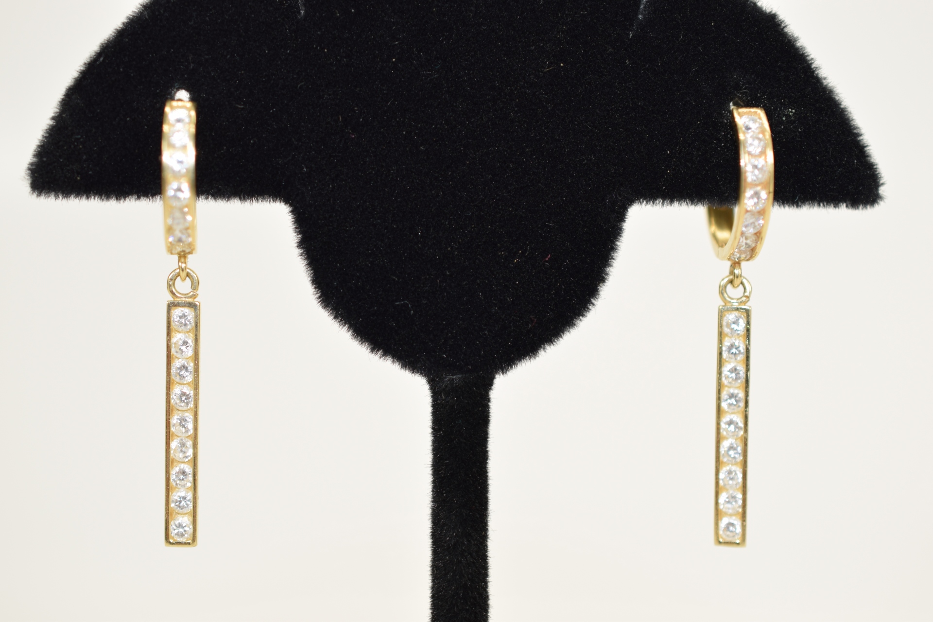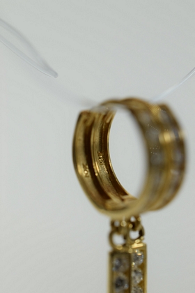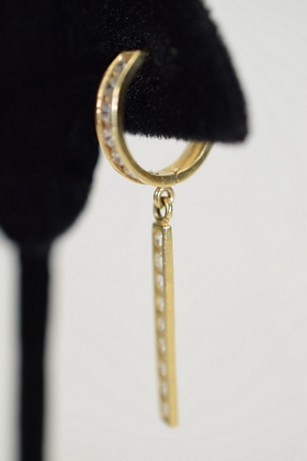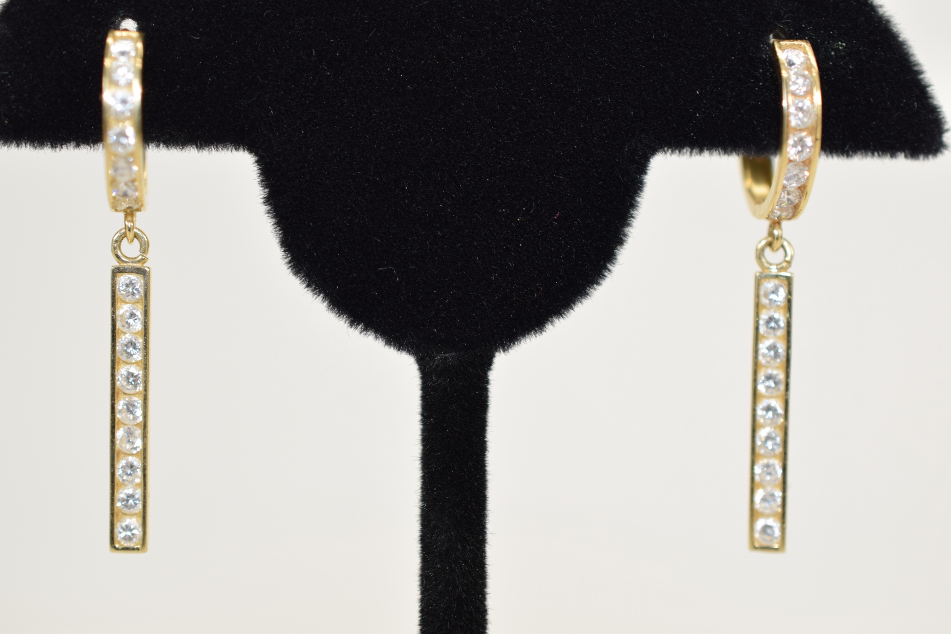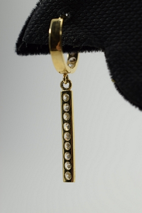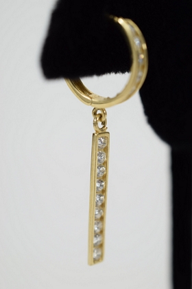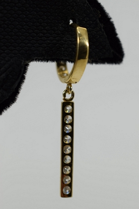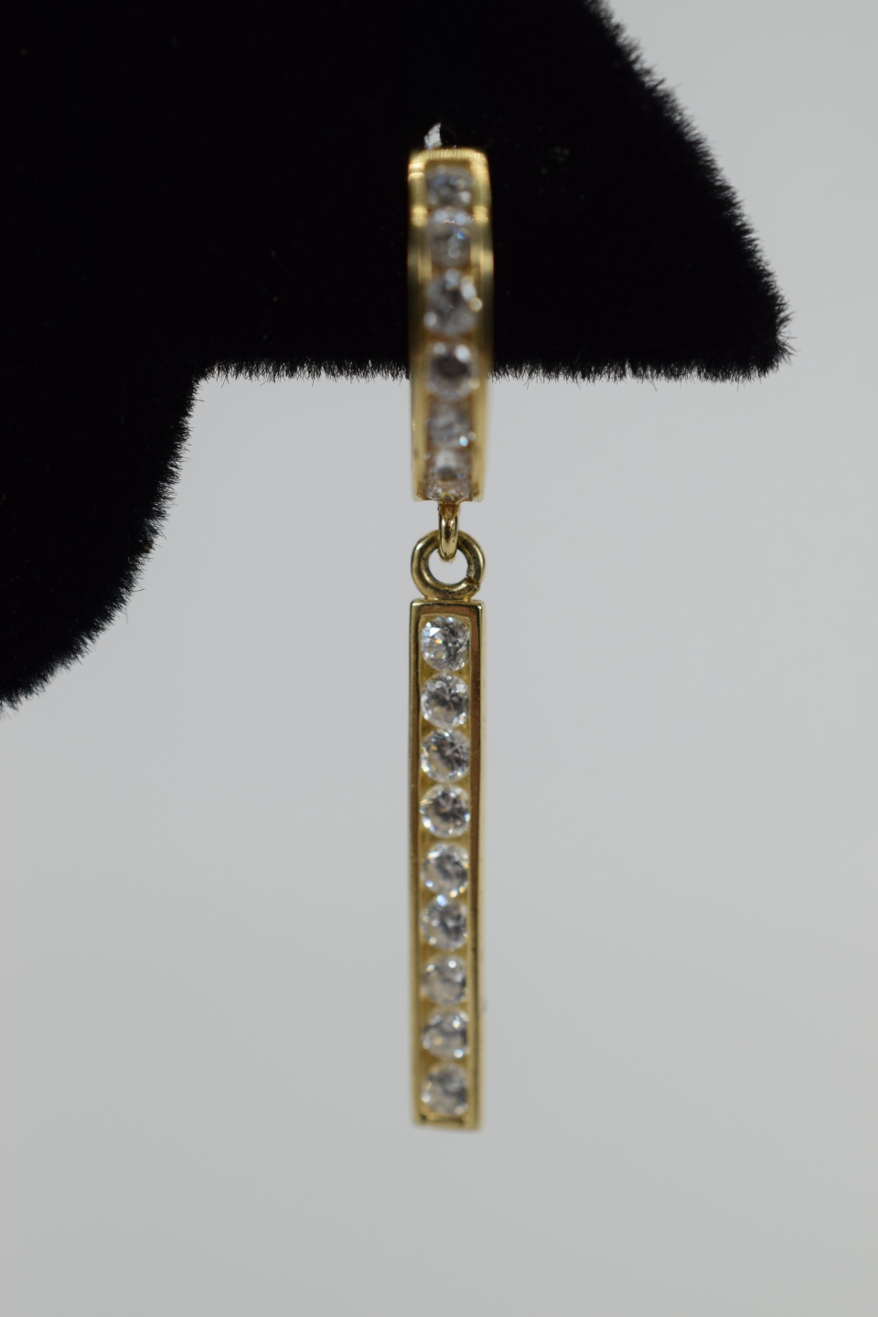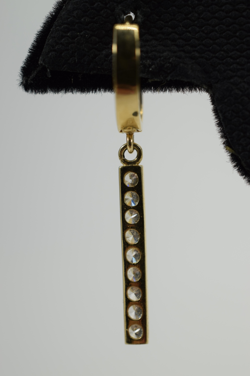 Huggie hoops with a dangling strip of gemstones testing as tourmaline / iolite. Hallmarked 14K. Measures 1-3/8” L. Weighs 2.4g. Total.