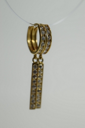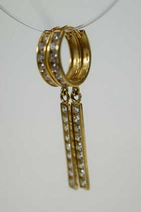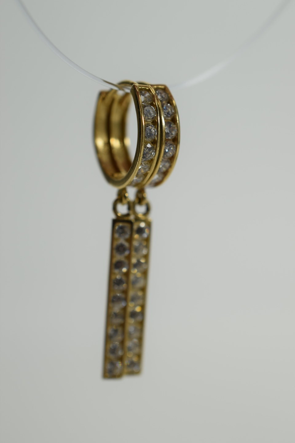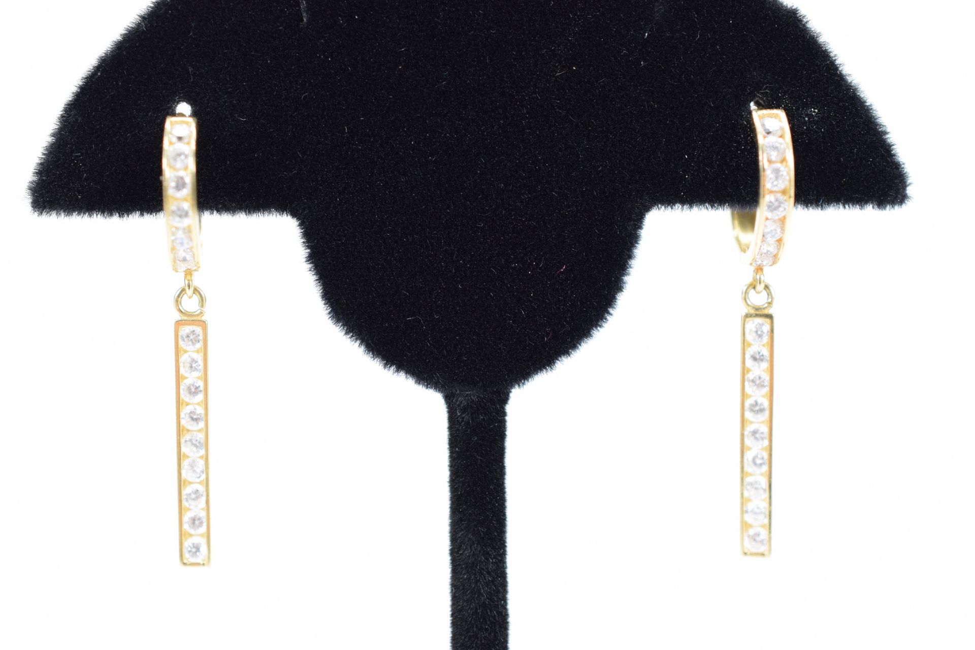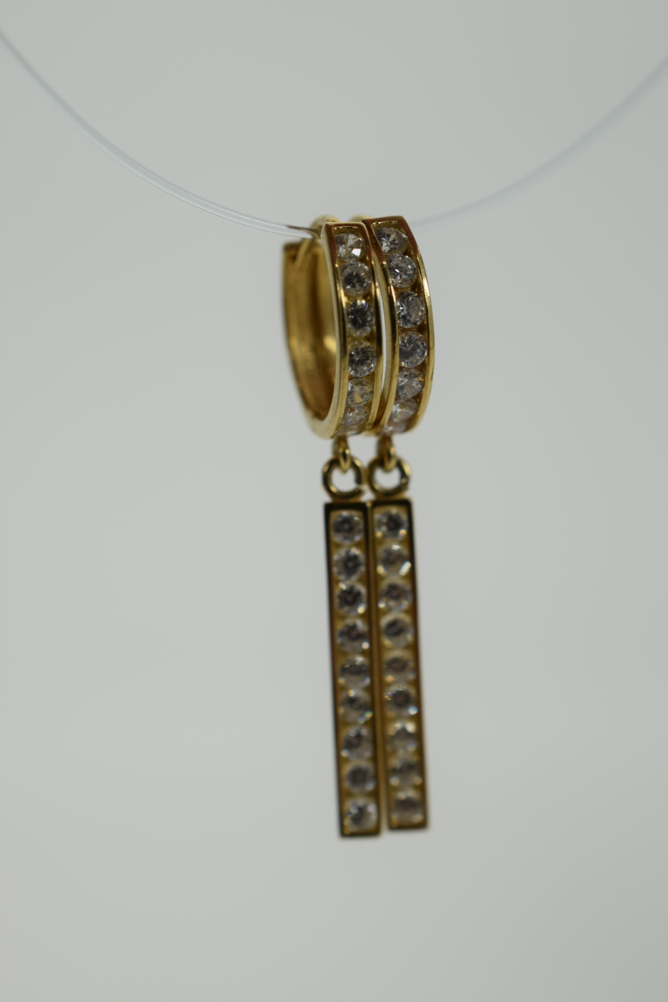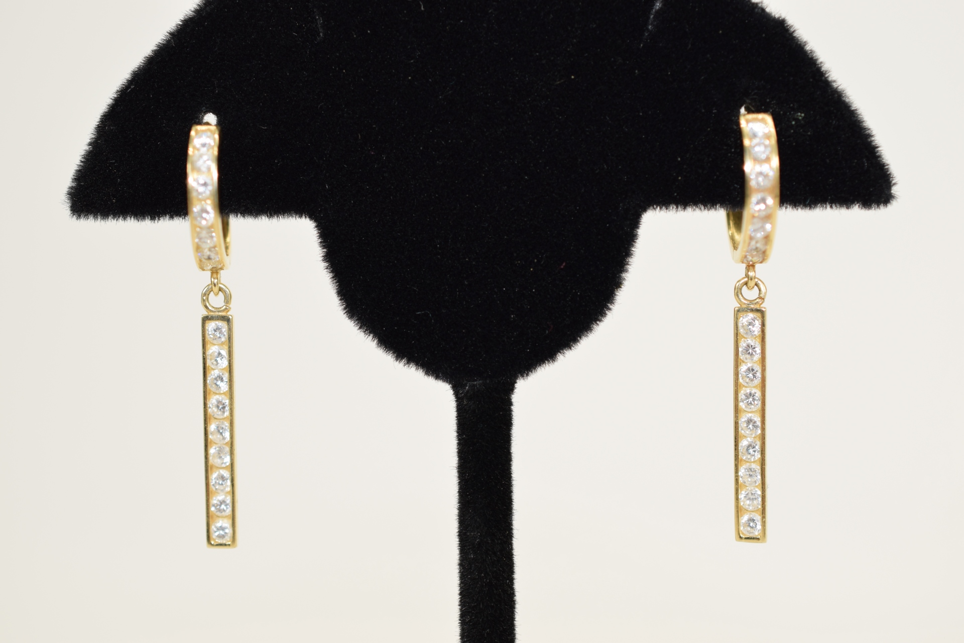Huggie hoops with a dangling strip of gemstones testing as tourmaline / iolite. Hallmarked 14K. Measures 1-3/8” L. Weighs 2.4g. Total.