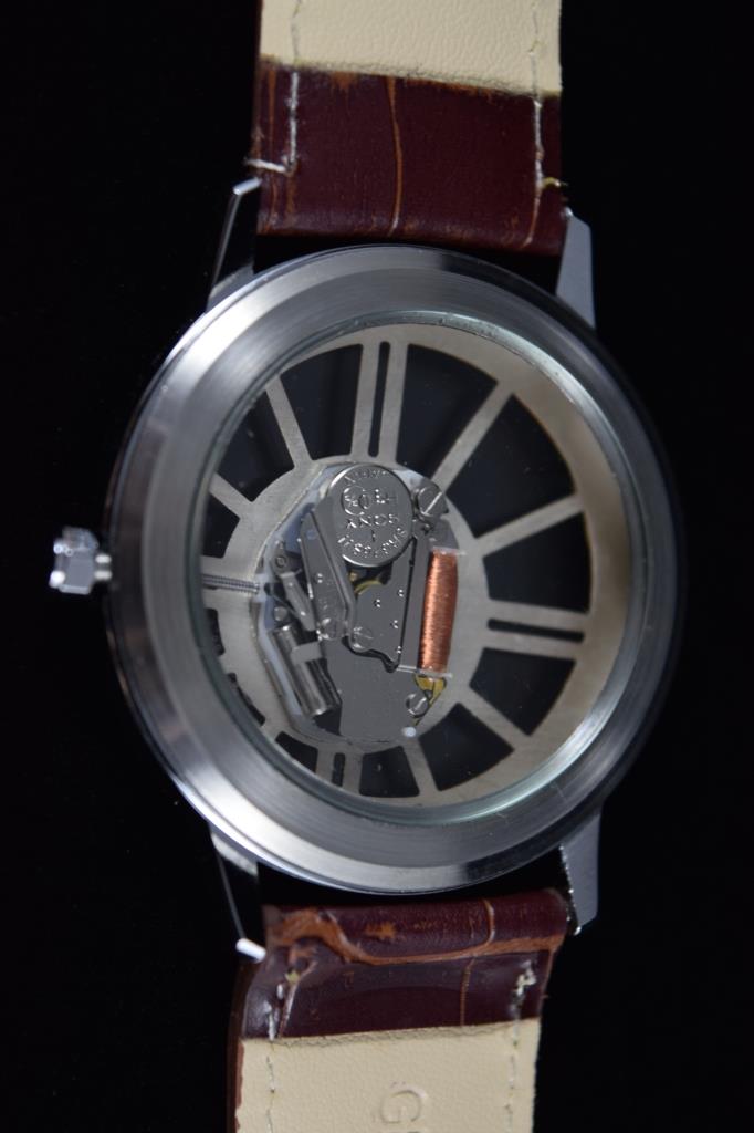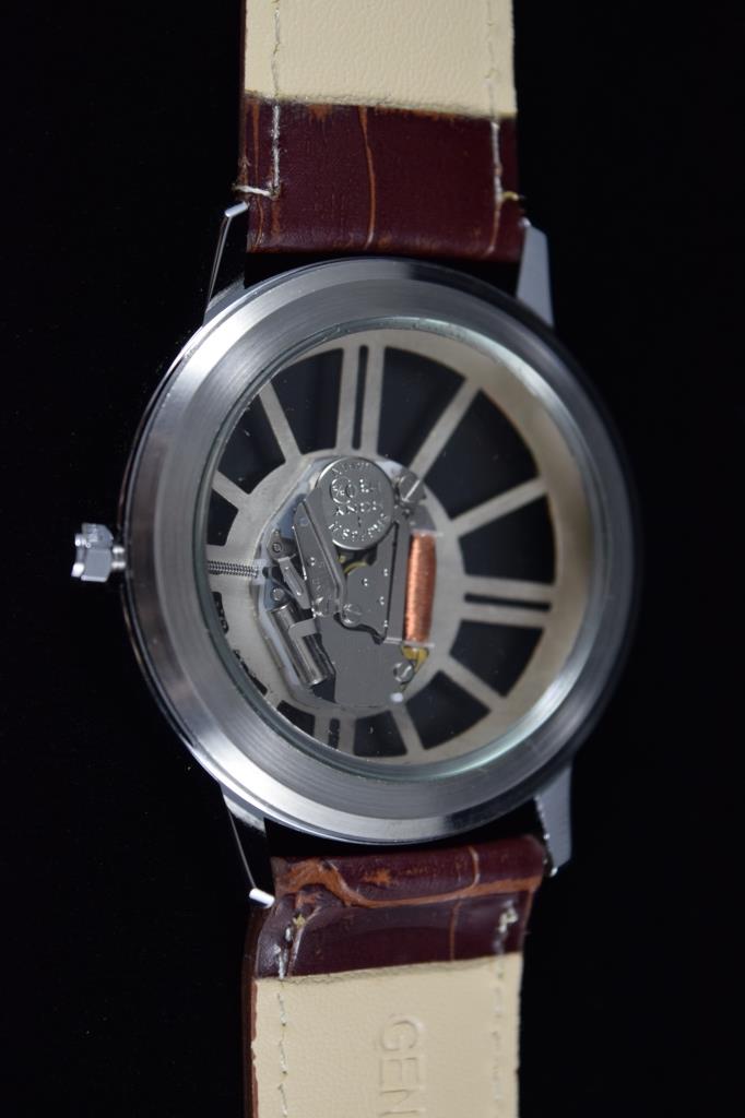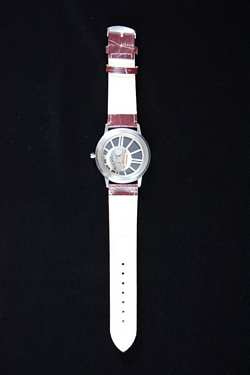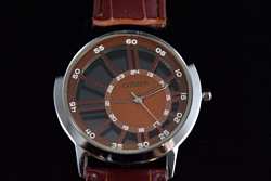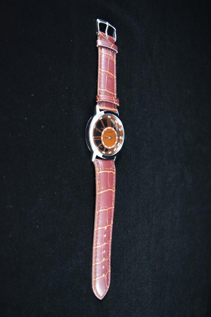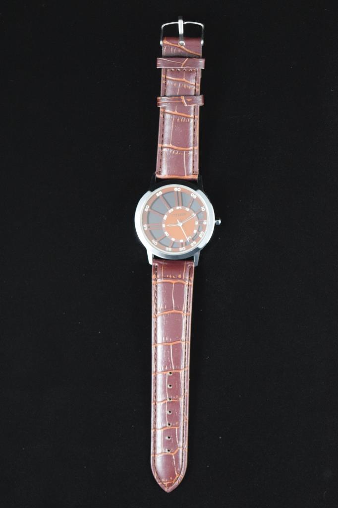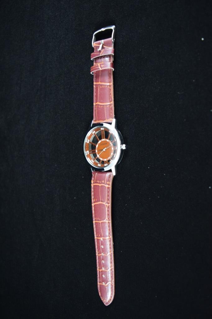 Brown see-through face with Arabic number hour and minute markers. Tested and working. Face measures 1 5/8" (4.1cm). Adjustable from 7" to 9" (17.8cm-22.9cm). Weighs 42.6g. U.S. SHIPPING $15 PLUS INSURANCE