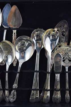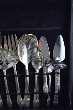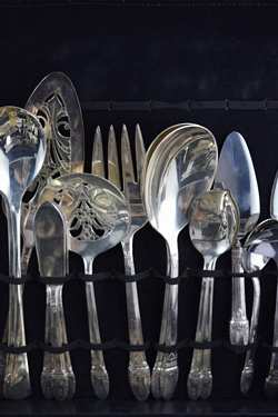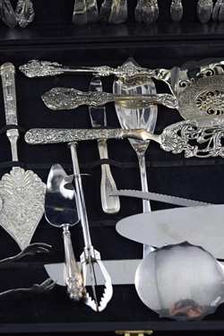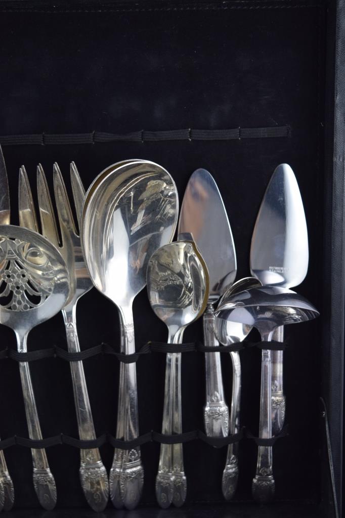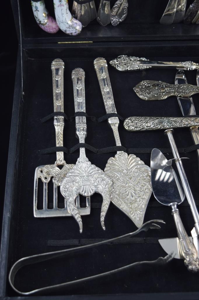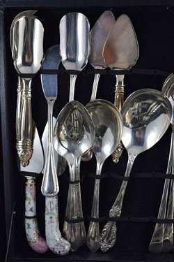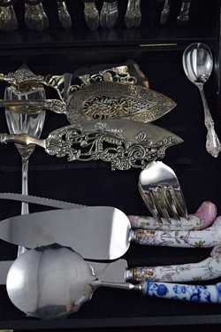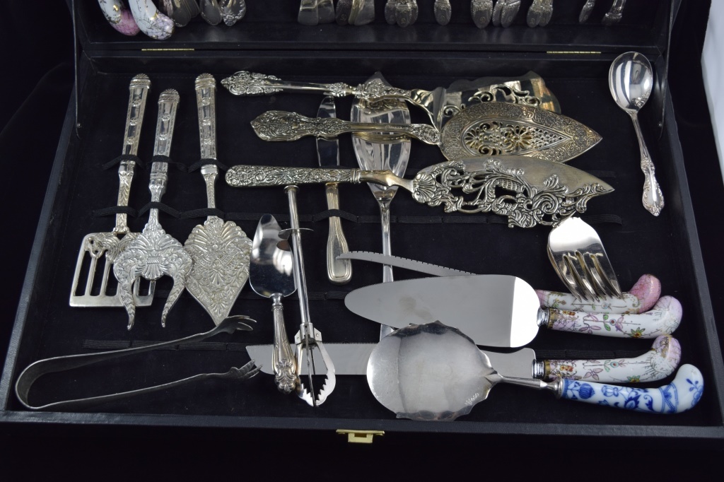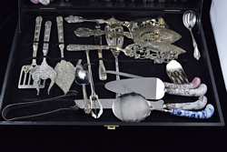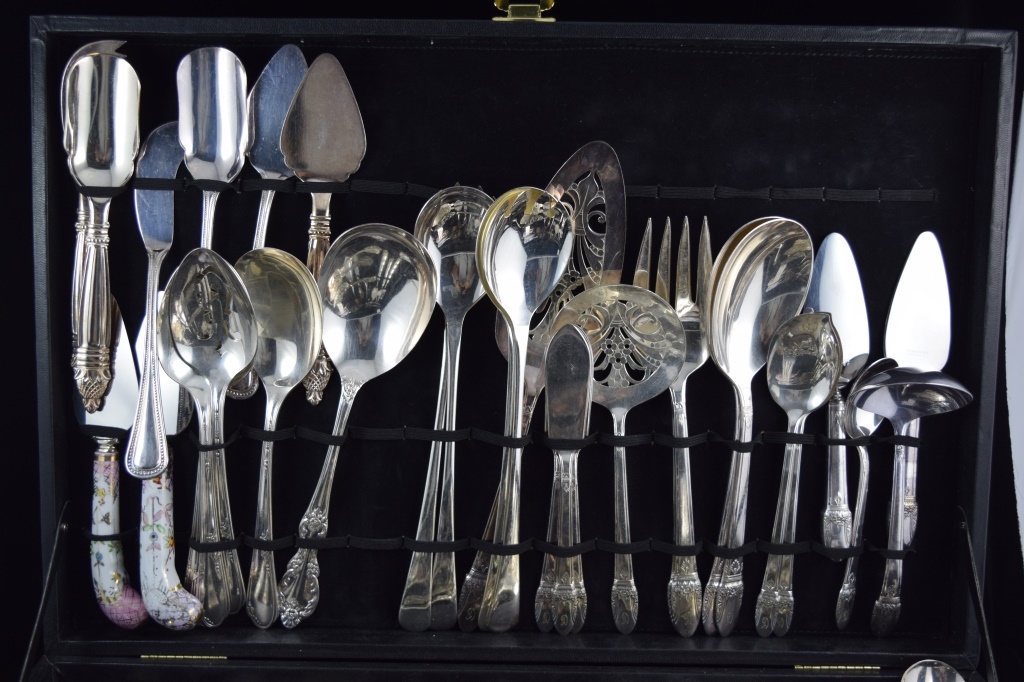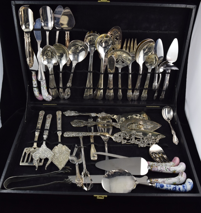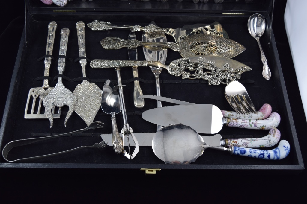 5 Sheffield porcelain handled knives. 1 Blue Onion porcelain handled knife. 3 ornate Godinger serving pieces. 15 Roger Bros pieces. + much more. Case not included.