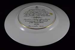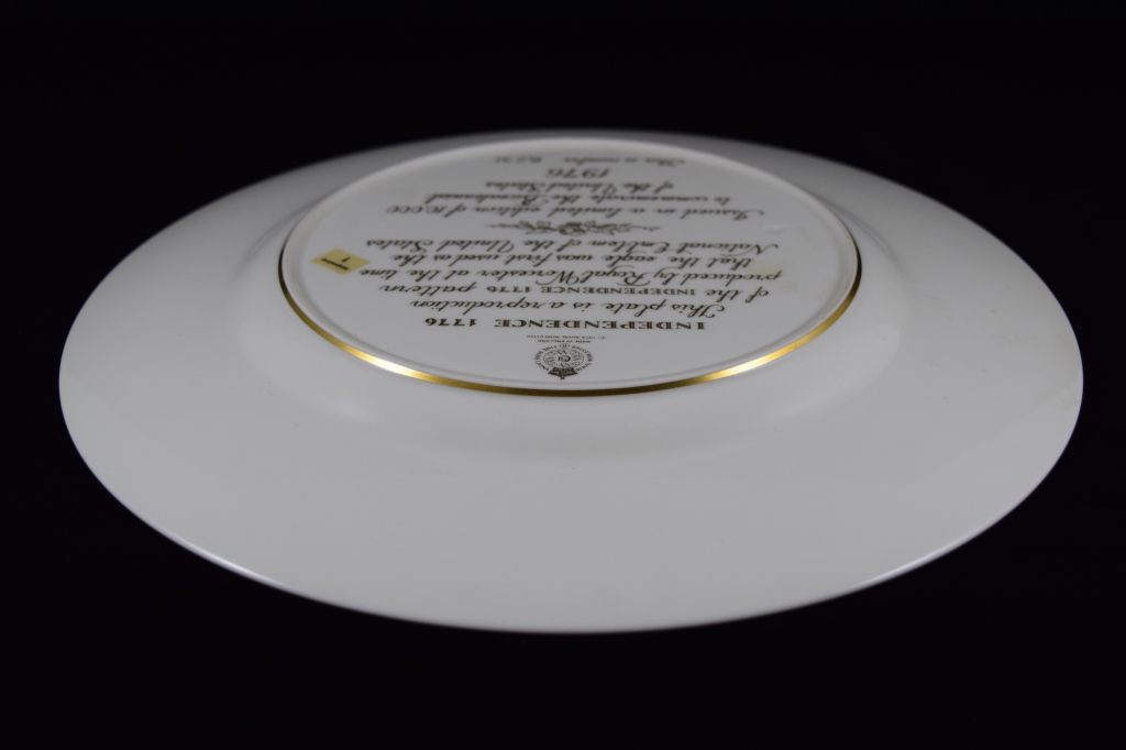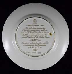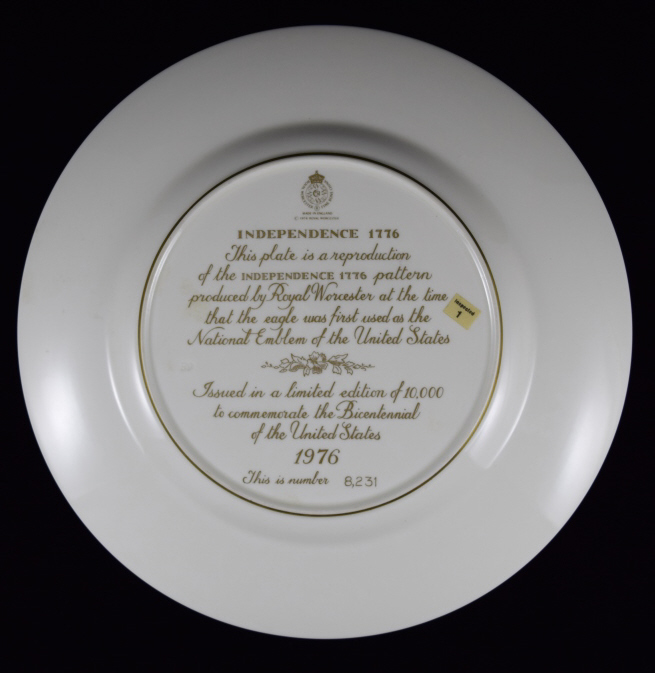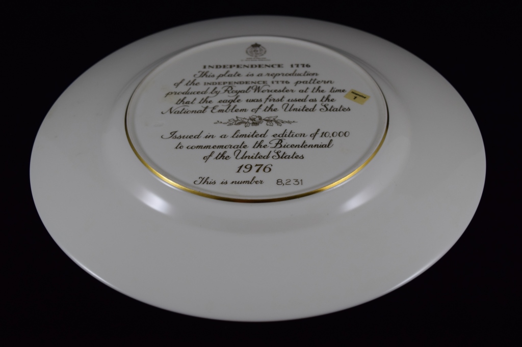 U.S. Independence 1776 plate. This plate is a reproduction of the independence 1776 pattern produced by Royal Worcester at the time that the eagle was first used as the national emblem of the United States. Issuedin a limited edition of 10,000 to commemorate the Bicentennial of the United Stated 1976. This is number 8,231. Measures 10 3/4" (27.3cm) in diameter. Weighs 1lbs., 6oz. THIRD PARTY SHIPPING REQUIRED