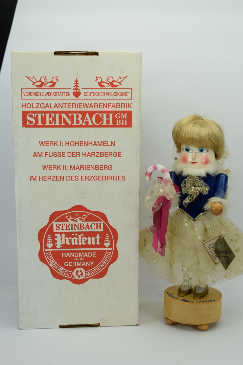 Dance of the Sugar Plum Fairy. Signed. S859. Handcrafted in Germany. New old stock with original hang tag and box. Measures 17” H. Weighs approx. 4lbs. (in box).