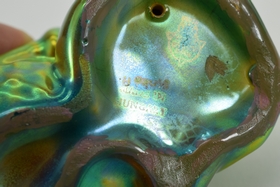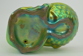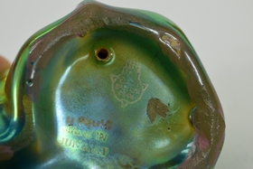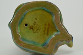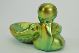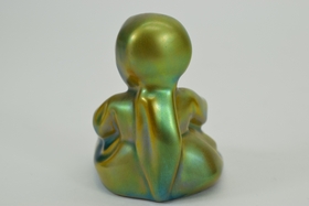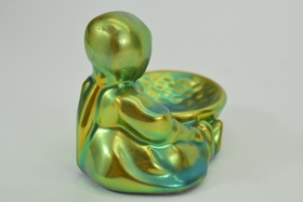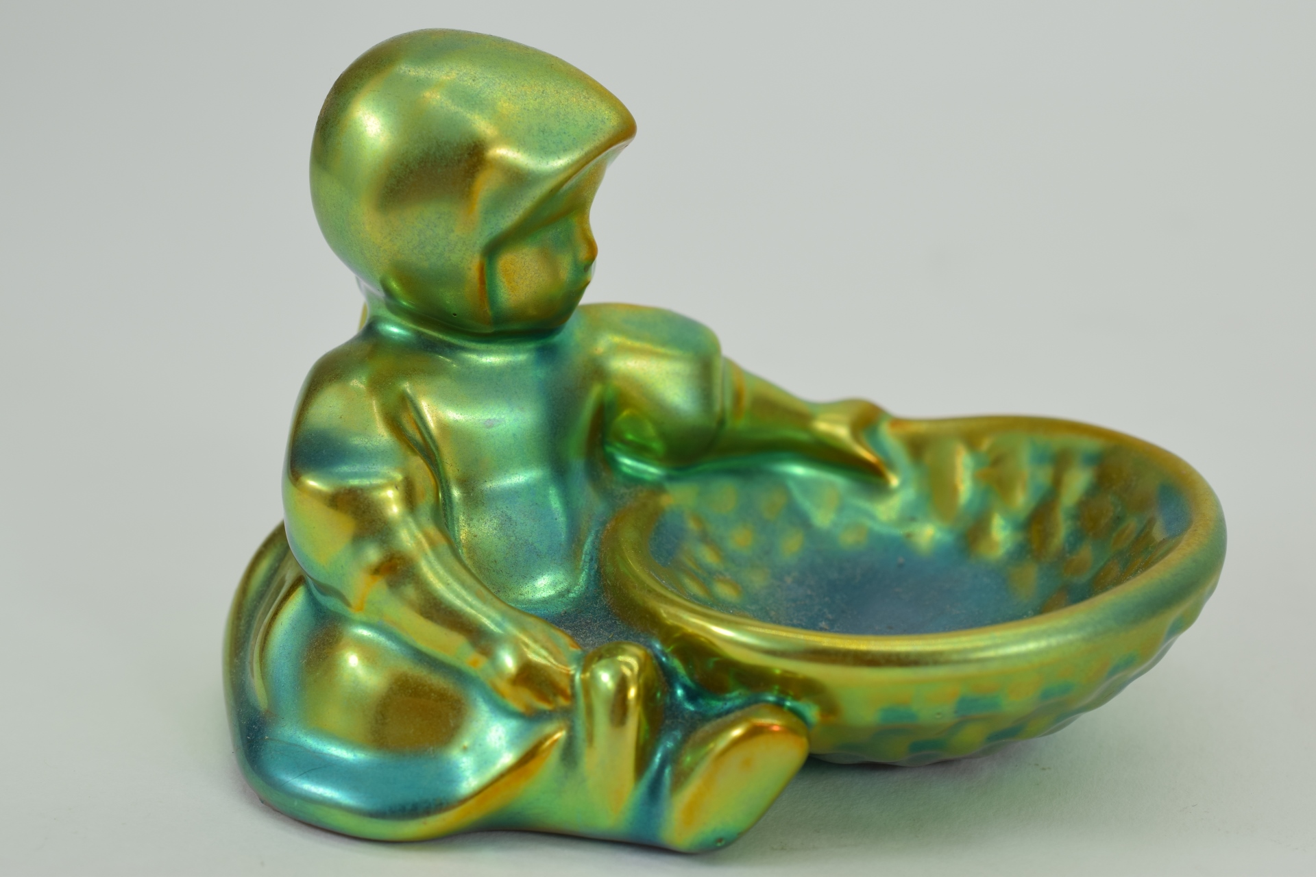 Iridescent eosin porcelain child, one with dish. Both measures approx. 3” H. One with bowl 4-1/4” W x 2-3/4” D. Weighs approx. 7.5oz total.