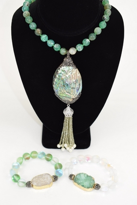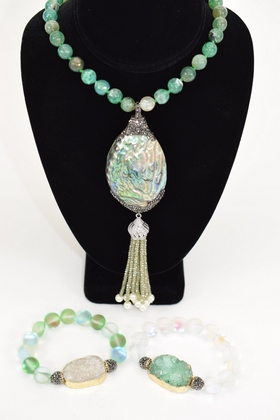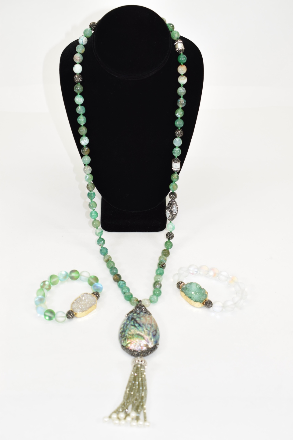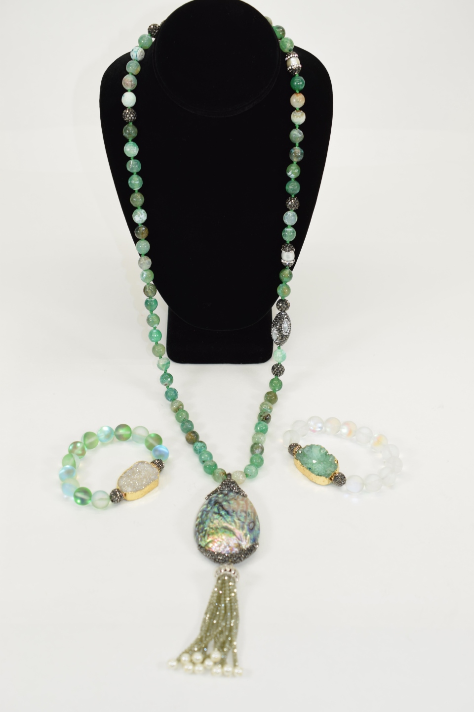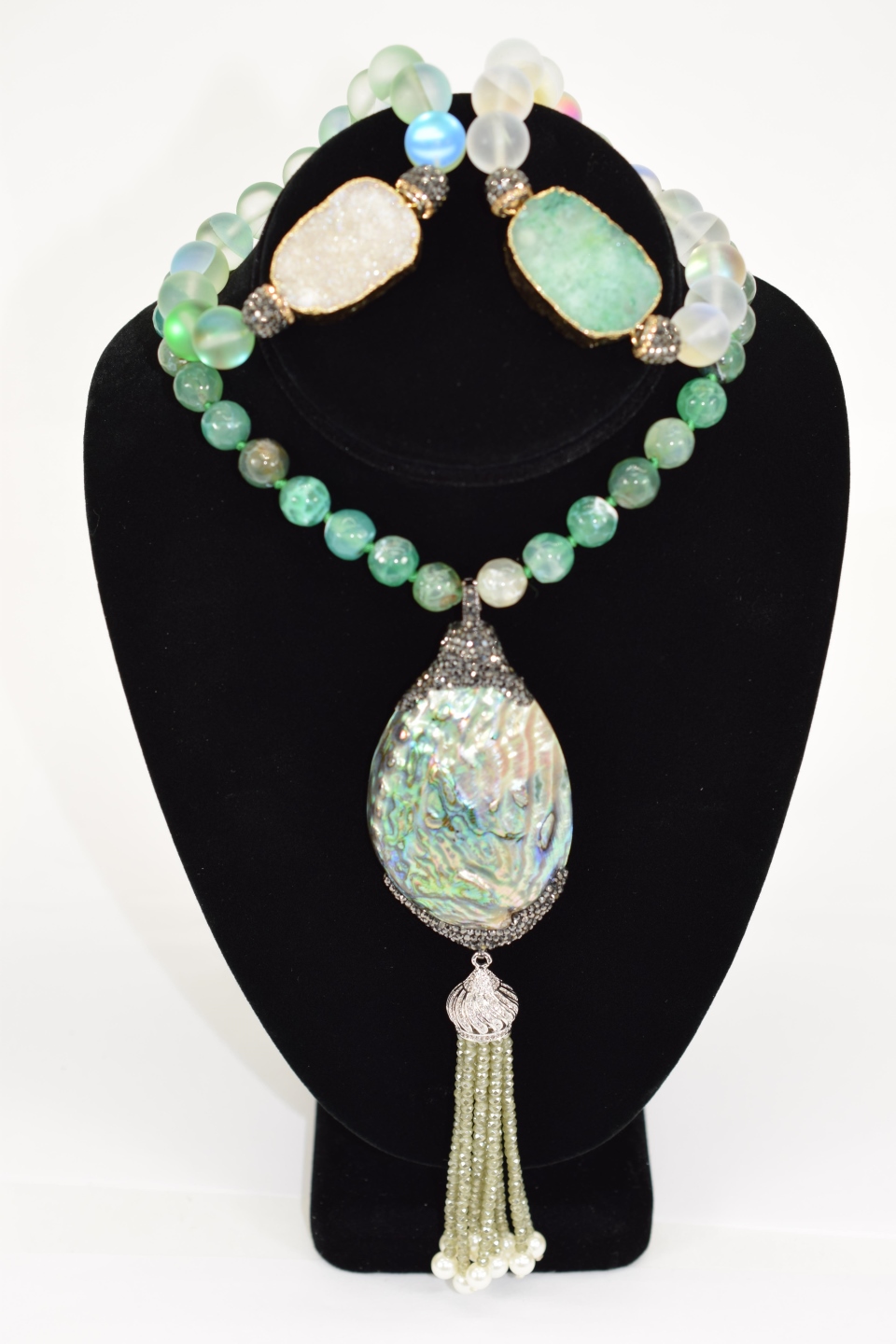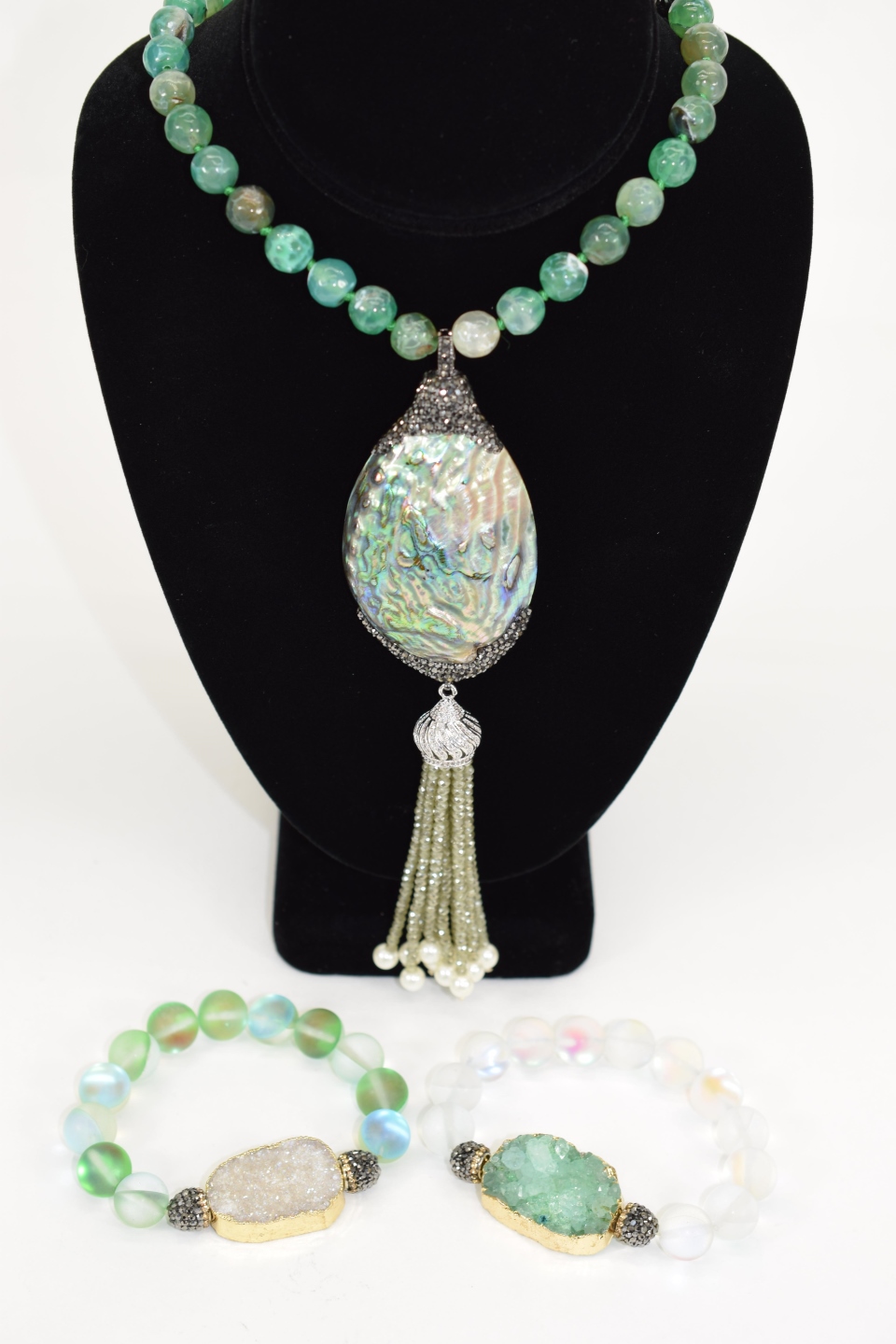 Green semiprecious stone necklace with abalone shell and rhinestone encrusted open-able pendant with dangling shimmery tassels. Included with 2 druzy geode iridescent beaded bracelets. Necklace measures 32” L (plus 6-3/4” L pendant). Bracelets approx. 7” L (not stretched). Weighs approx. 8oz. Total.